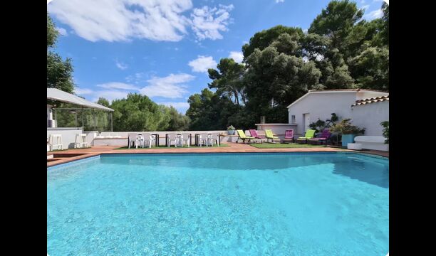 La piscine privée, d’environ 10 × 5 mètres, est entièrement clôturée, ce qui la rend adaptée aux familles avec enfants. Autour de la piscine, l’espace ne manque pas pour se relaxer, prendre le soleil ou profiter d’un après-midi au calme.