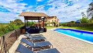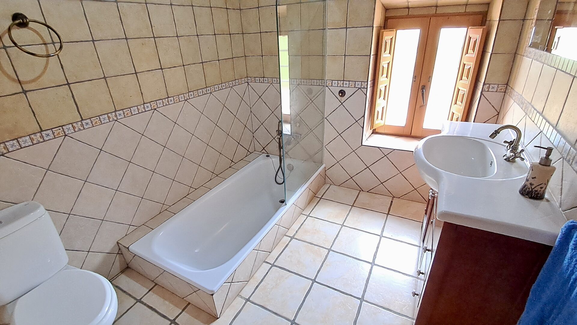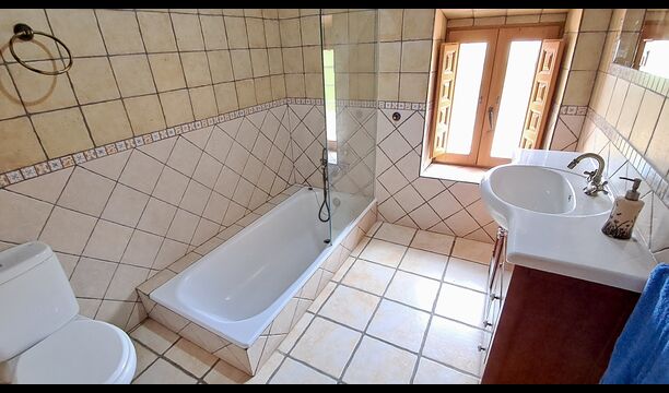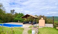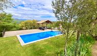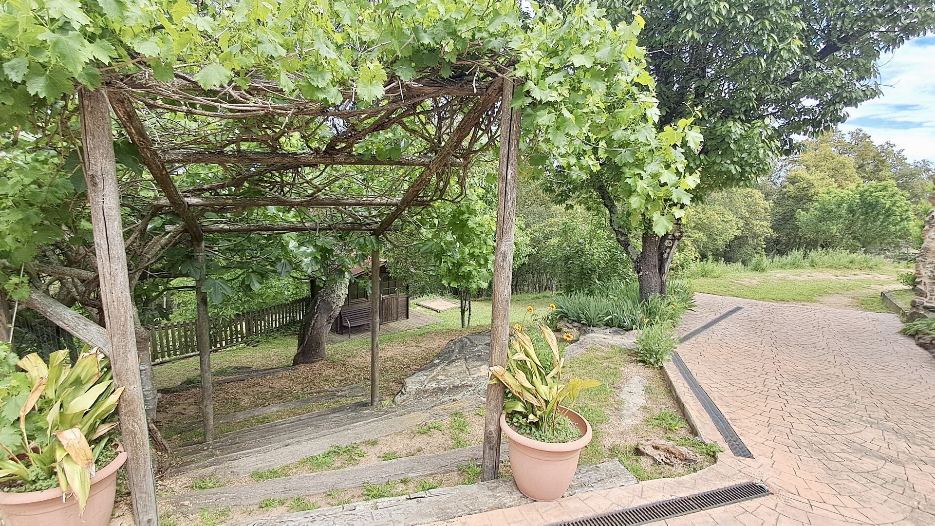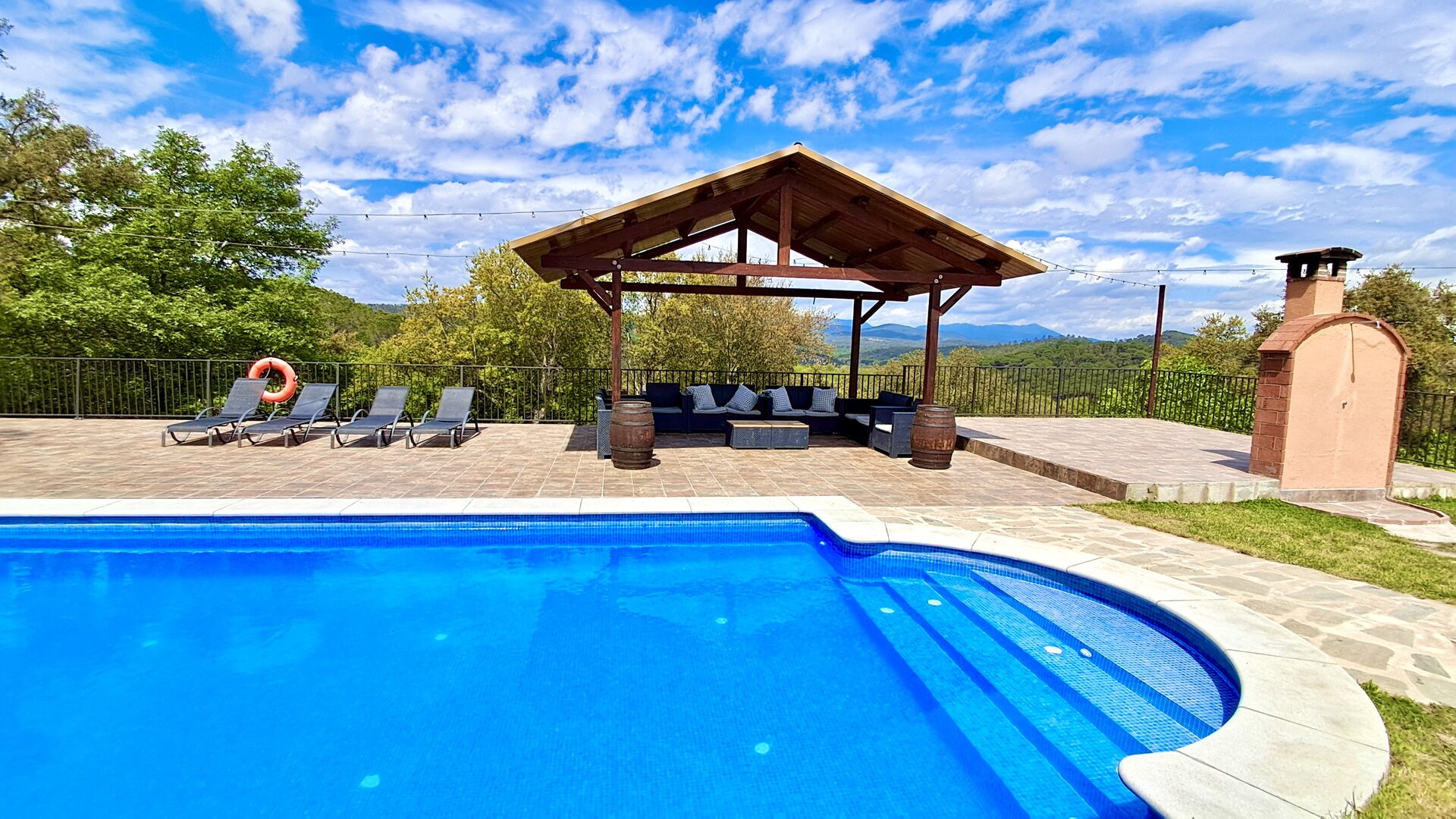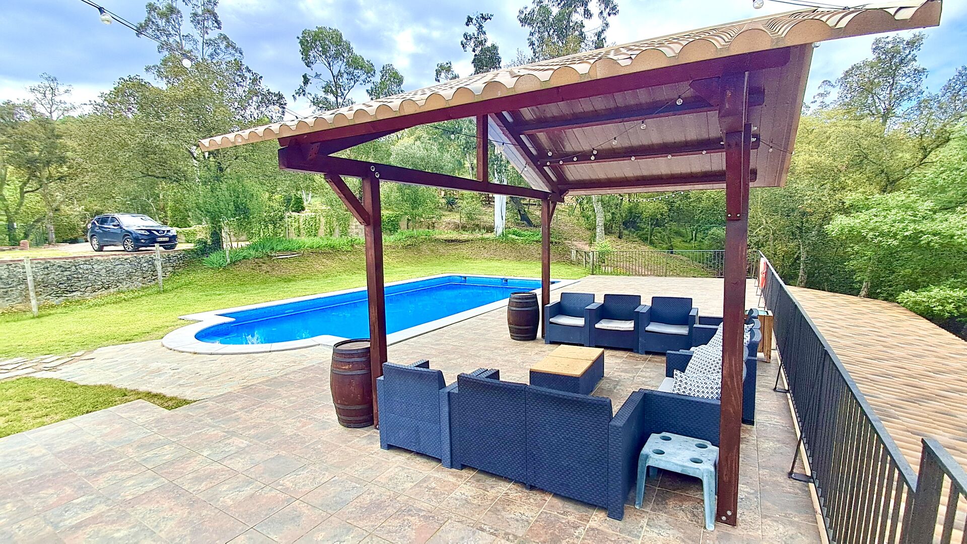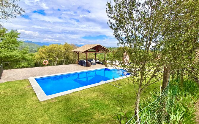 The garden has a size of 11,000 m2 - this is fully fenced so you can let the children play freely on the property. The pool, which is self-cleaning, is also large and has a size of 55 m2, and the pool area is wonderful: Since the house lies on top of a hill, there is a great view over hilly countryside that you can enjoy from the many sun loungers. There is also a small cover, which you can find shade under when the sun is high in the sky.