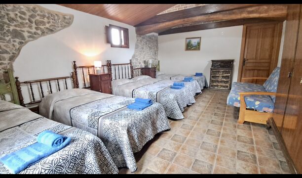 There are a total of two double rooms, three triple rooms and a quadruple room. In addition, there is sleeping accommodation for six additional guests (against supplement). There are five bathrooms in the house.