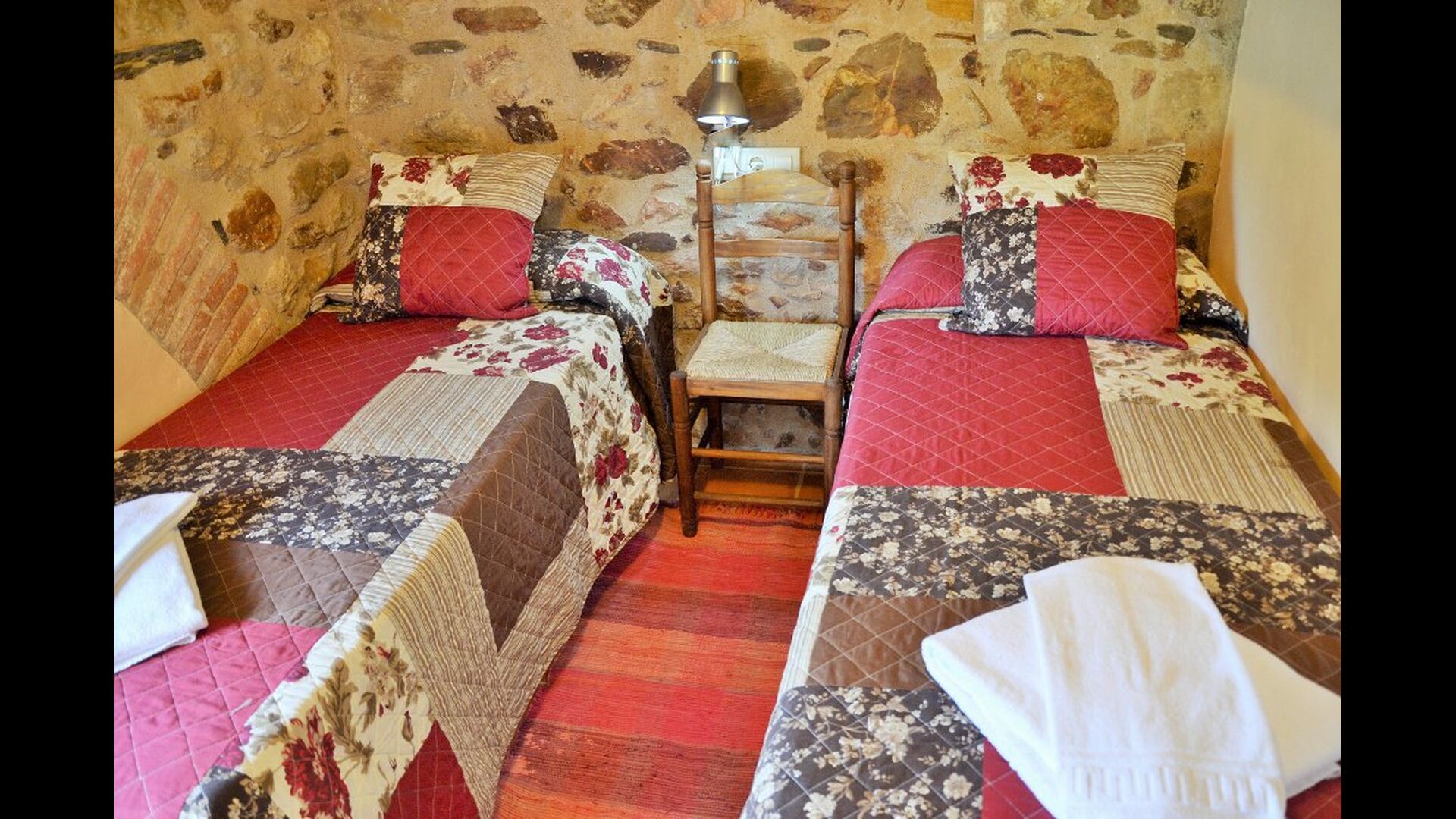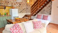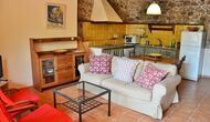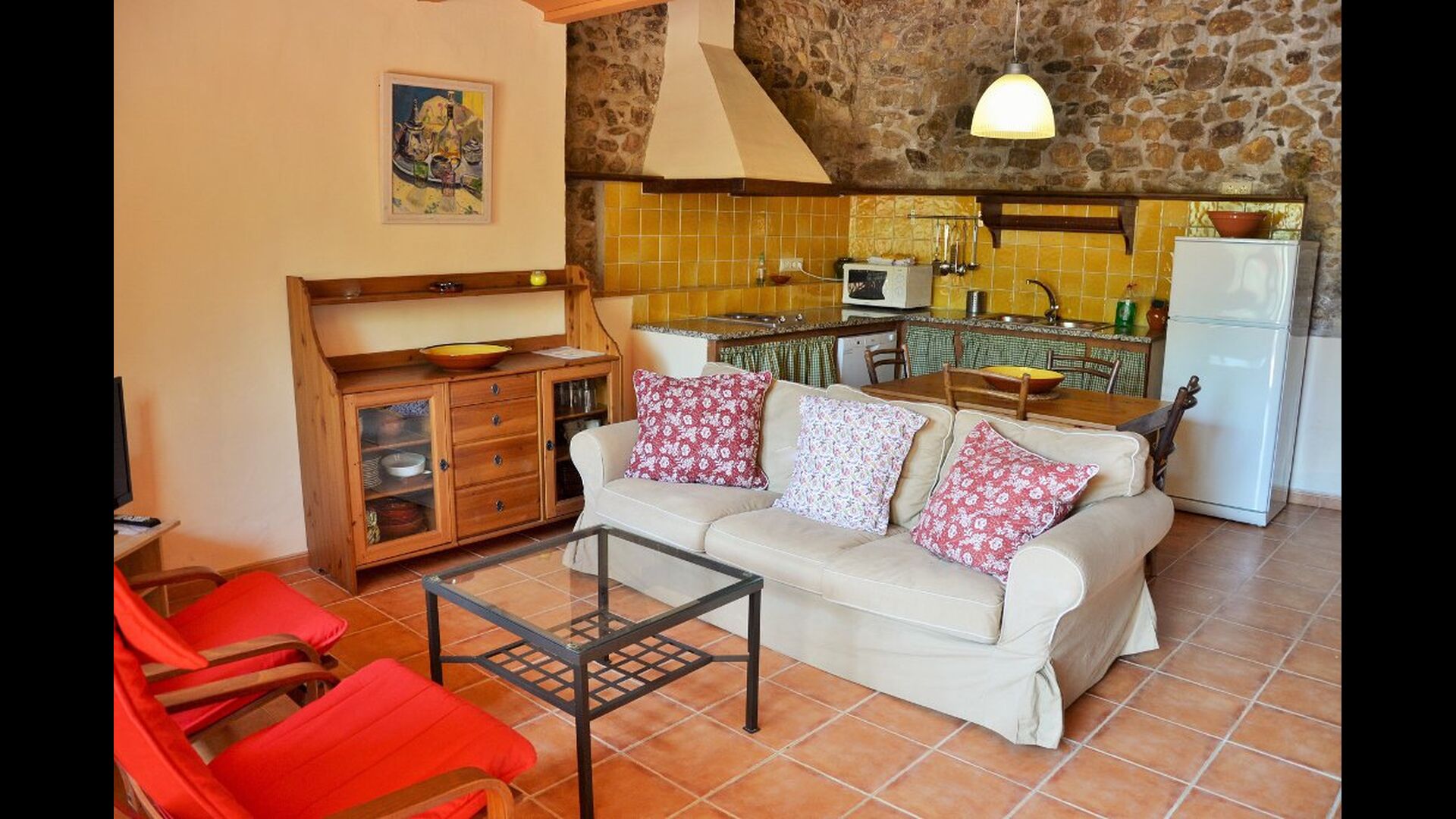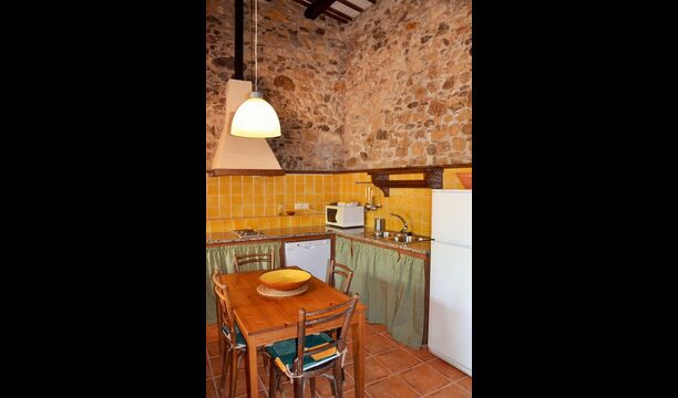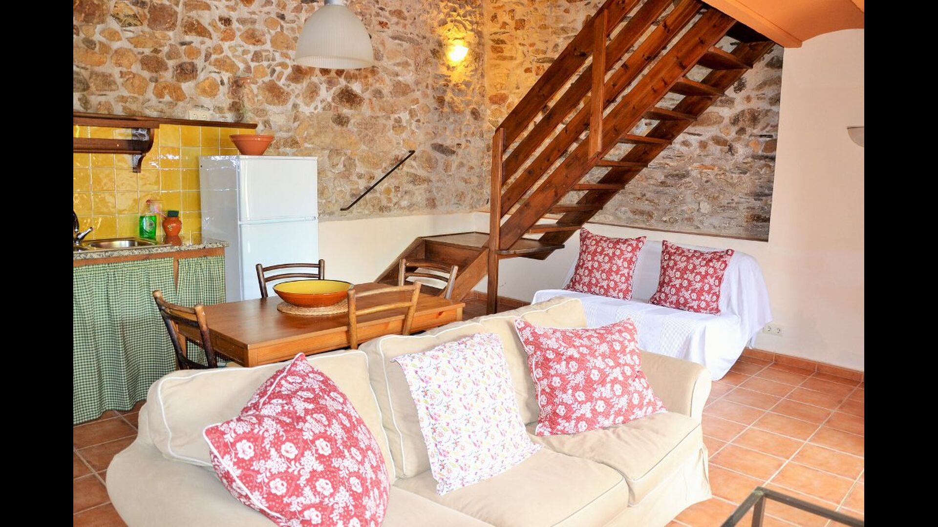 Le rez-de-chaussée comprend une salle commune avec un coin canapé avec télévision, une table à manger et une cuisine bien équipée. La plupart des murs sont en pierre et avec des poutres au plafond, ce qui donne une bonne impression du style typiquement catalan.