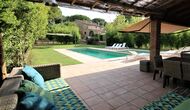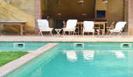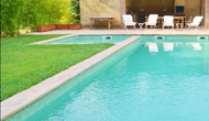 Espace piscine avec terrasse couverte, réfrigérateur, toilettes, eau courante, barbecue, etc.
