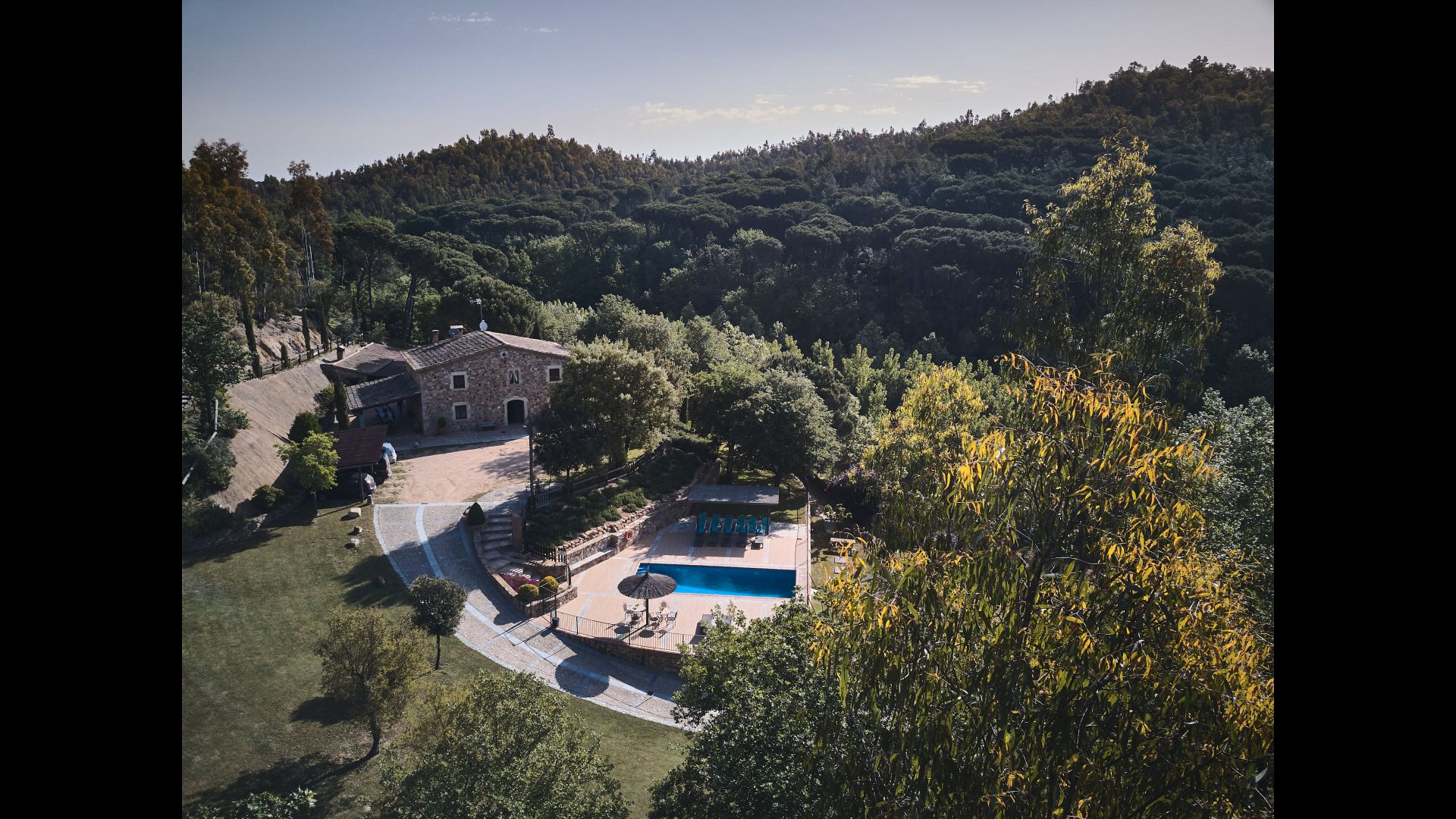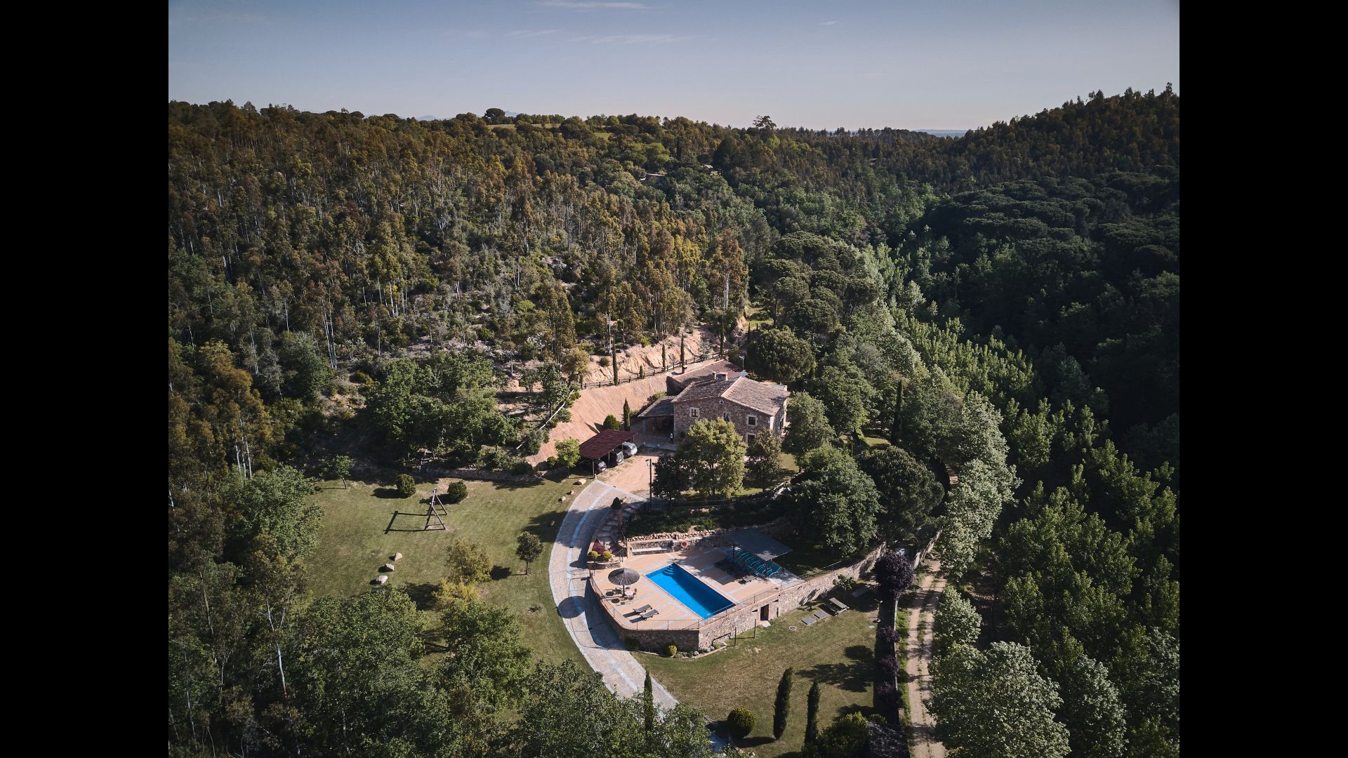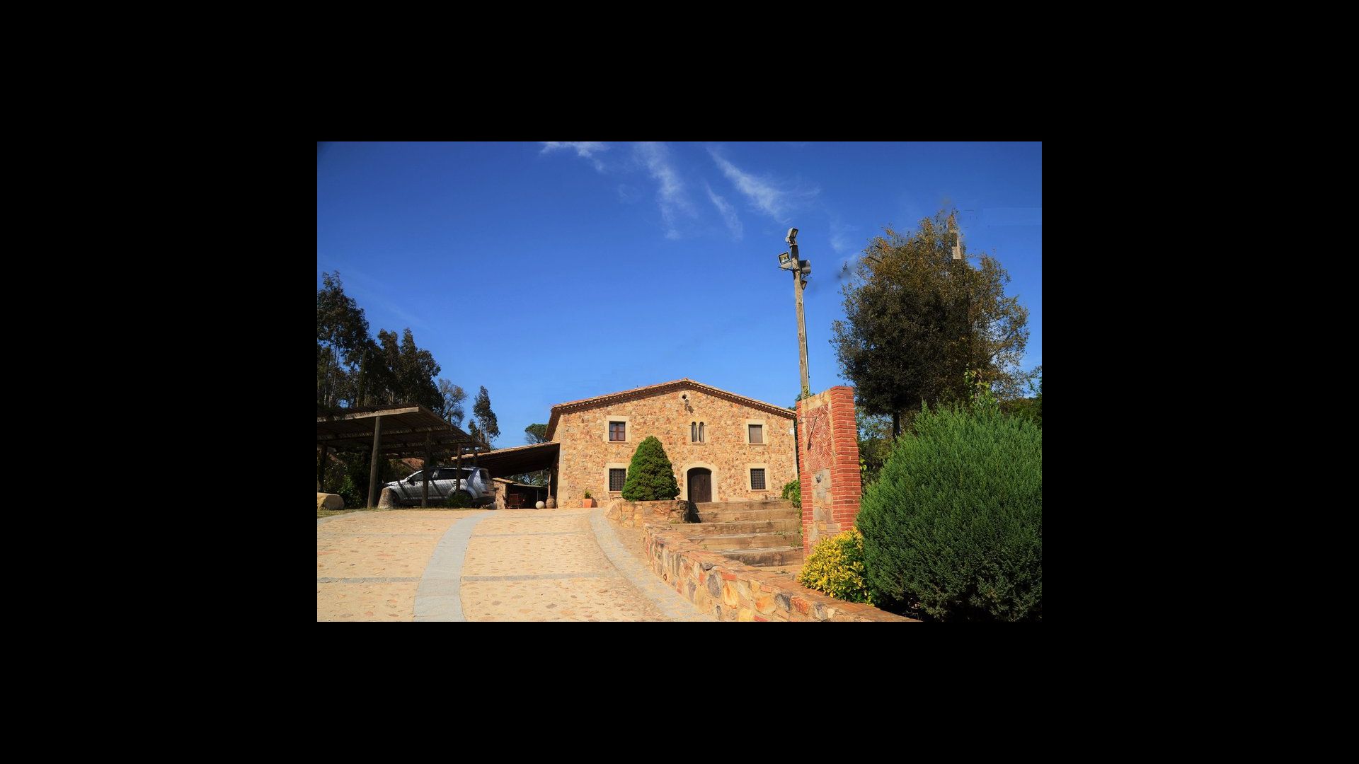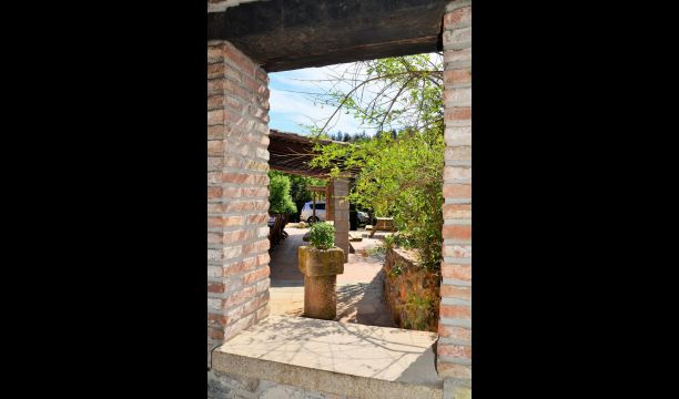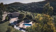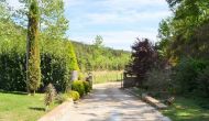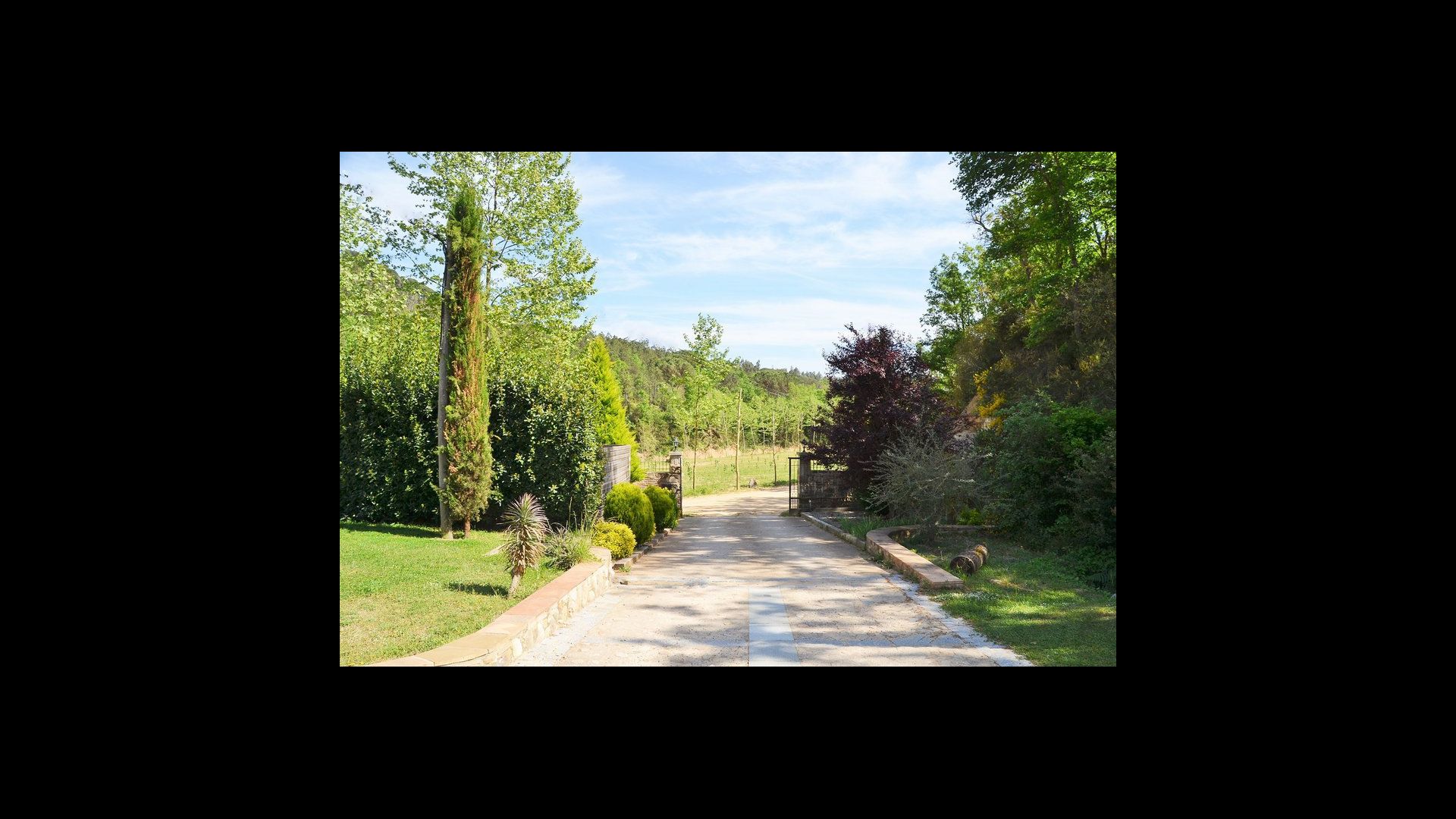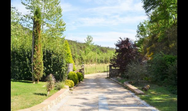 Après un court trajet en voiture en suivant la route de gravier à travers une petite forêt, vous arrivez à la belle porte où l'allée pavée avec des cyprès de chaque côté vous mène à la maison, avec la grande piscine d'un côté et la pelouse de l'autre côté.