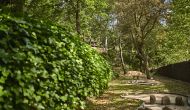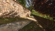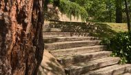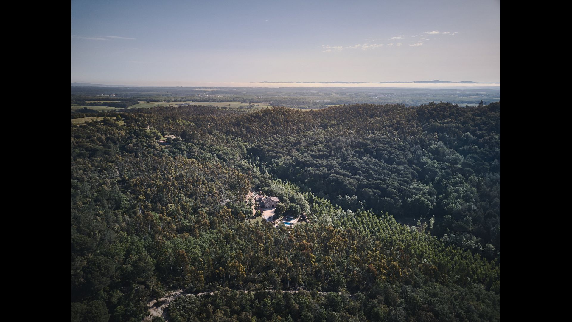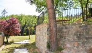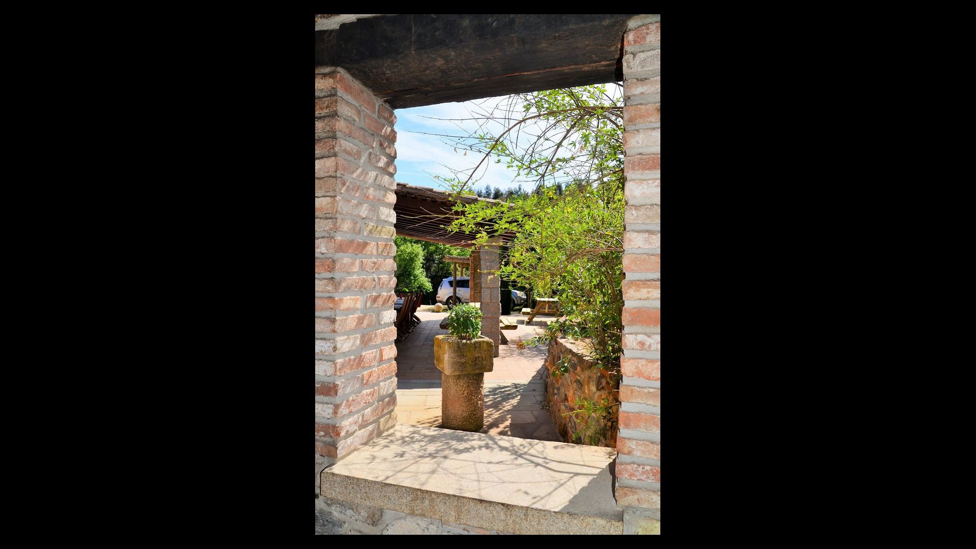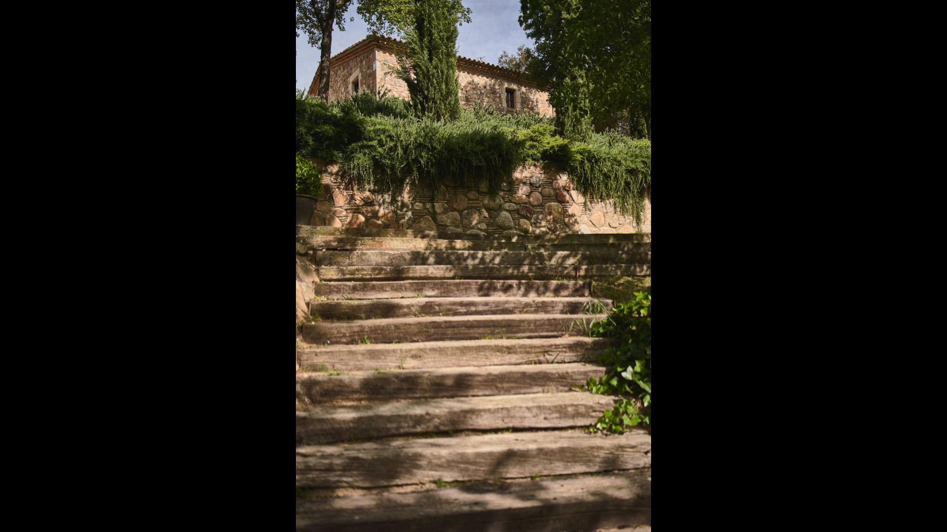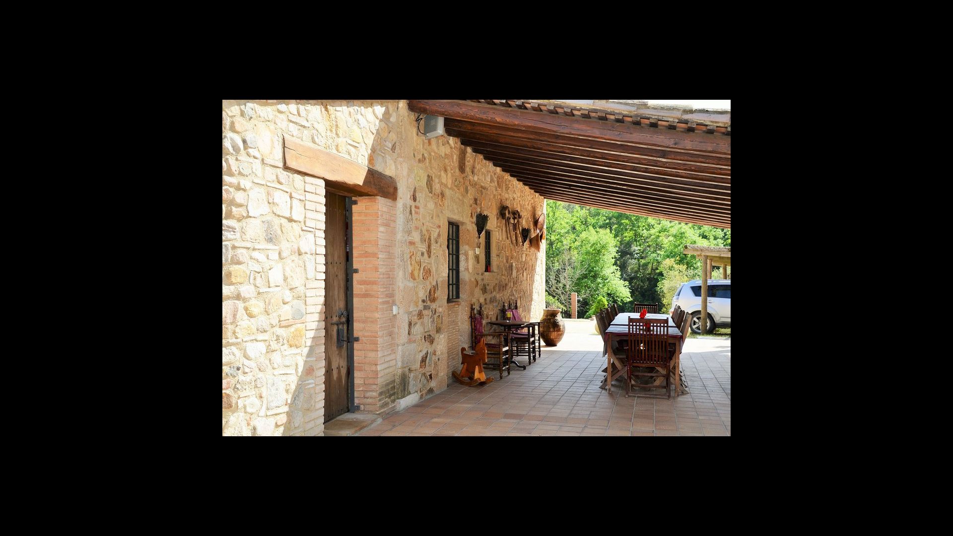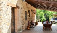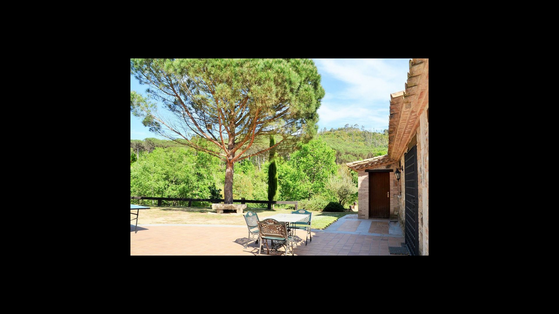 Après un court trajet en voiture en suivant la route de gravier à travers une petite forêt, vous arrivez à la belle porte où l'allée pavée avec des cyprès de chaque côté vous mène à la maison, avec la grande piscine d'un côté et la pelouse de l'autre côté.