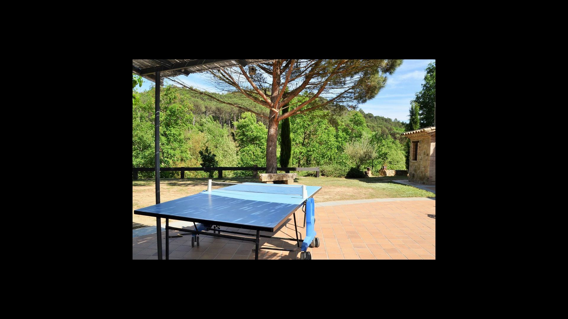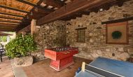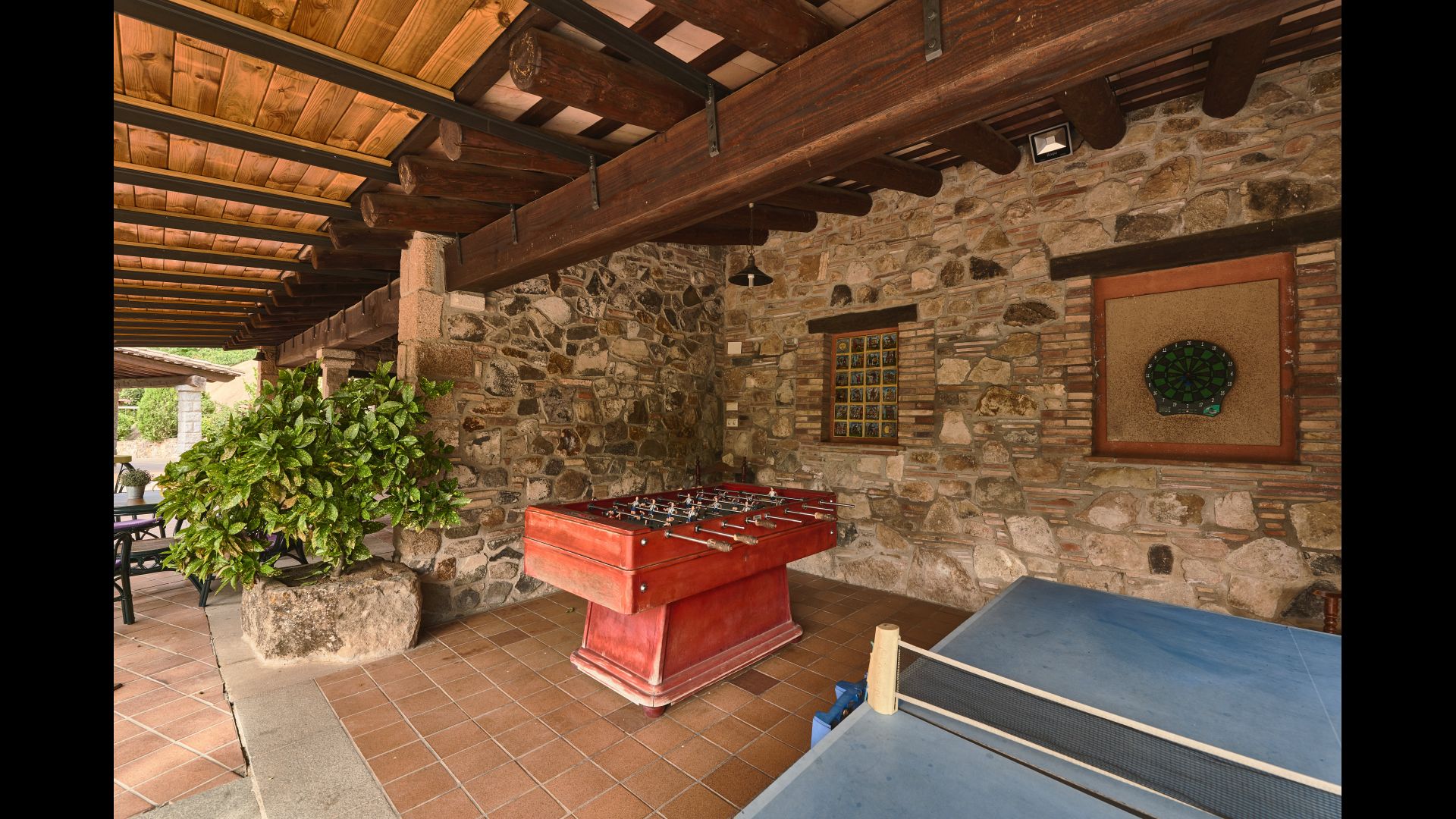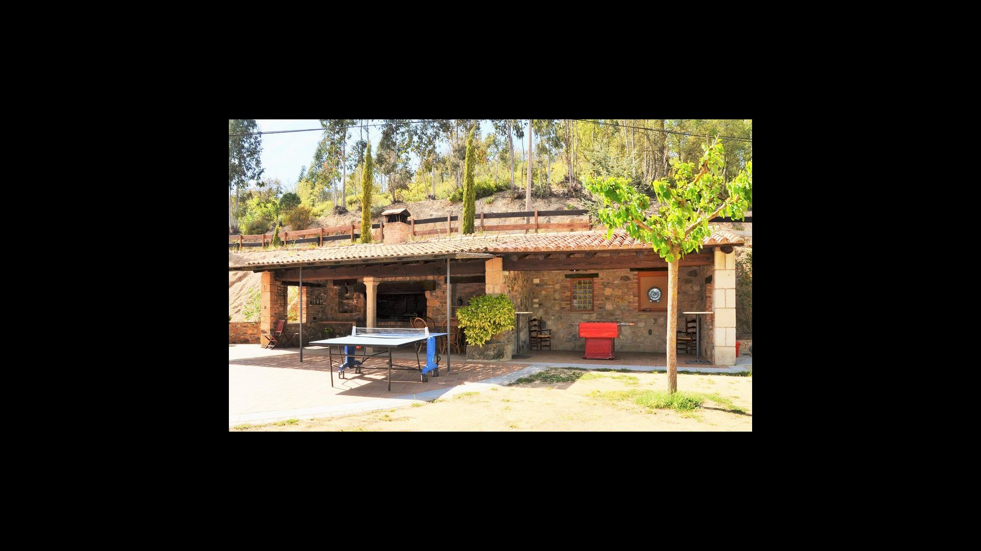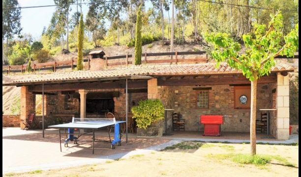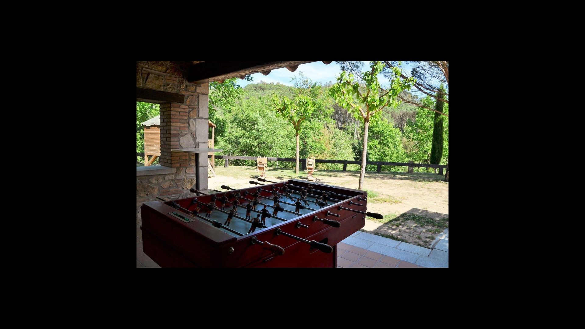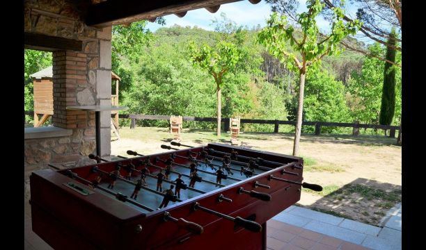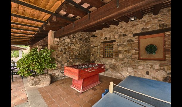 De l'autre côté de la maison, à côté de la deuxième terrasse extérieure, vous trouverez un espace couvert avec jeu de fléchettes, baby-foot et tennis de table, ainsi qu'une salle de jeux avec mini-cuisine et bac à sable, pour que les enfants puissent se divertir, pendant que les parents se détendent à la table du dîner. C’est l’endroit idéal pour manger à l’extérieur, couvert ou non couvert selon vos préférences, car il ya une porte qui donne directement sur la cuisine et, de l’autre côté, un grand barbecue couvert. Il y a aussi une toilette, vous n'aurez donc pas à entrer dans la maison.