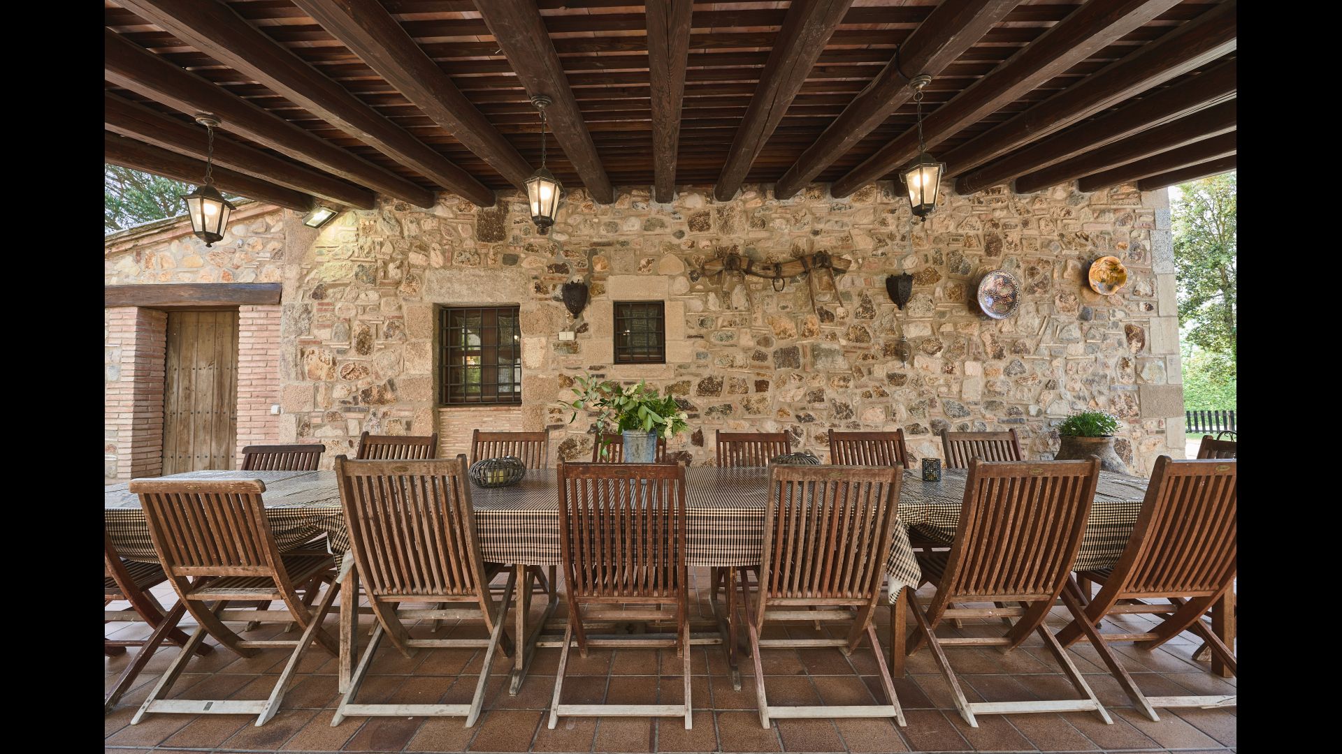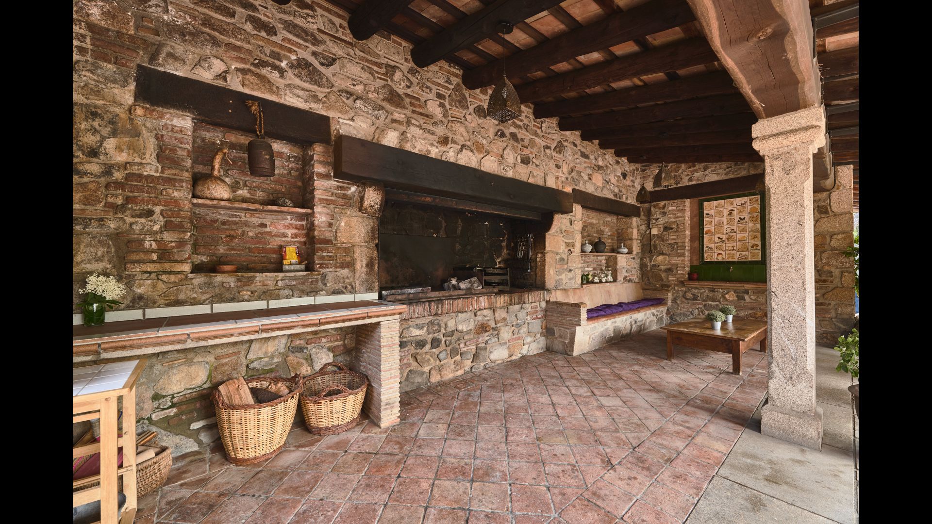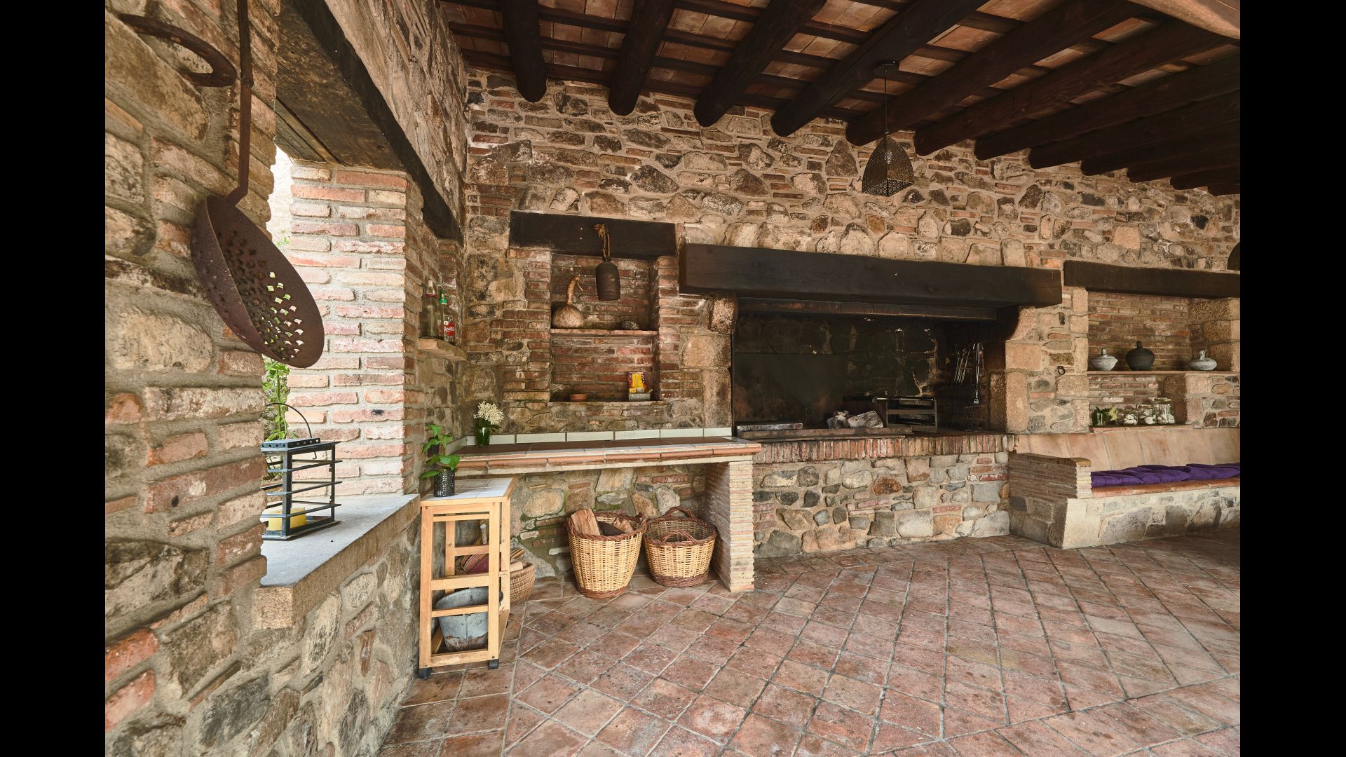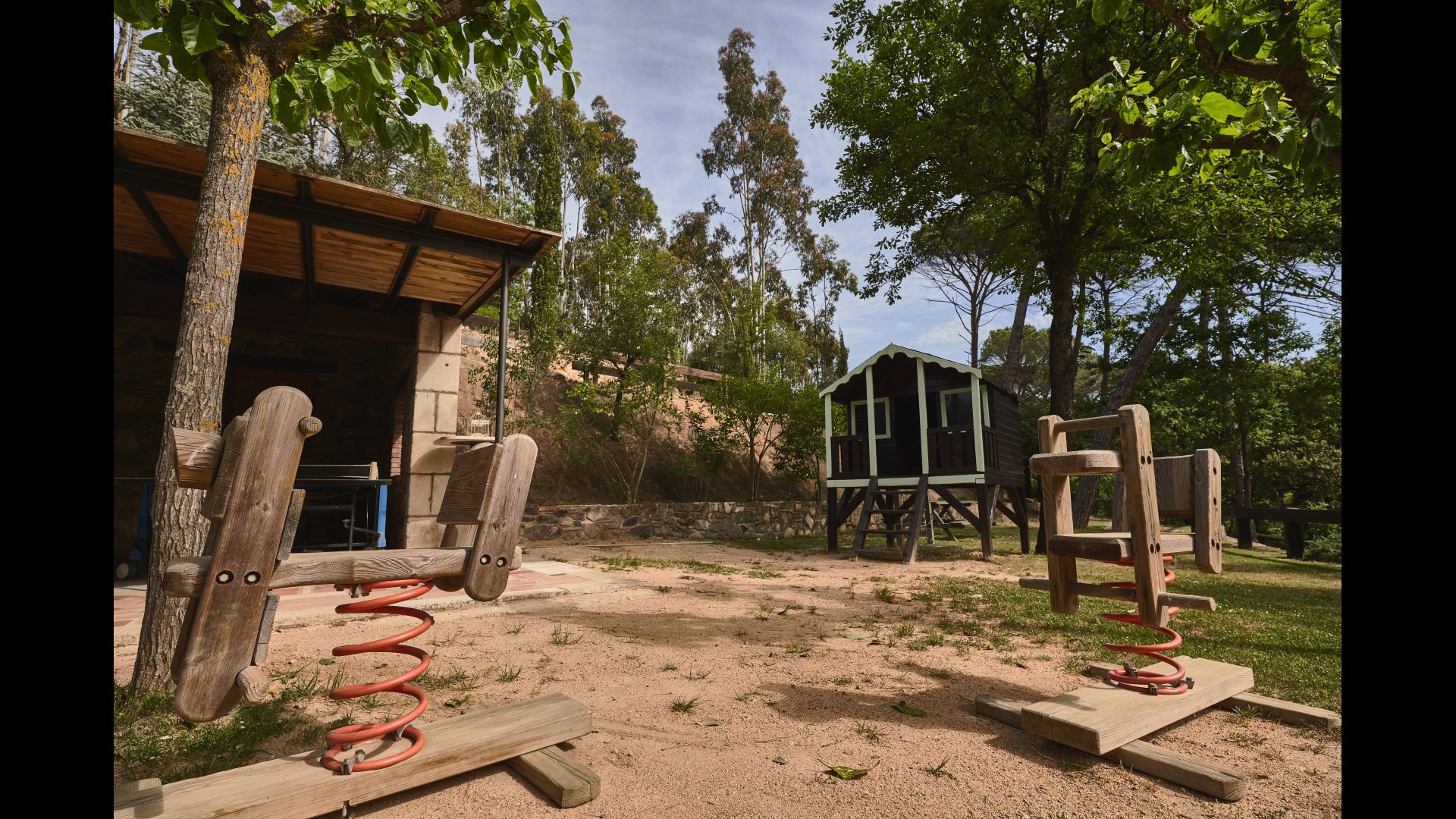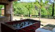 De l'autre côté de la maison, à côté de la deuxième terrasse extérieure, vous trouverez un espace couvert avec jeu de fléchettes, baby-foot et tennis de table, ainsi qu'une salle de jeux avec mini-cuisine et bac à sable, pour que les enfants puissent se divertir, pendant que les parents se détendent à la table du dîner. C’est l’endroit idéal pour manger à l’extérieur, couvert ou non couvert selon vos préférences, car il ya une porte qui donne directement sur la cuisine et, de l’autre côté, un grand barbecue couvert. Il y a aussi une toilette, vous n'aurez donc pas à entrer dans la maison.