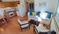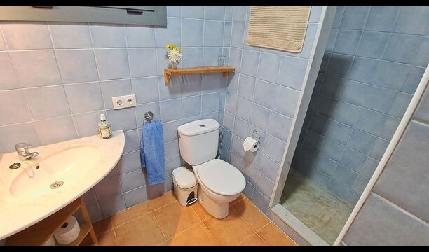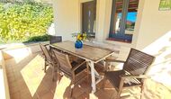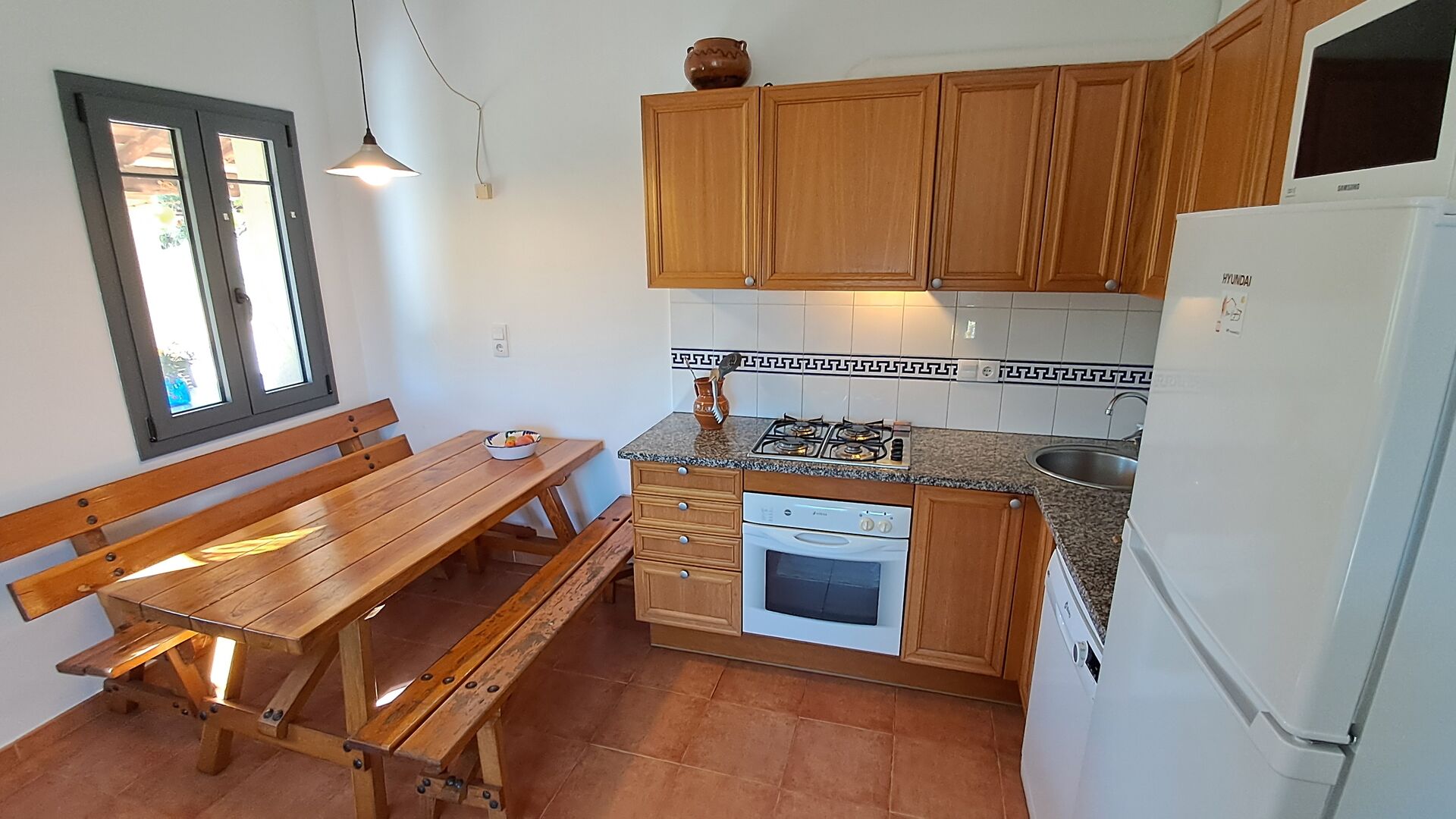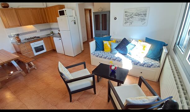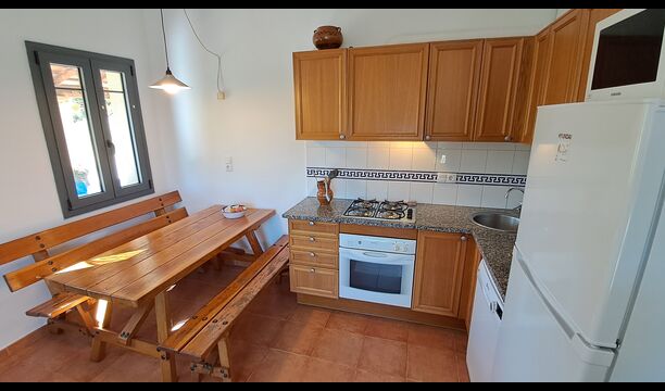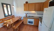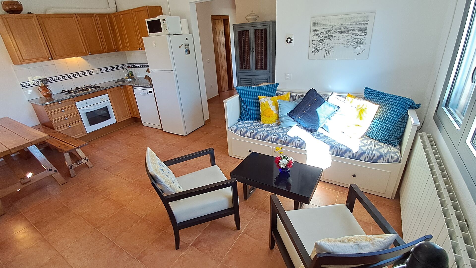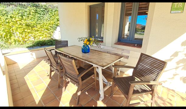 Au rez-de-chaussée se trouve le plus grand des deux appartements. On y accède par une terrasse couverte et conviviale, située juste devant la cuisine, idéale pour les repas en plein air. À l’intérieur, un espace salon-salle à manger accueillant avec une grande table, un coin canapé avec télévision, et une cuisine ouverte entièrement équipée vous attendent.