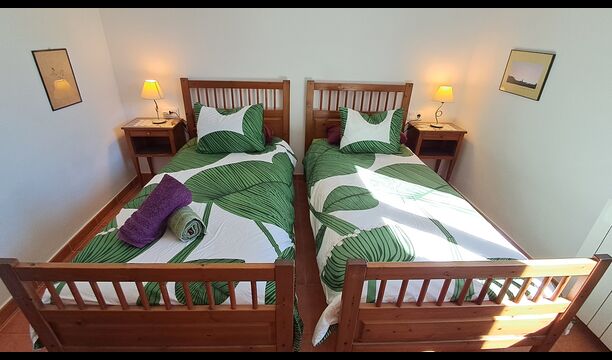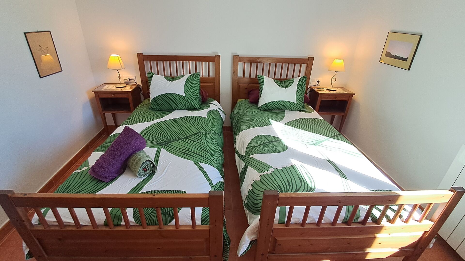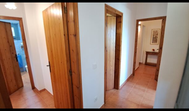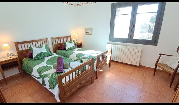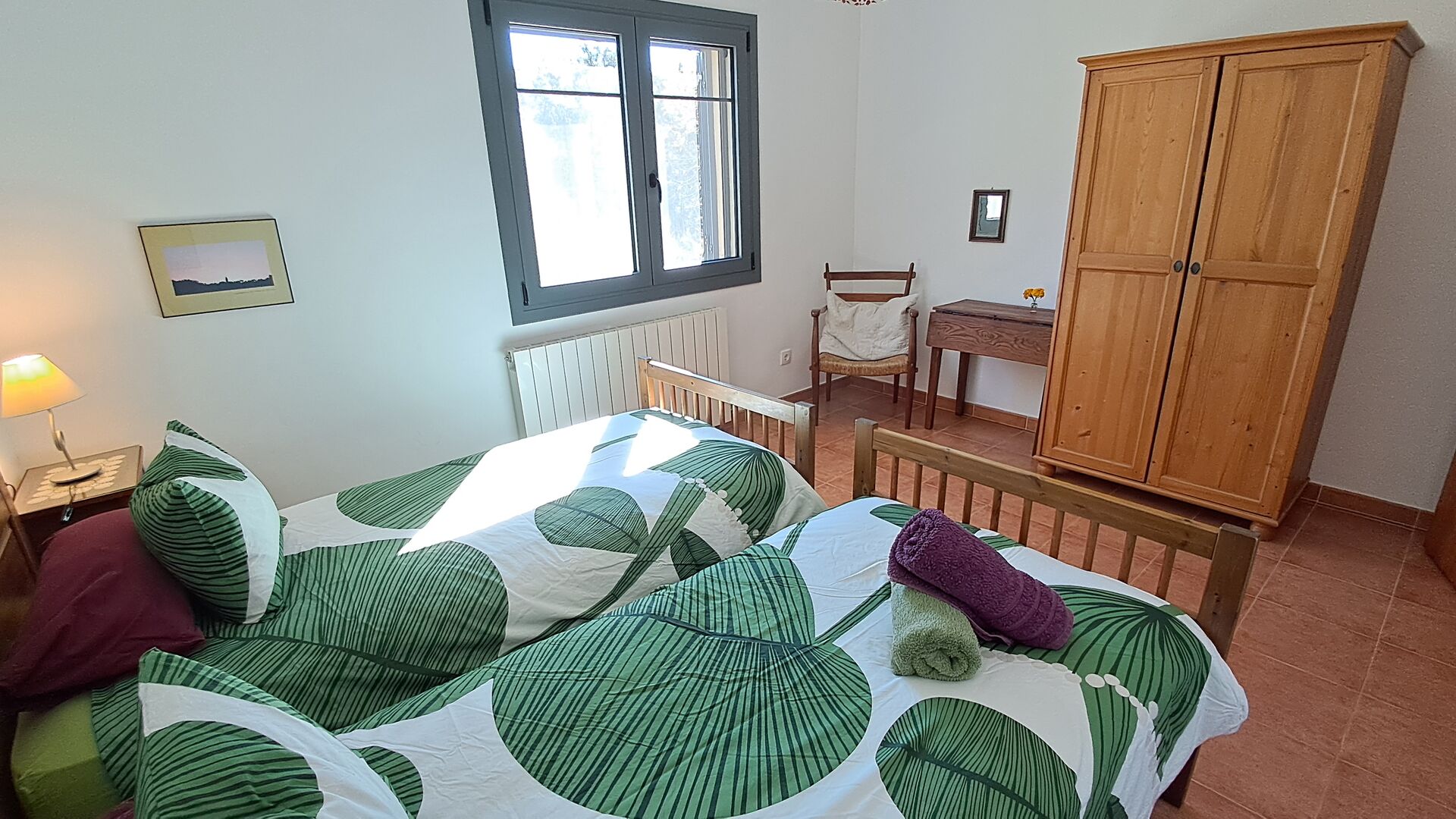 Un petit couloir mène aux chambres : à gauche, une chambre double avec salle de bain privée, et tout droit, deux chambres supplémentaires, chacune avec deux lits simples réunis. Ces deux chambres partagent une seconde salle de bain.