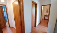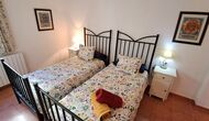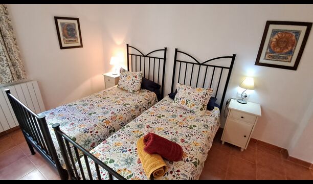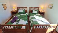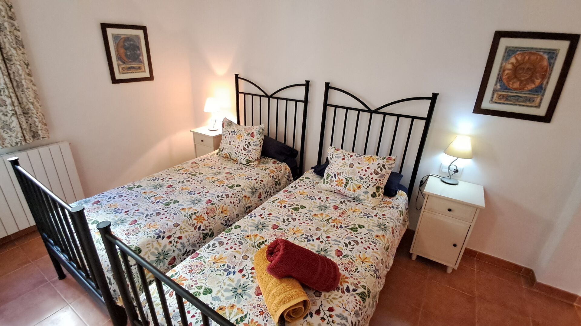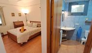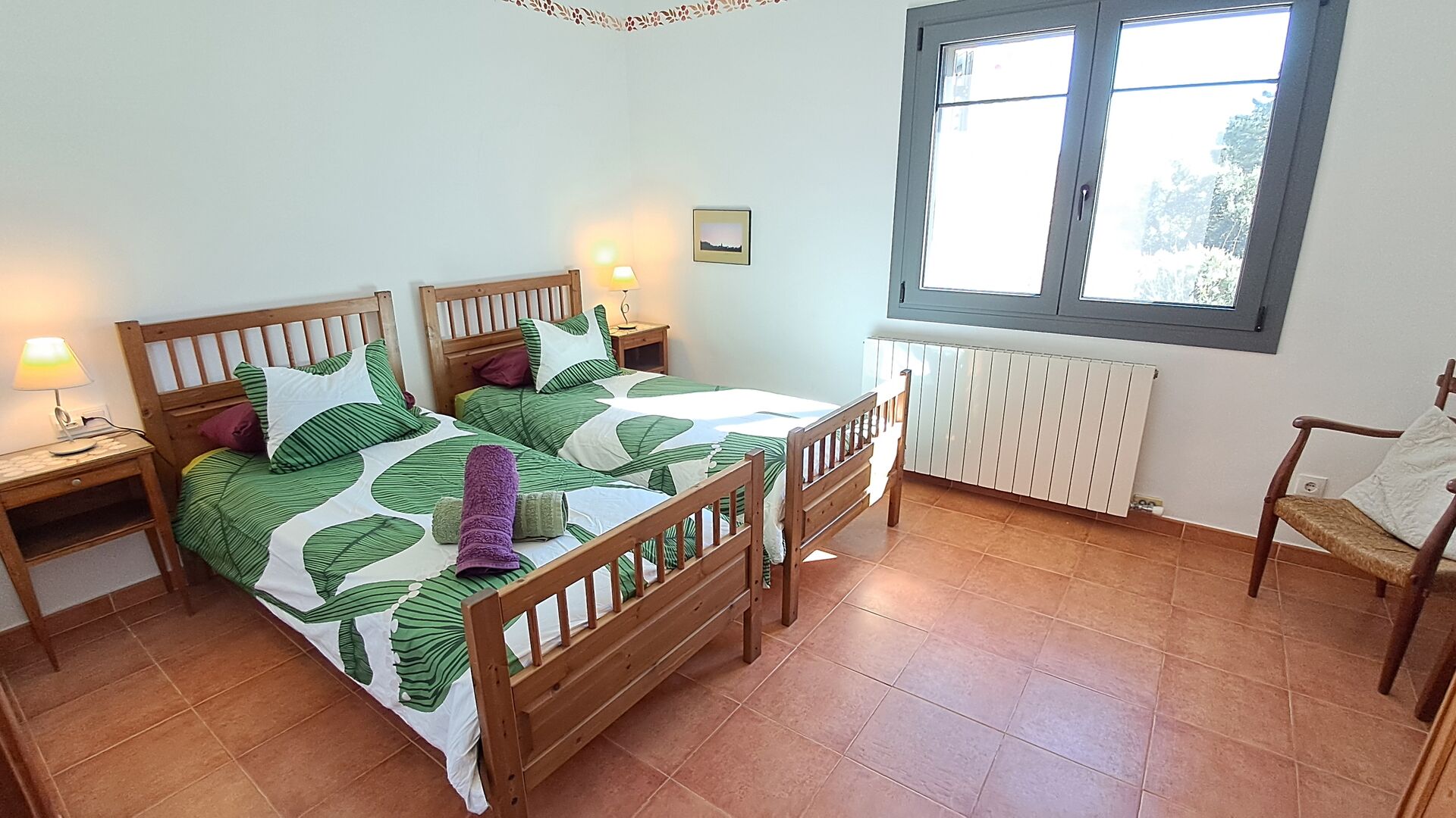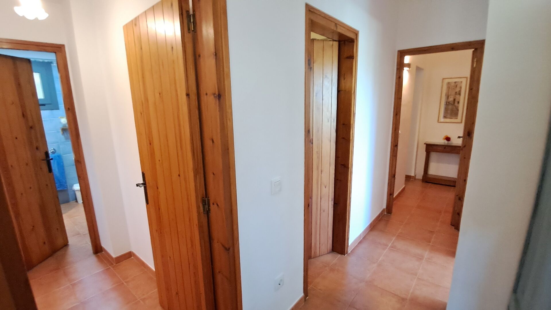Un petit couloir mène aux chambres : à gauche, une chambre double avec salle de bain privée, et tout droit, deux chambres supplémentaires, chacune avec deux lits simples réunis. Ces deux chambres partagent une seconde salle de bain.