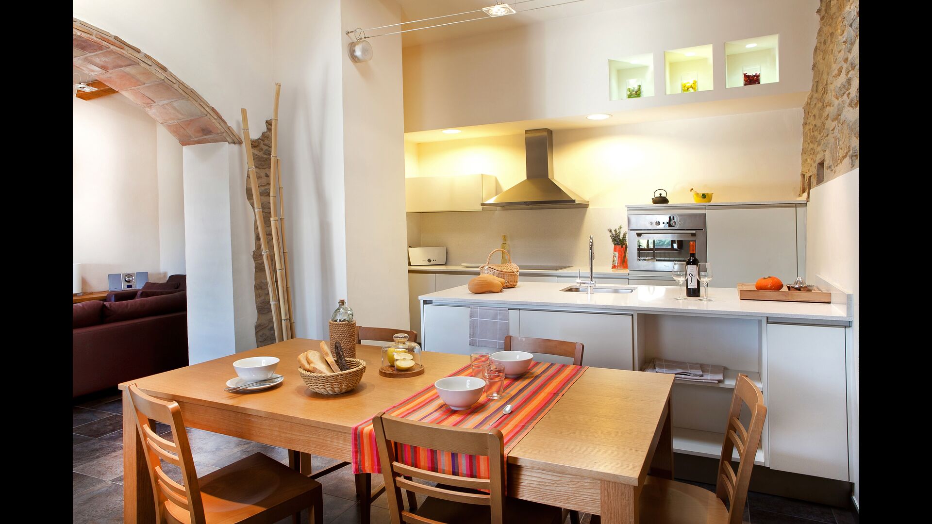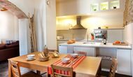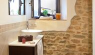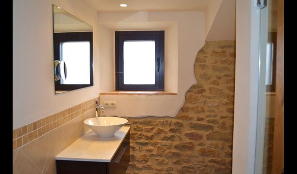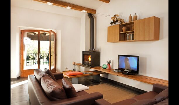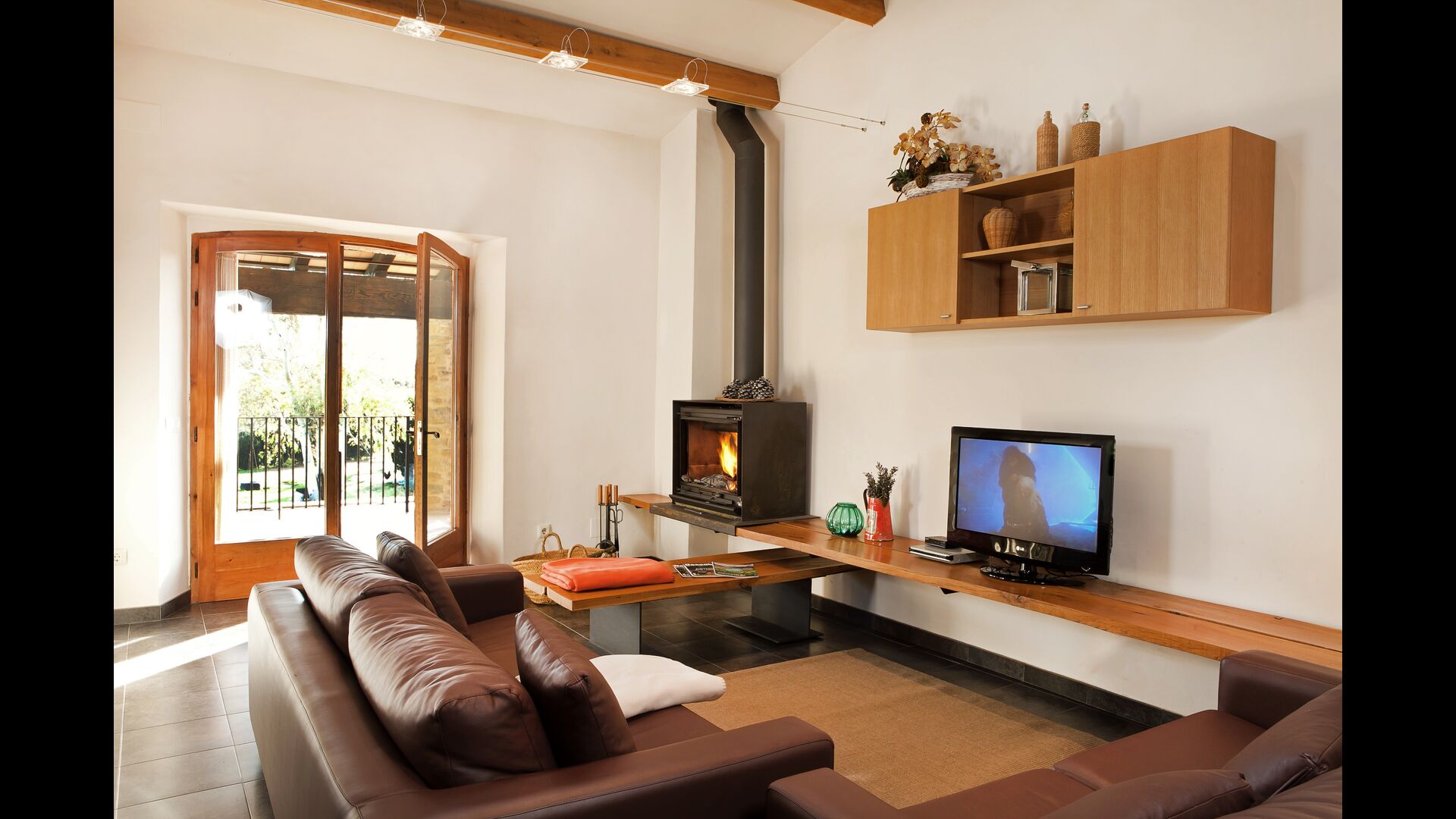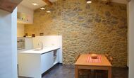 The very beautiful and modern living room has a sofa corner with a TV, as well as an open and well-equipped kitchen and a nice dining table. The stone walls in this room combined with the white walls provide an authentic, but new atmosphere. The apartment has a private terrace overlooking the garden and the beautiful surroundings, and here is also a dining table where the homemade food can be enjoyed in the warm Catalan evenings.
