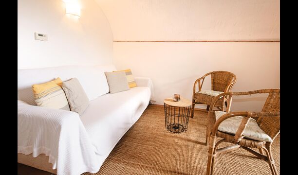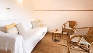 At the entrance to La Cort is a private terrace with a seating arrangement consisting of wooden chairs and table. Just inside the door is the cosy living room with sofa and satellite TV.