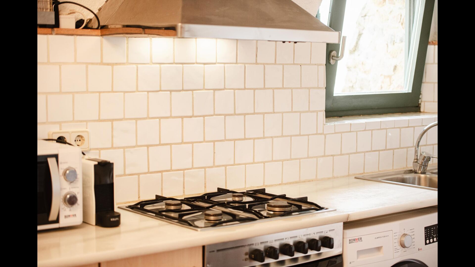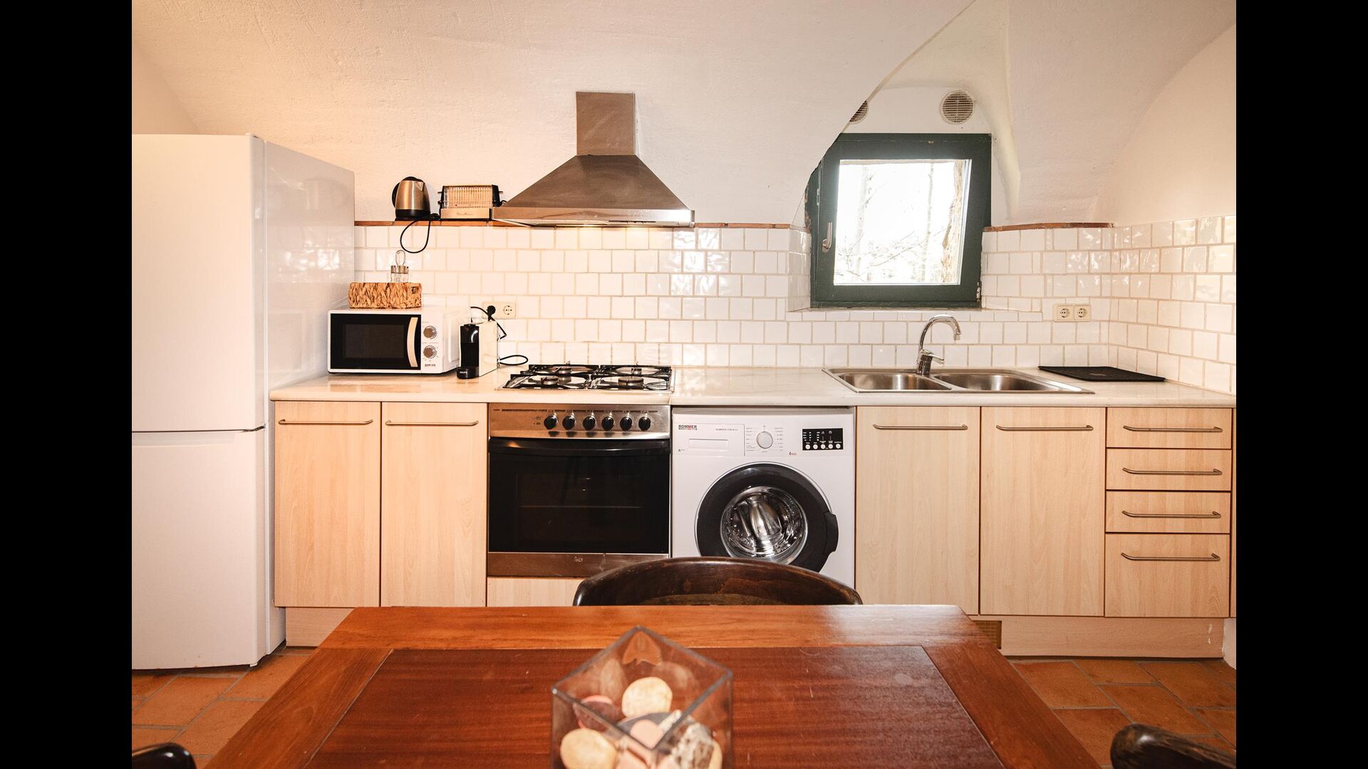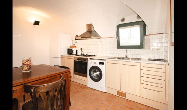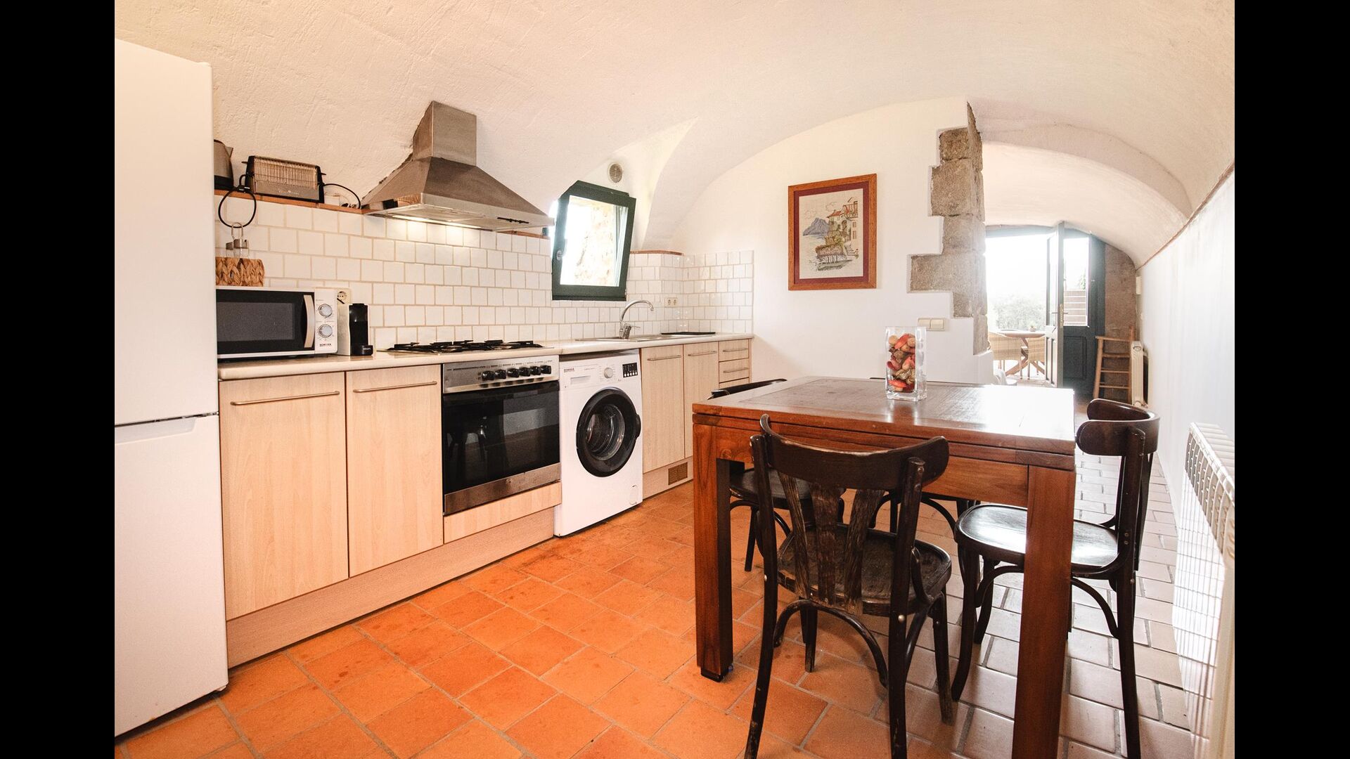 The kitchen is very well equipped. Here is a washing machine, oven, stove, refrigerator, freezer, microwave, toaster and dining table, useful if the weather is too bad for dining on the terrace - although this is very unlikely, sinceCatalonia has unusually high number of sunny days per year.