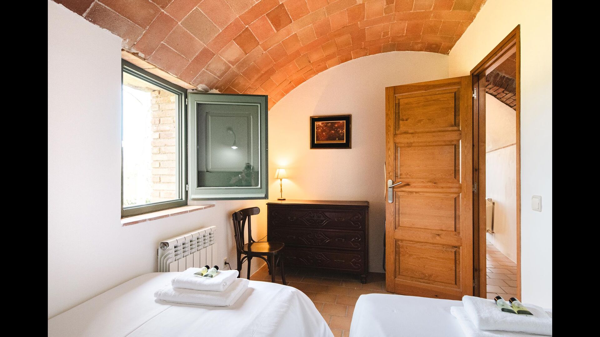 La Cort has two bedrooms - the first is a cosy double room with two single beds, and the other is also beautifully decorated with a nice big double bed. The bedrooms share a bathroom, which also has a shower.