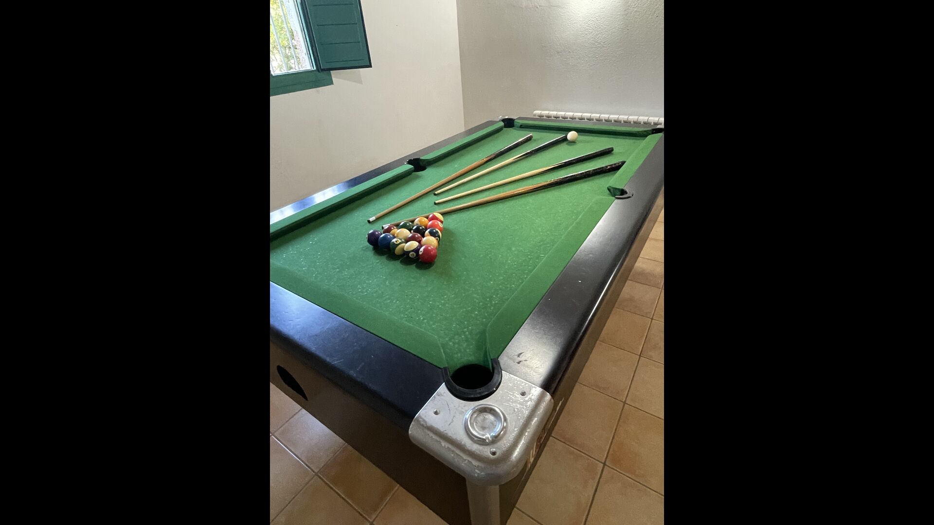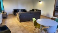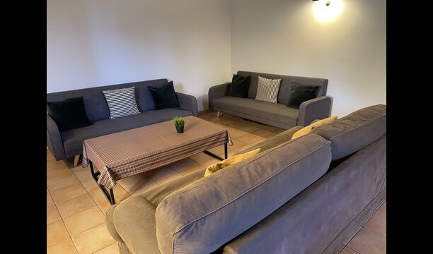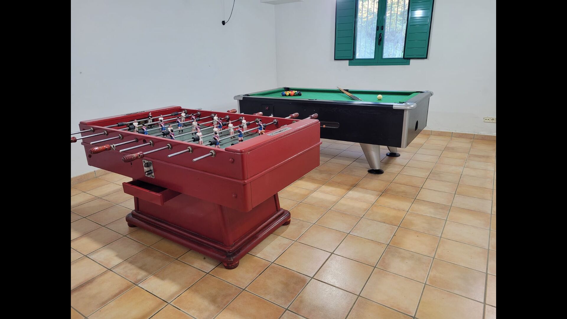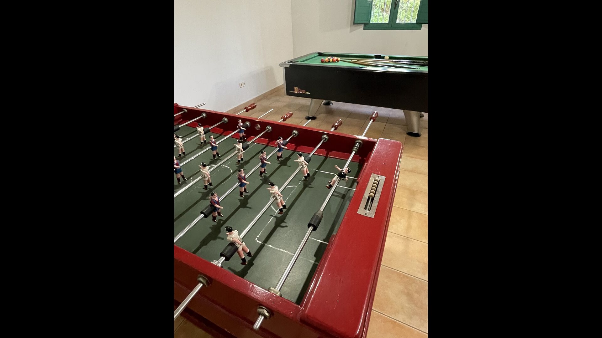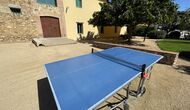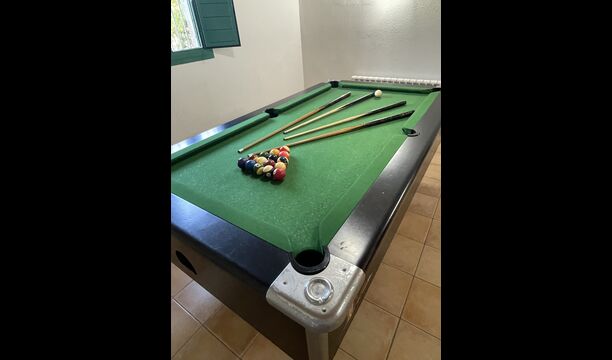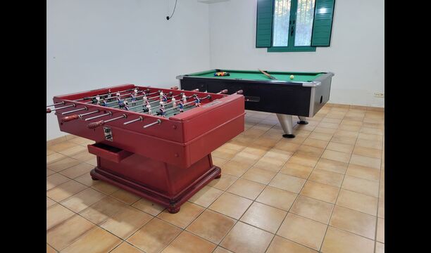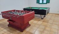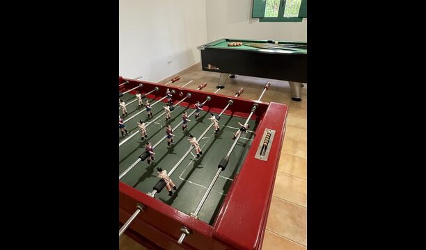 Le grand salon comprend une table à manger et 3 canapés. Il y a aussi une TV. Il y a aussi la salle de jeux, contenant un baby-foot, des jeux de fléchettes et un billard, et dans le jardin, vous trouverez également un configuration de tennis de table. Beaucoup de choses pour garder les enfants - et adultes - divertis ! Également au premier étage, vous trouverez 2 chambres - les deux sont des chambres doubles.