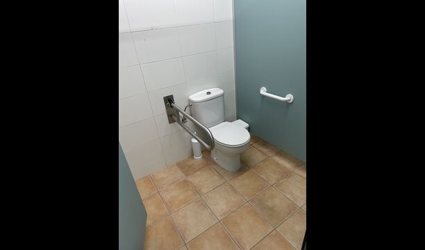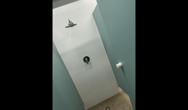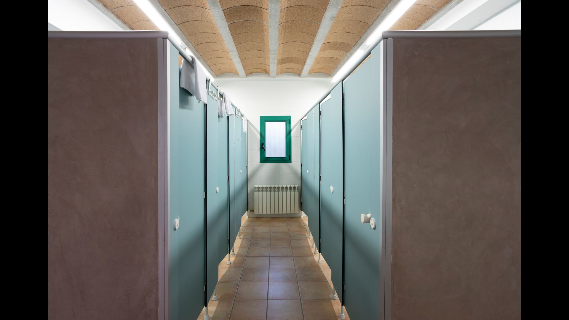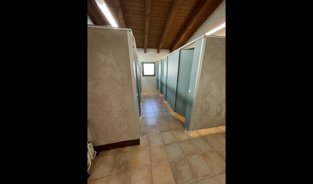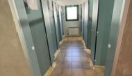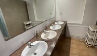 Vous trouverez également une des trois salles de bains du rez-de-chaussée - sa disposition d'auberge est toujours évidente . Il y a 3 cabines de toilettes, 3 cabines de douche et 3 lavabos.