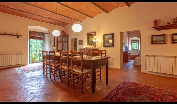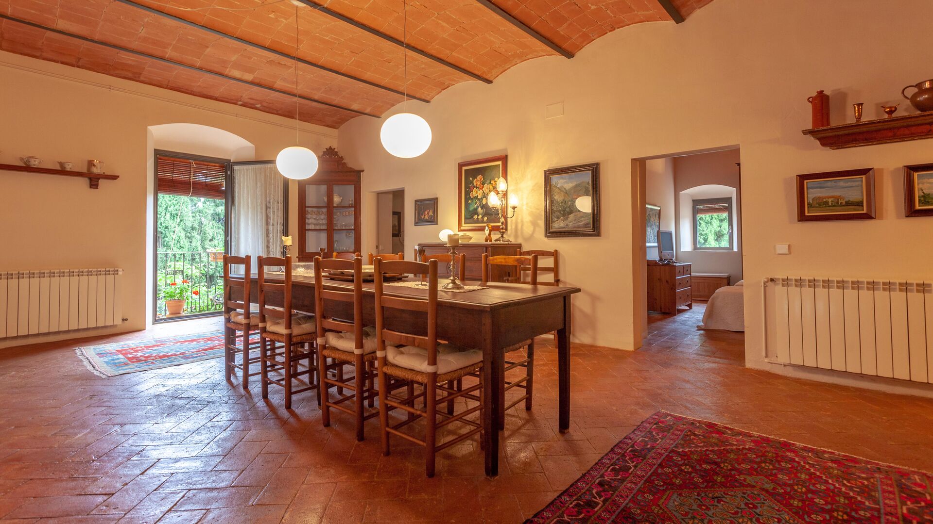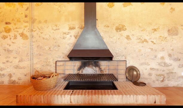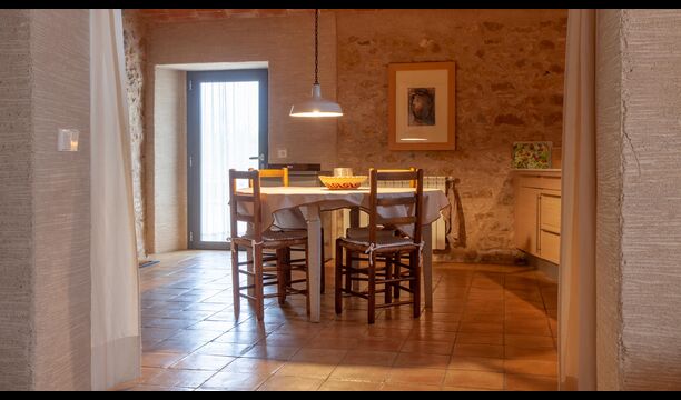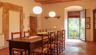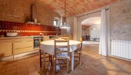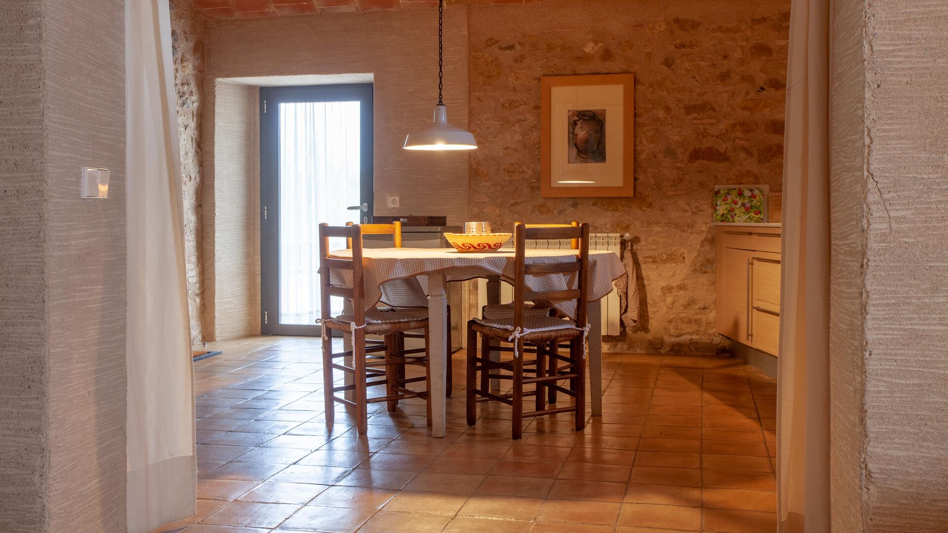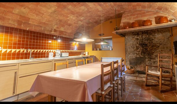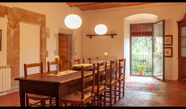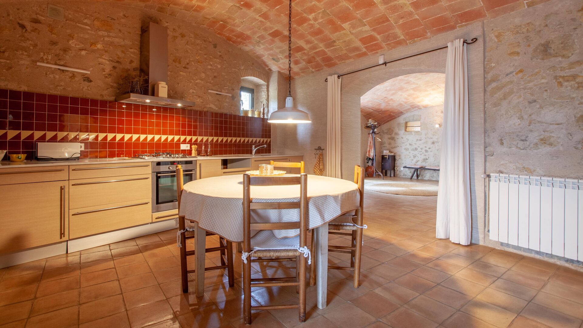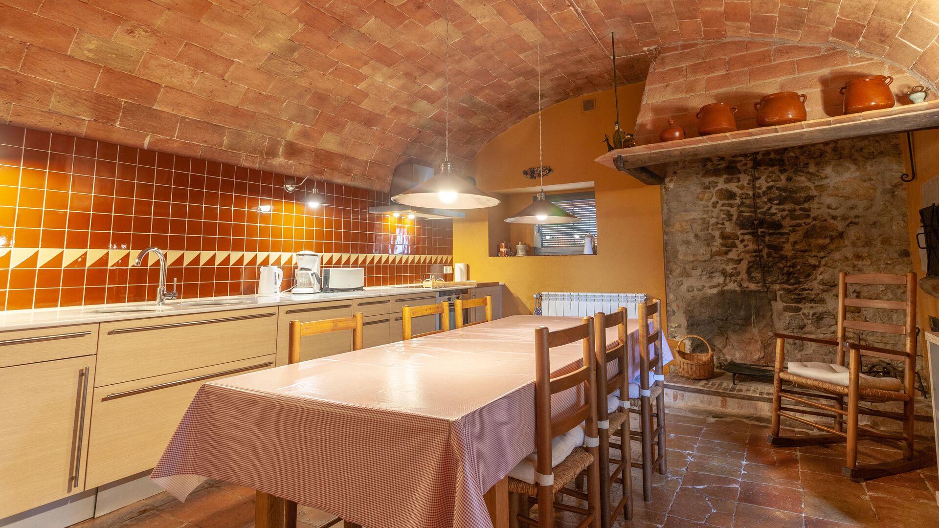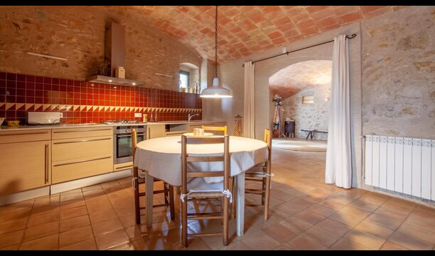 Grand espace salon et salle à manger ouvert reliant toutes les pièces de cet étage. La cuisine originale de la masia a été rénovée et entièrement équipée et s’ouvre sur une terrasse couverte offrant une belle vue sur l’ensemble de la propriété.