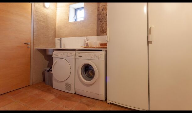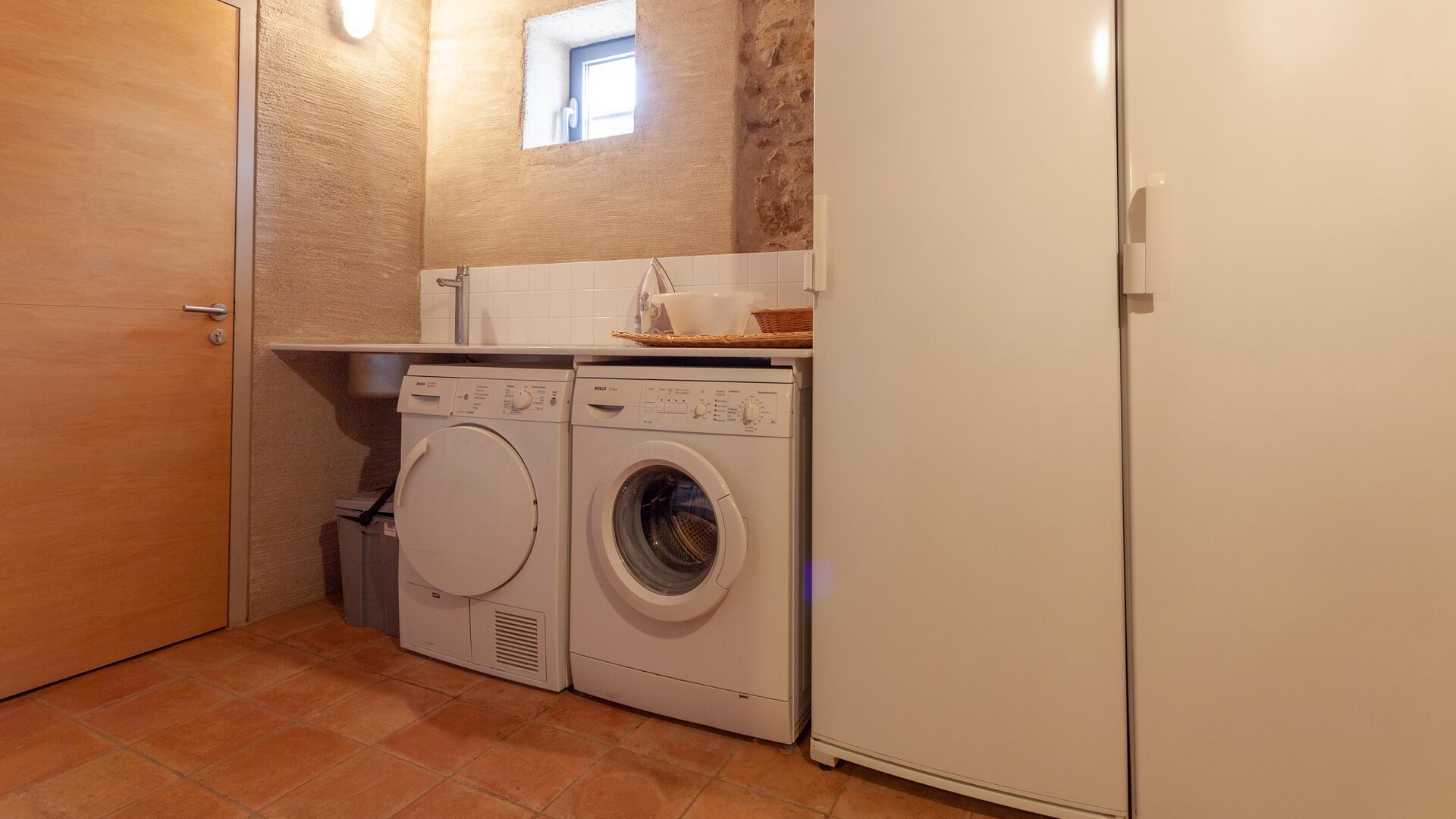 Hall d’entrée avec voûte catalane, spacieux salon avec cheminée et accès à une terrasse couverte, cuisine indépendante entièrement équipée avec accès à la terrasse, toilettes invités, buanderie avec lave-linge, sèche-linge et étendoir, ainsi qu’une salle polyvalente / salle de jeux donnant sur un porche extérieur meublé.