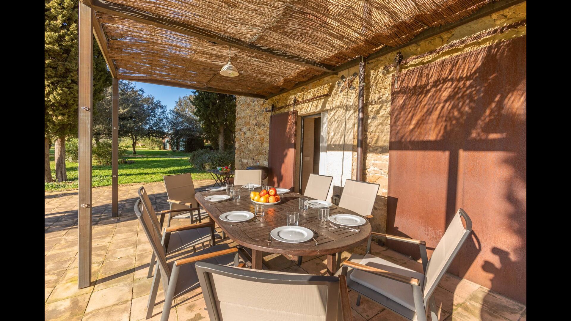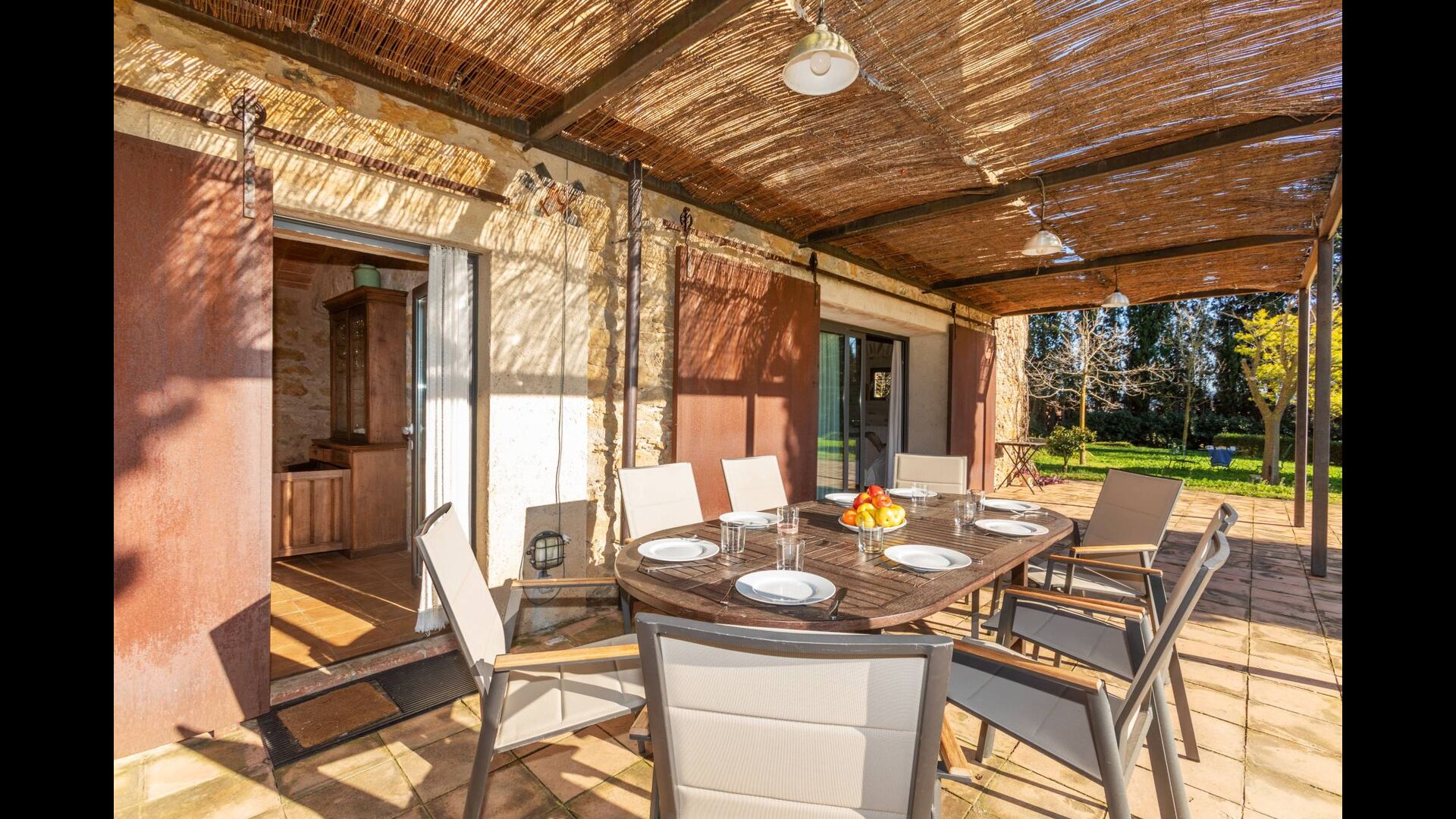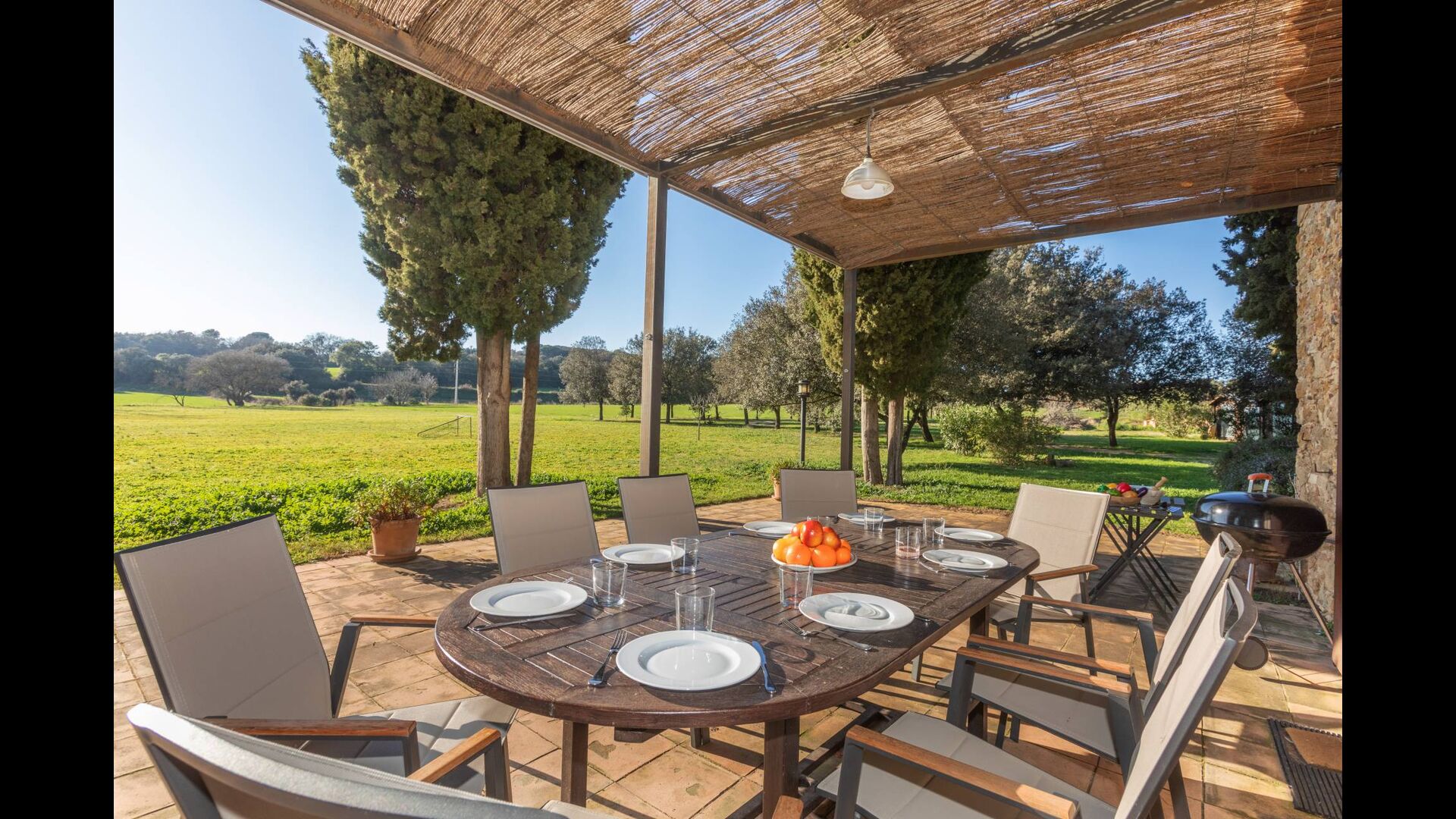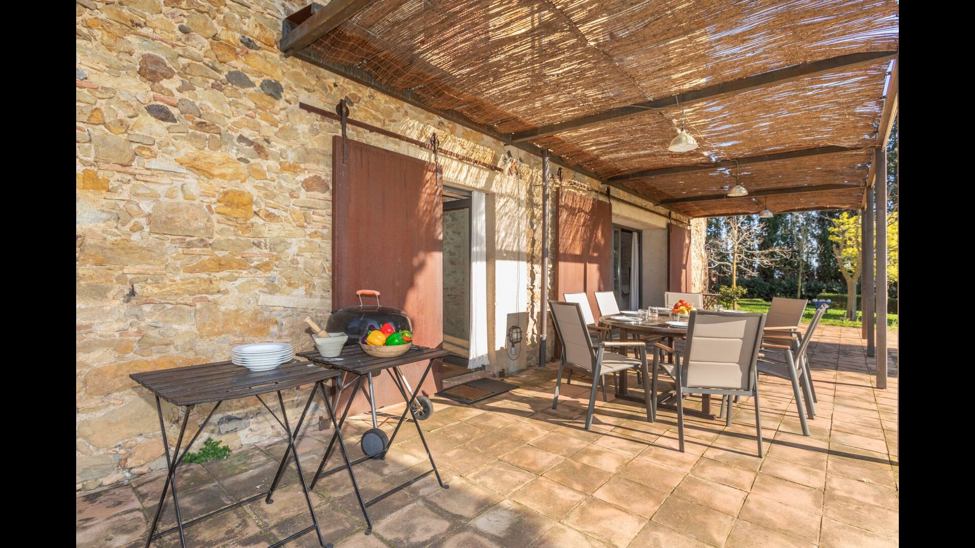 À l’extérieur, la piscine privée ainsi que plusieurs terrasses et porches offrent des espaces parfaits pour se détendre, dîner et profiter des vues ouvertes sur la campagne et de l’atmosphère paisible de l’Empordà.