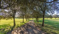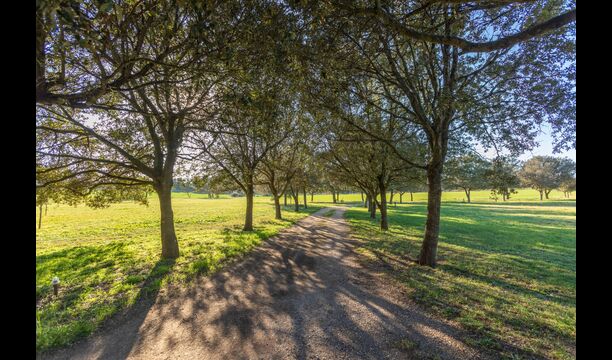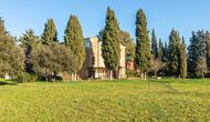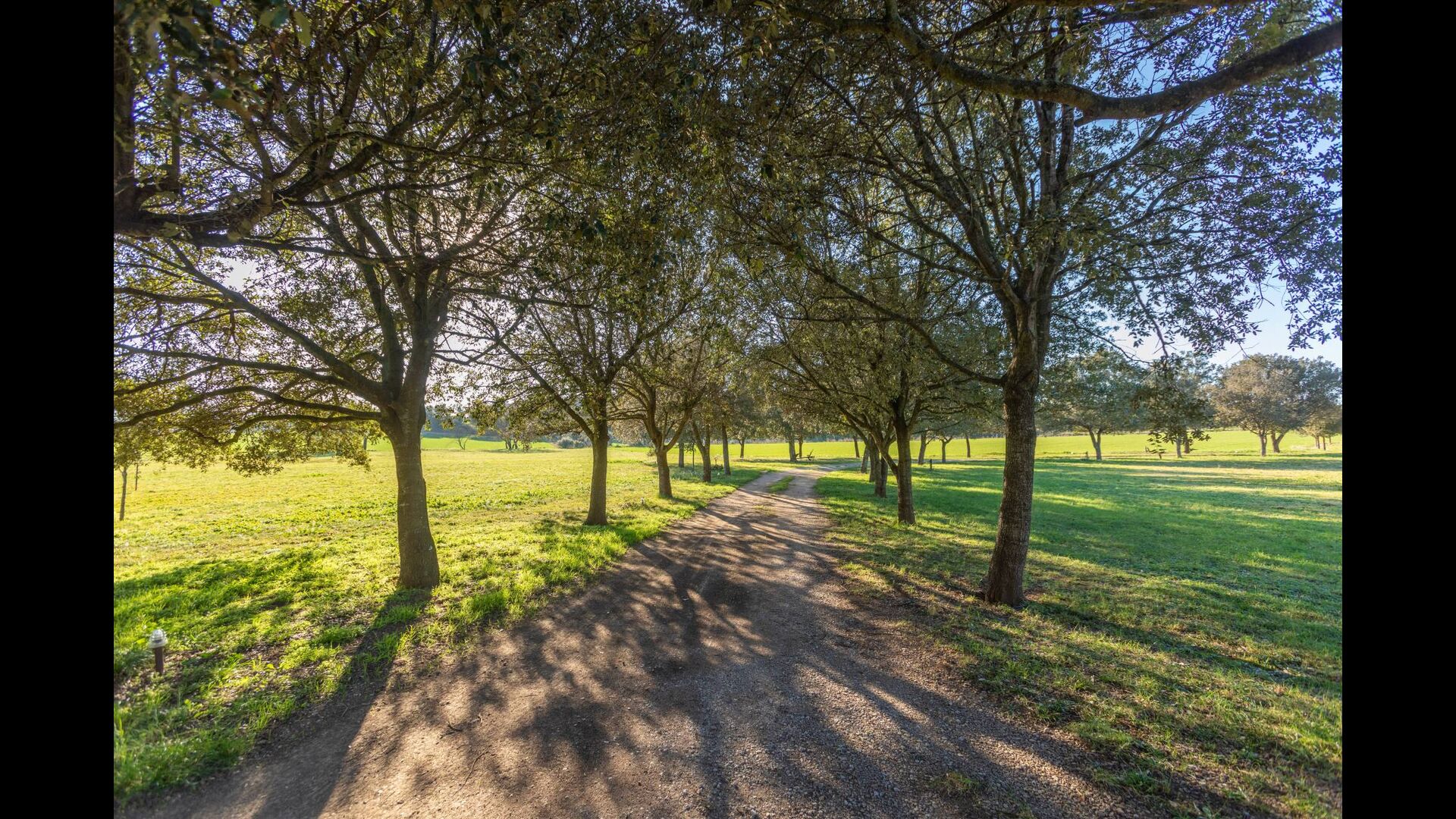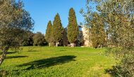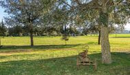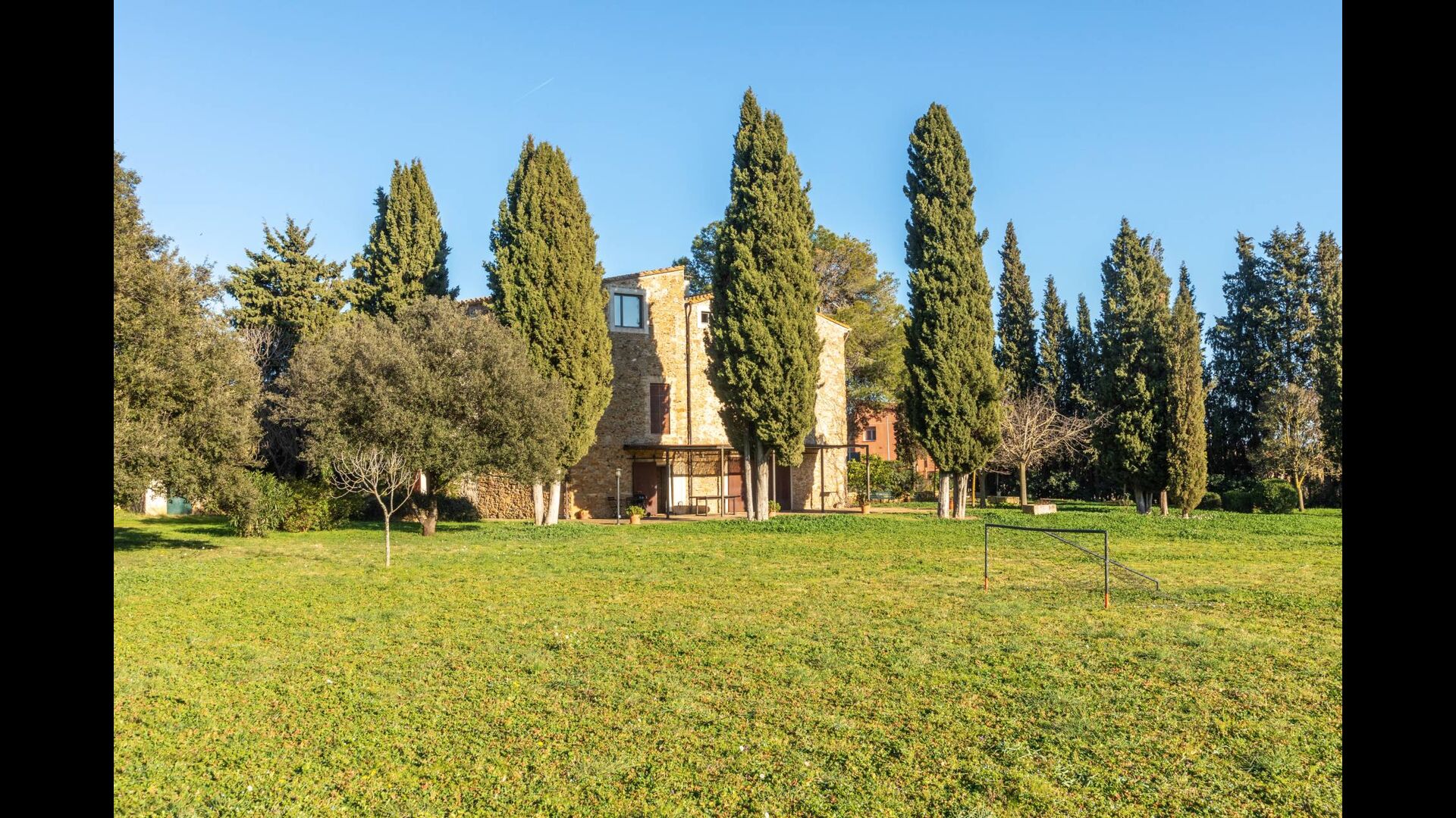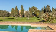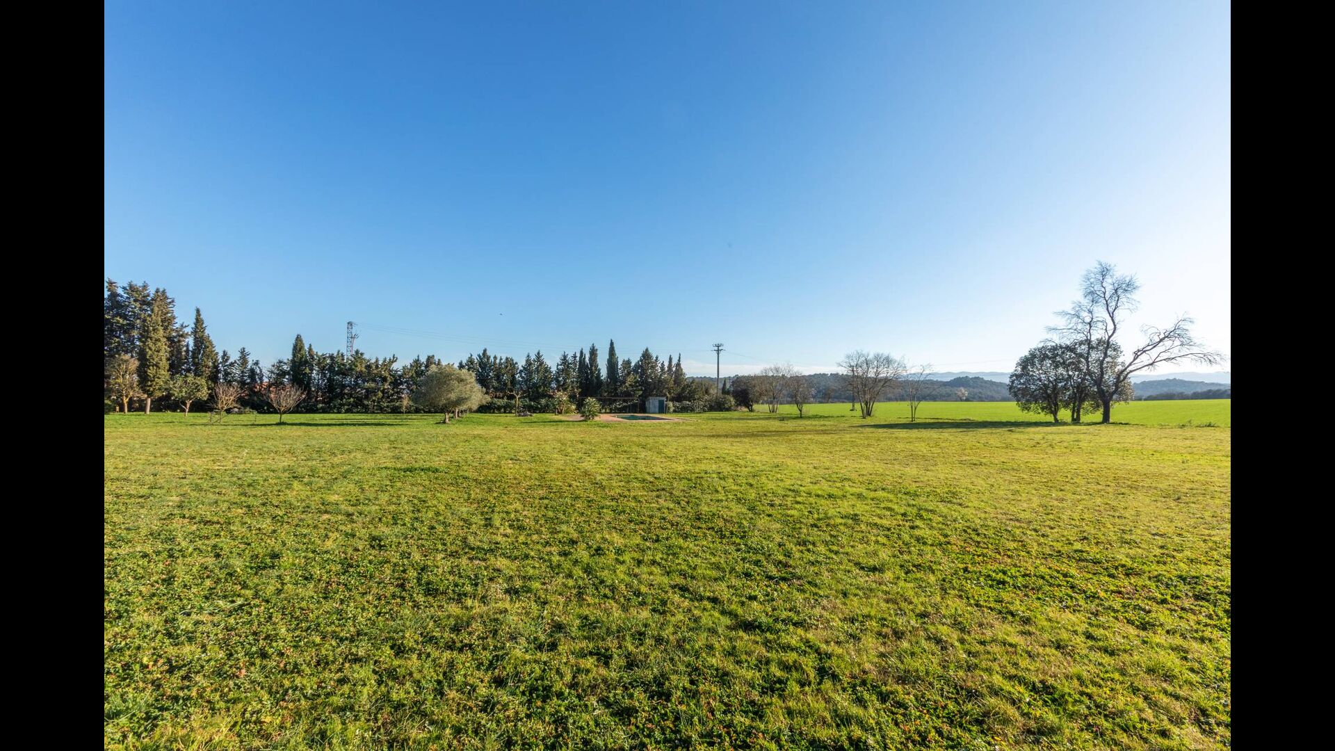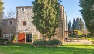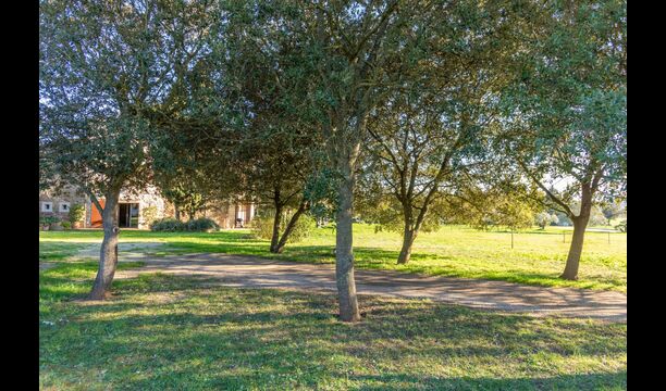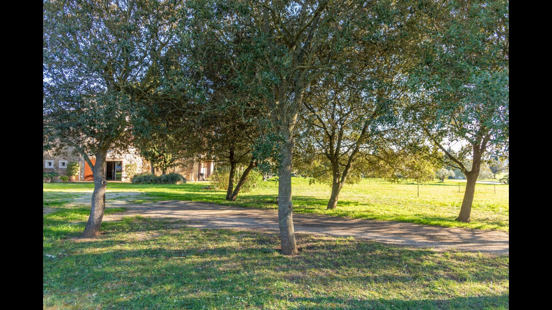 La propriété est accessible par une allée bordée d’arbres menant à la masia, entourée de 30 000 m² de terrain privé et de jardins paysagers.