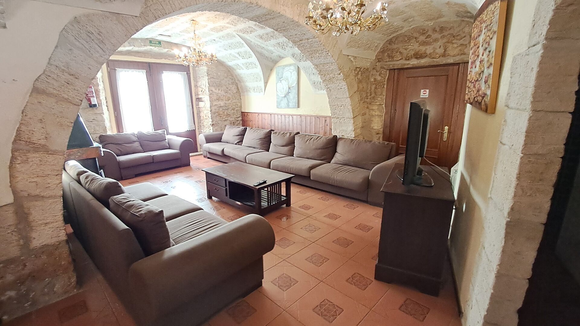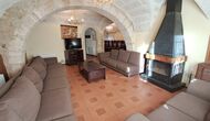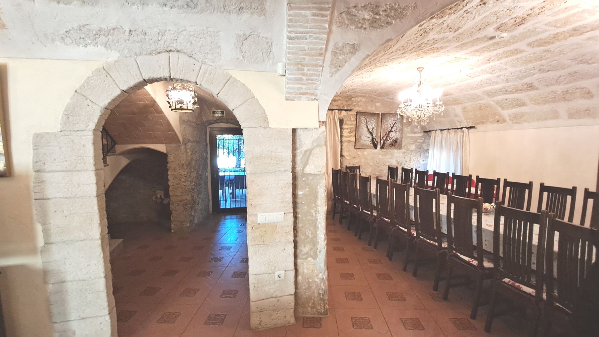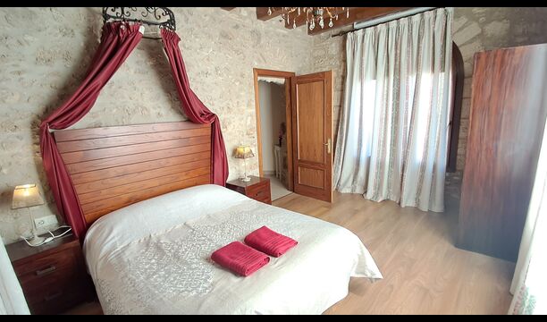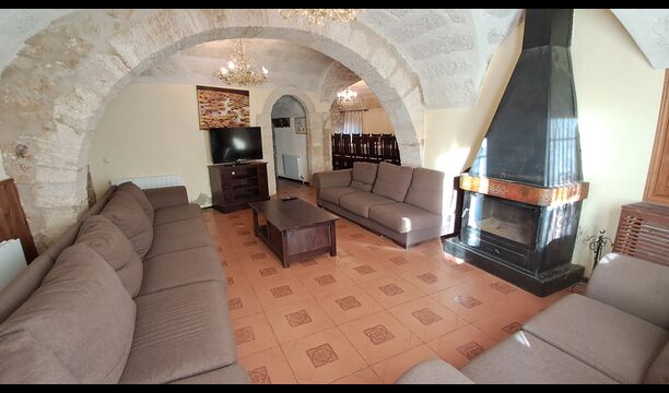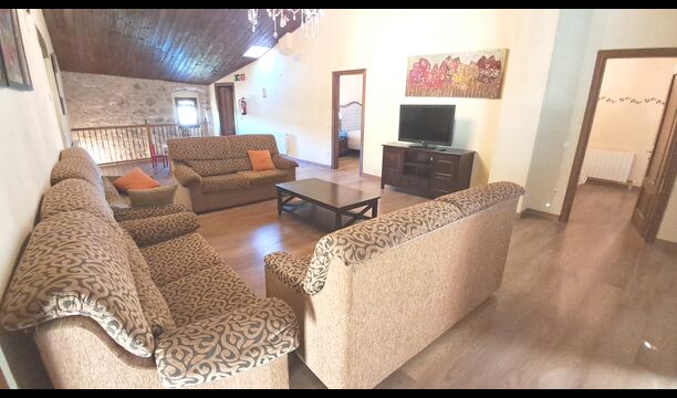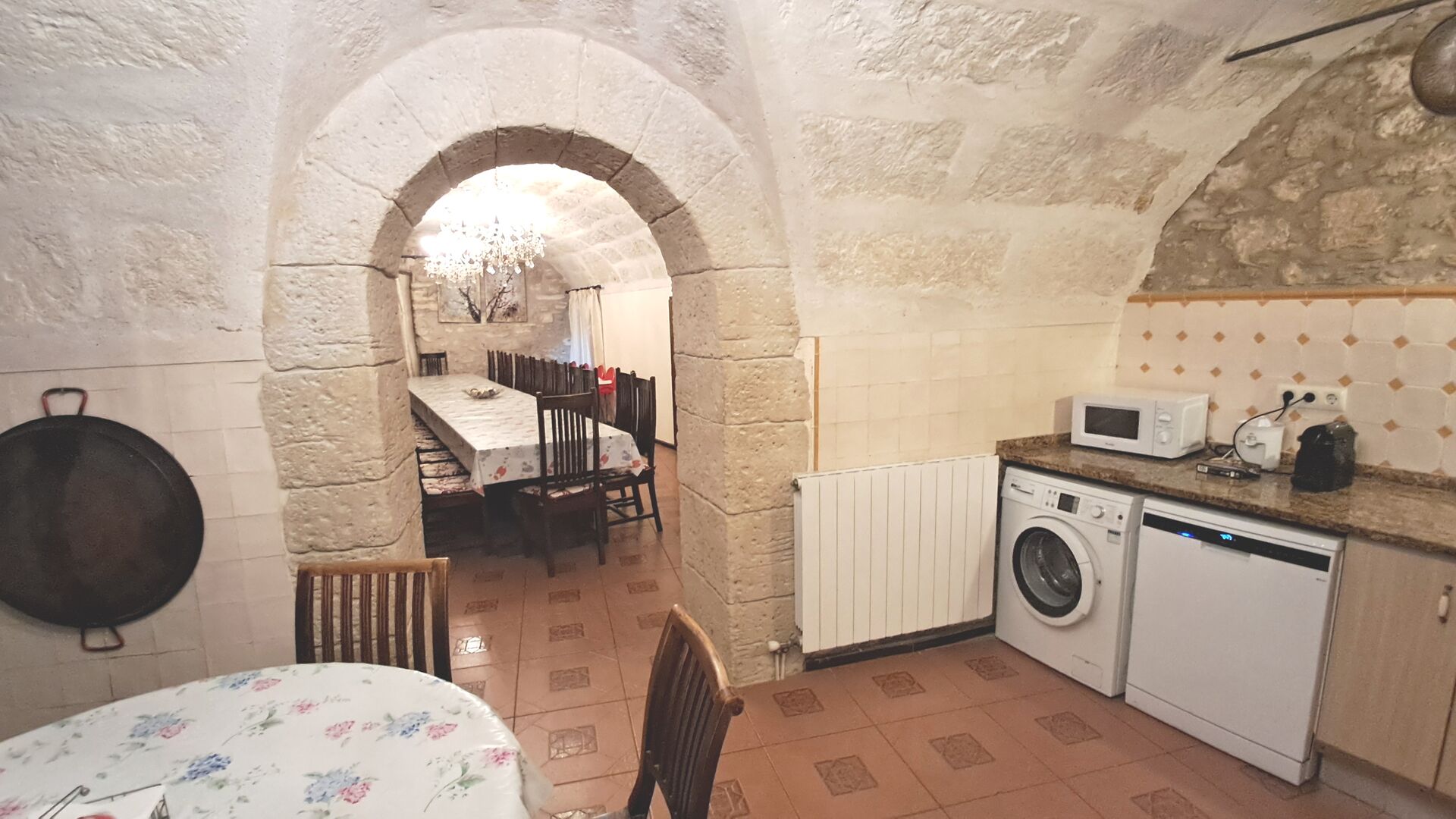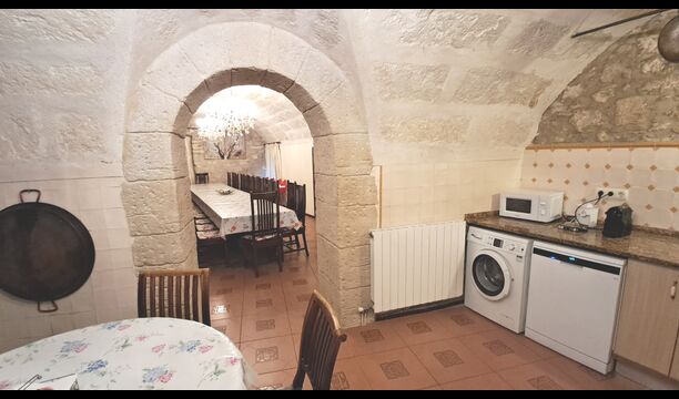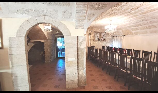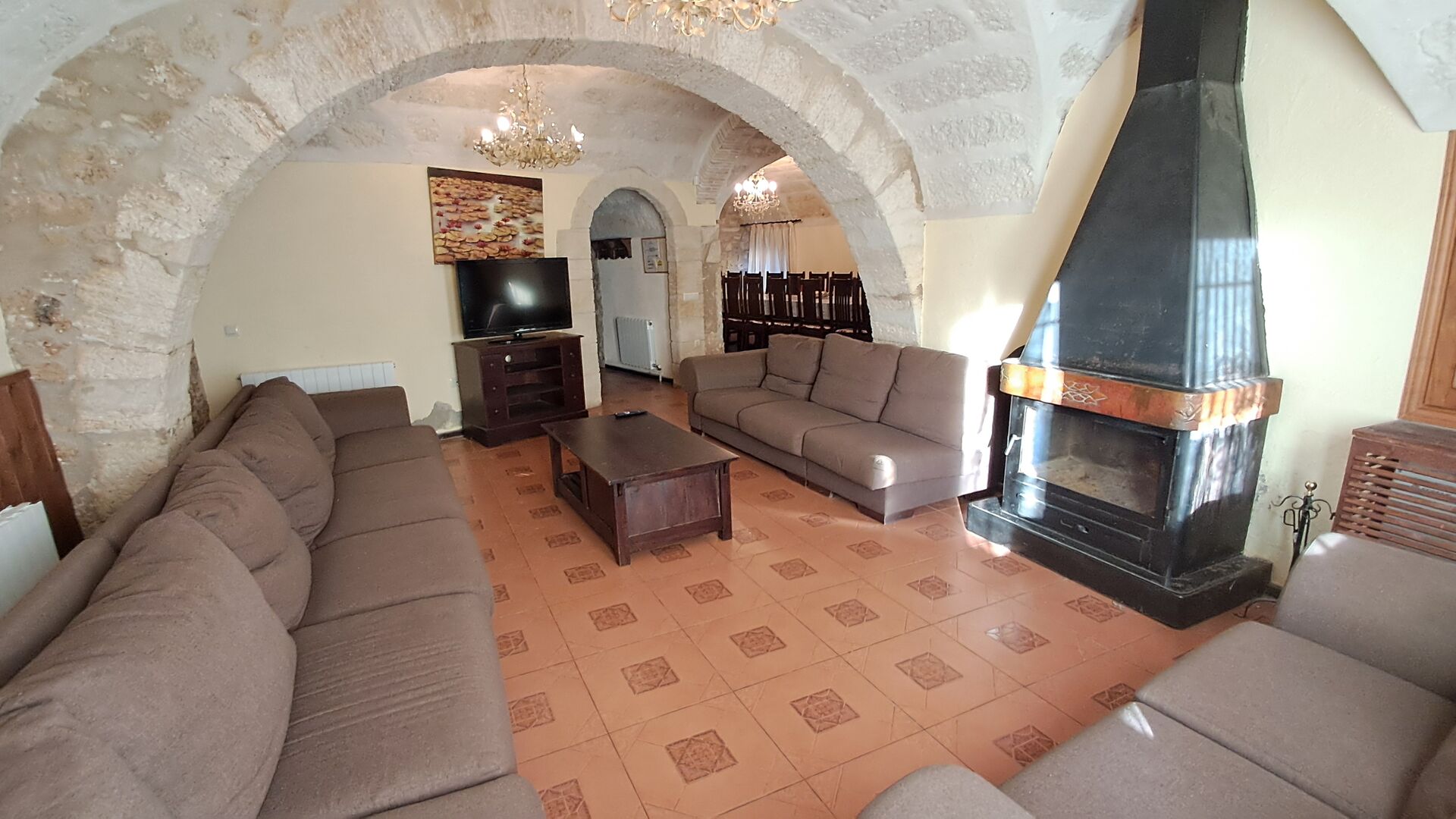 La maison est située à côté de la grande église de la ville et vous entrez dans la maison de vacances directement depuis la magnifique place de l'église. Lorsque vous entrez dans la Masia de las Flores, qui mesure 710 m2, vous rencontrez un beau salon avec de grands canapés confortables et une télévision à écran plat. L'intérieur de la maison est très beau: le plafond incurvé et les belles portes cintrées créent une atmosphère agréable et spacieuse. Ici, au rez-de-chaussée, il y a aussi une cuisine et une longue table à manger.