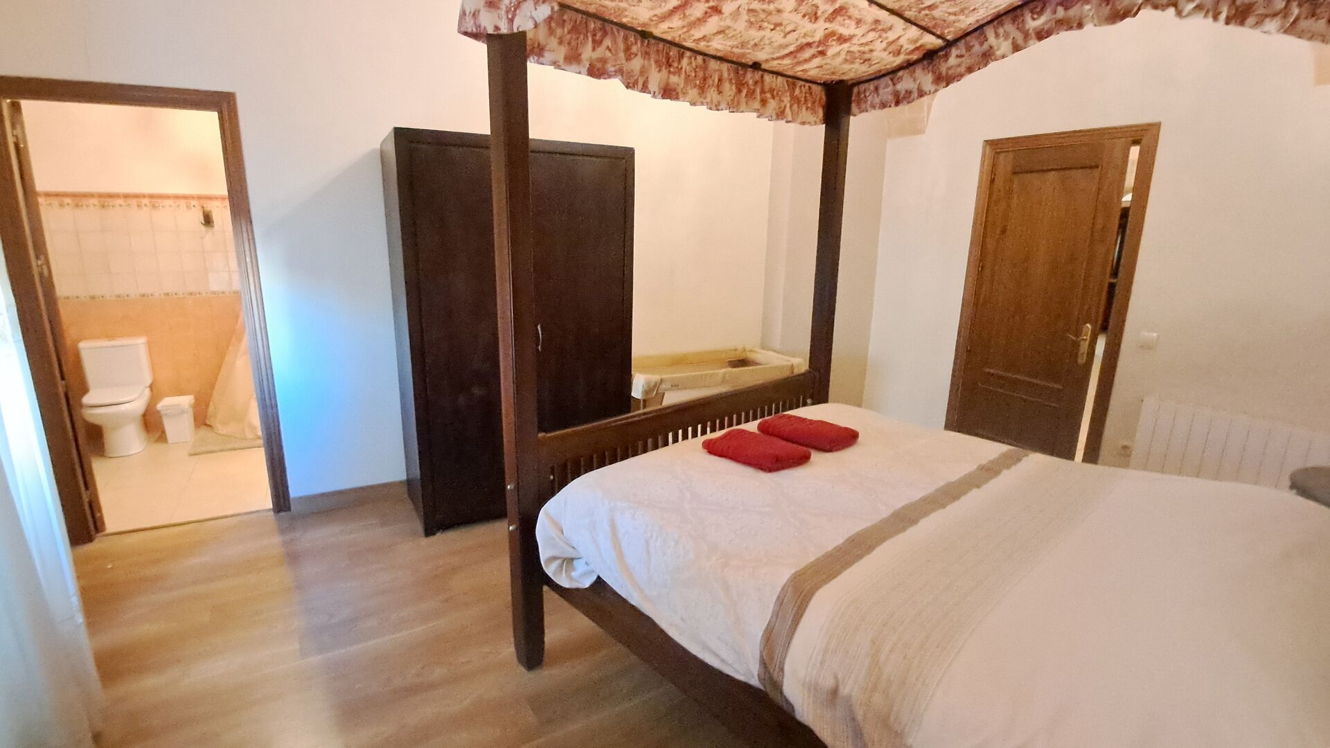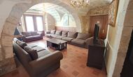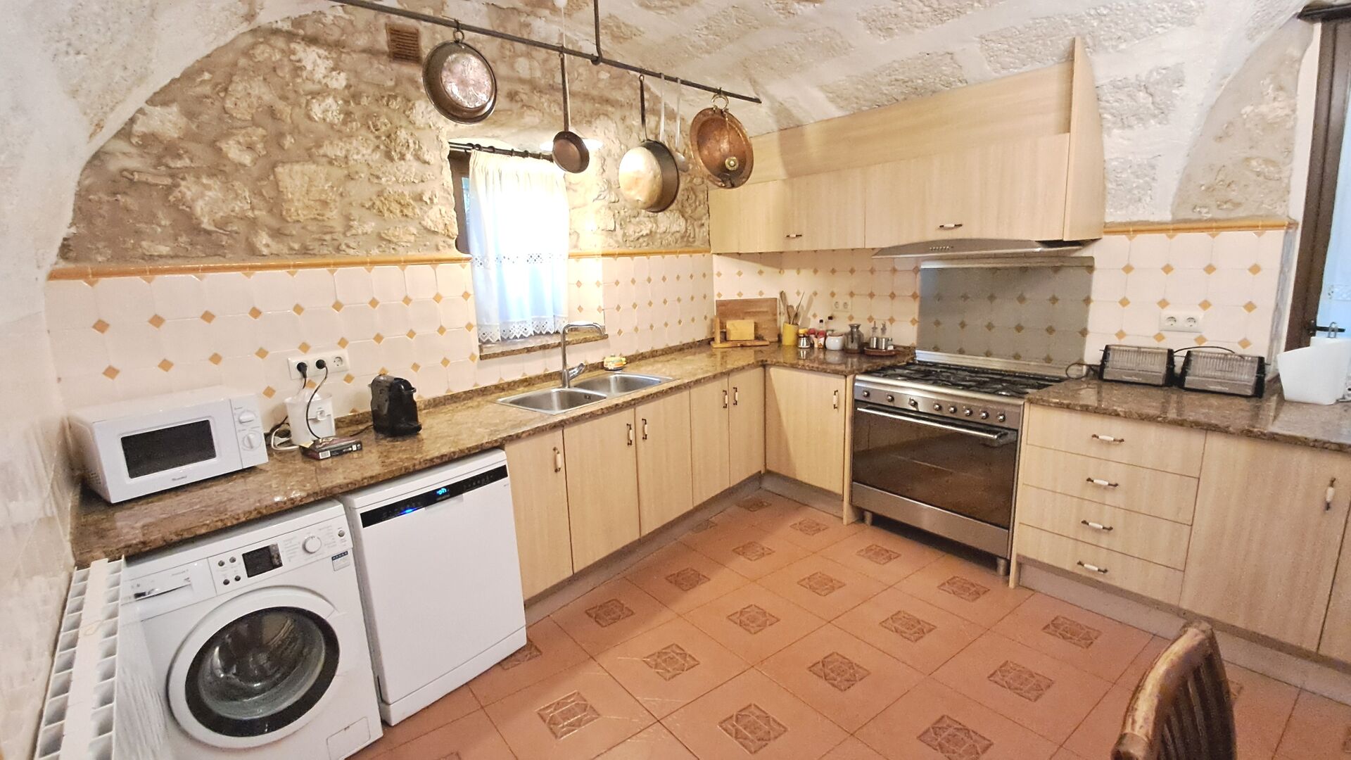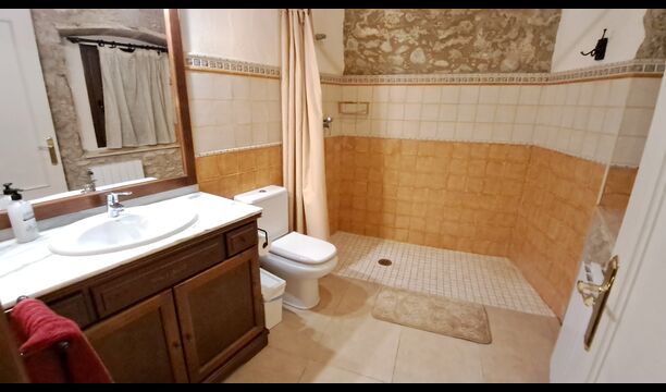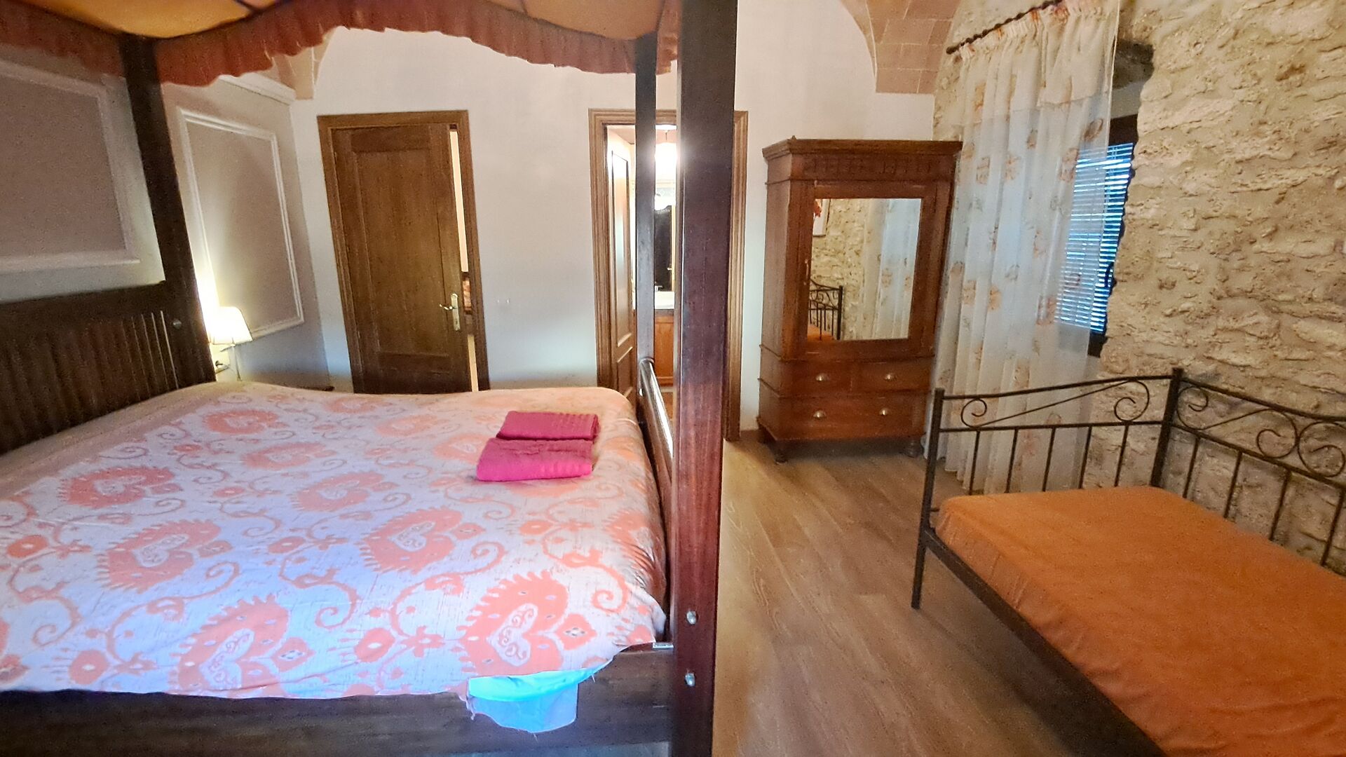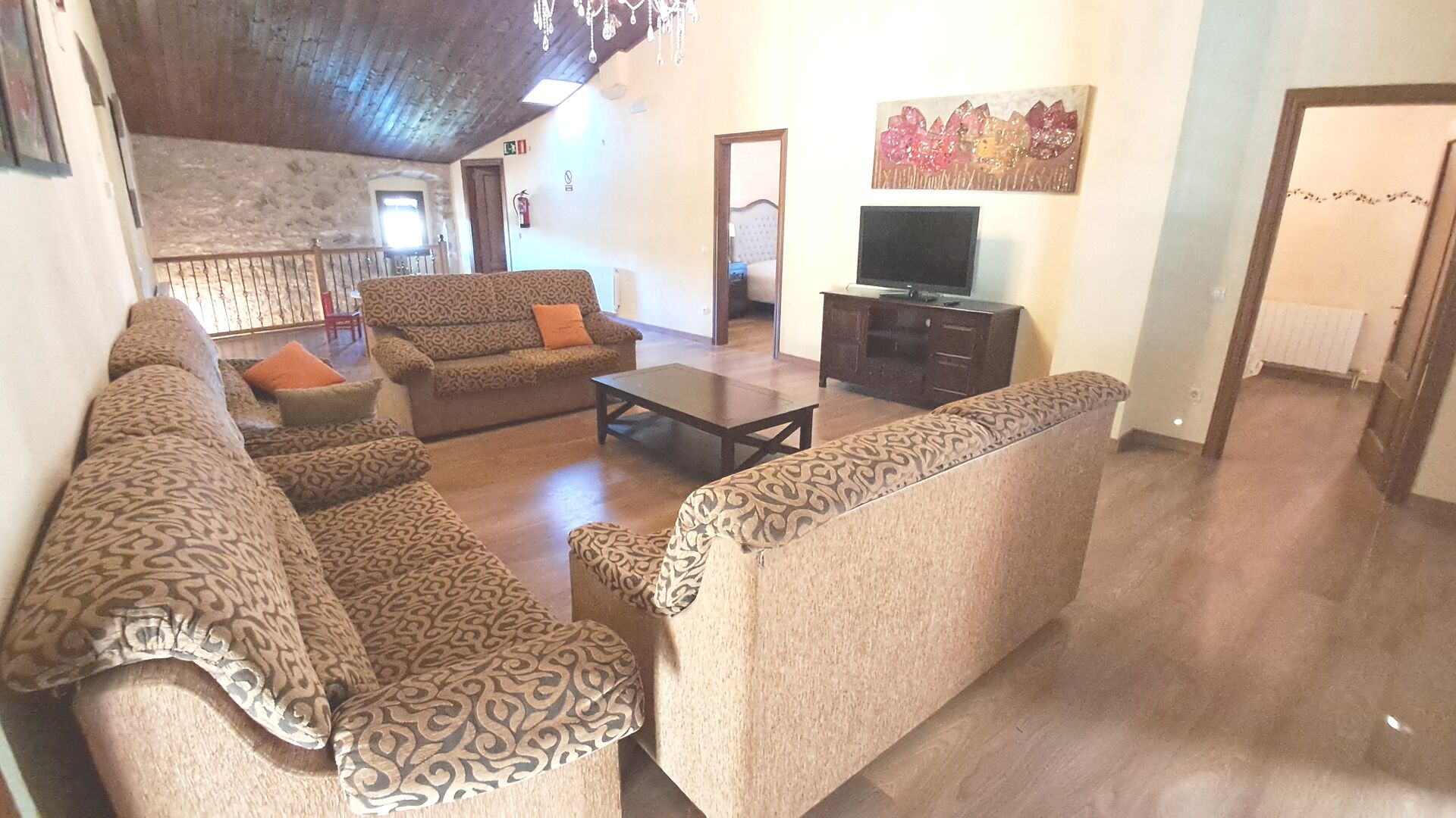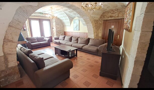 La maison est située à côté de la grande église de la ville et vous entrez dans la maison de vacances directement depuis la magnifique place de l'église. Lorsque vous entrez dans la Masia de las Flores, qui mesure 710 m2, vous rencontrez un beau salon avec de grands canapés confortables et une télévision à écran plat. L'intérieur de la maison est très beau: le plafond incurvé et les belles portes cintrées créent une atmosphère agréable et spacieuse. Ici, au rez-de-chaussée, il y a aussi une cuisine et une longue table à manger.