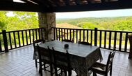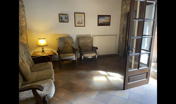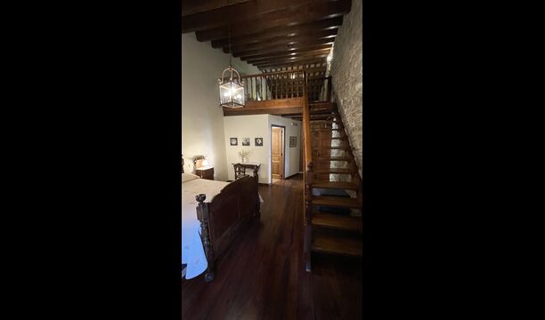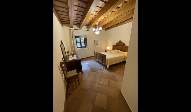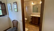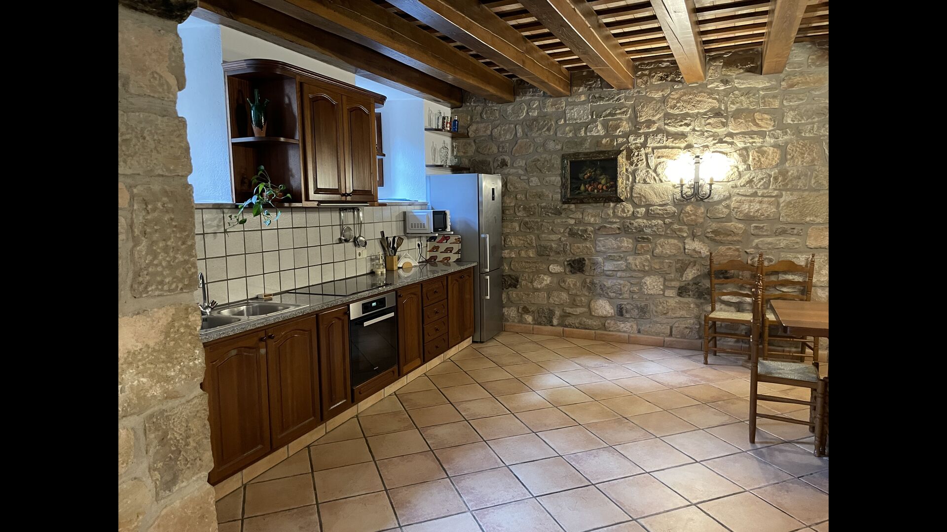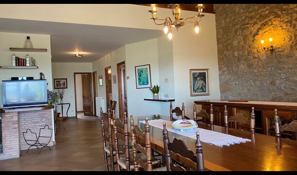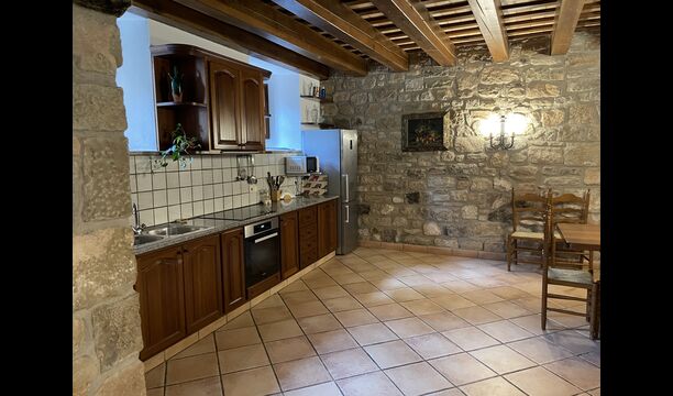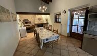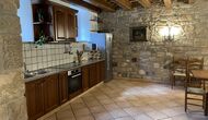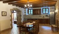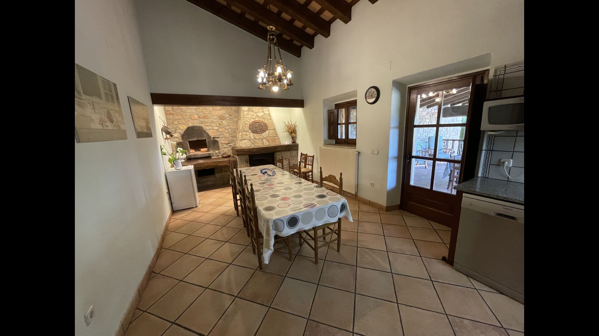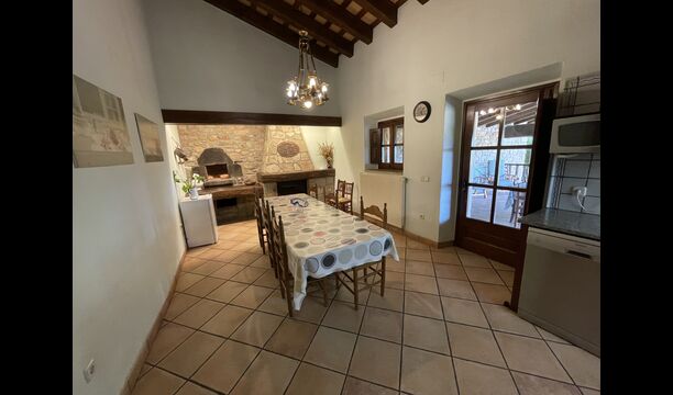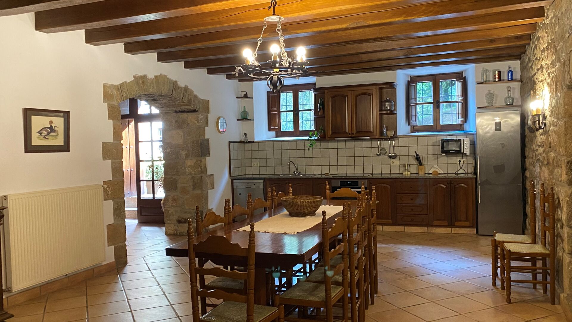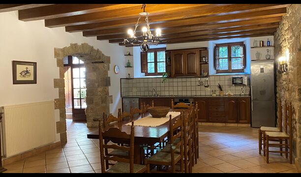De l'autre côté de la maison, également au premier étage, vous entrez dans l'unité “Exida”. La première salle est une grande salle commune avec une table à manger double, un WC. Il y a une salle à manger et une autre cuisine entièrement équipée avec lave-vaisselle, four, plaques chauffantes, micro-ondes, etc. Comme décoration, l'ancien four encastré dans le mur pour faire du pain a été préservé.