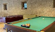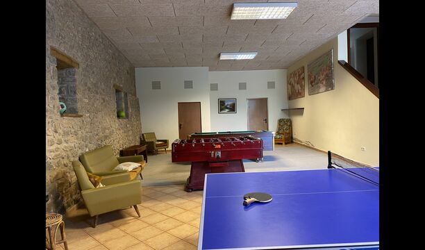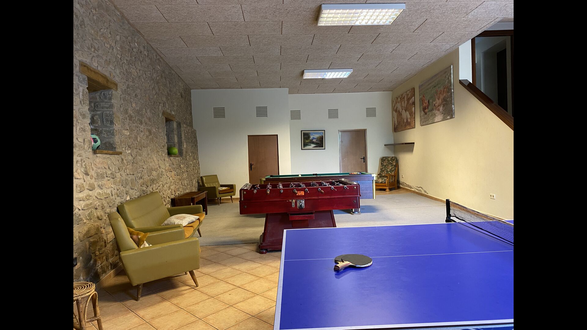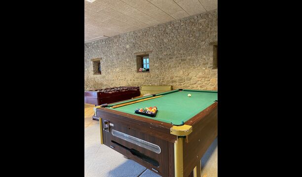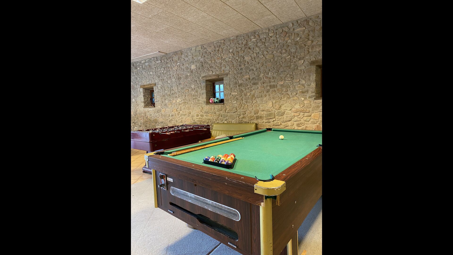 Au rez-de-chaussée, vous trouverez une salle d’activités avec une table de ping-pong, un billard et un baby-foot, ainsi qu’un local de stockage doté de 3 machines à laver, de 3 lits bébés et d’une chaise haute.