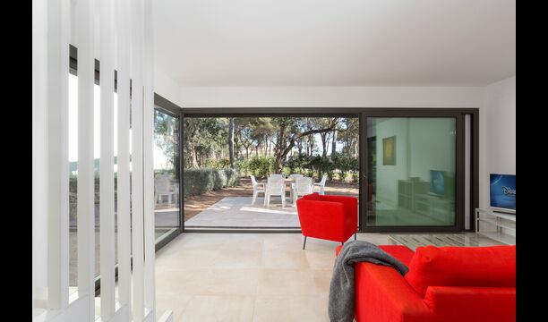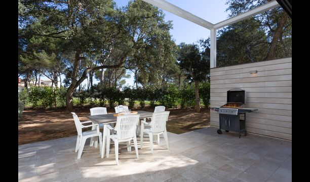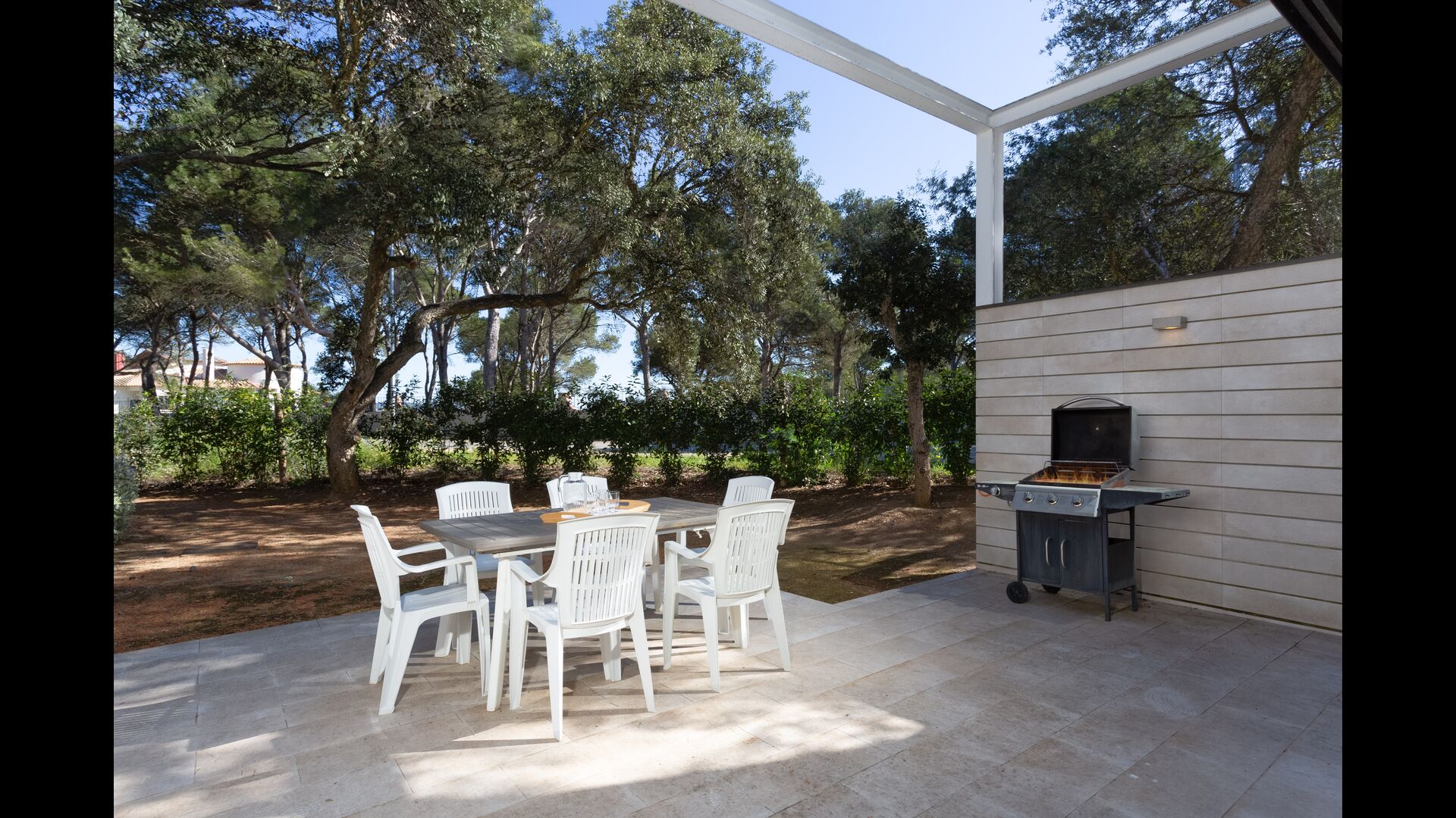 La maison est meublée de canapés etc. pour 4 personnes, mais il est également possible de rester plus de 4 personnes. En ce qui concerne les installations extérieures, il y a deux transats sur la terrasse supérieure, qui sont reliés à l'une des chambres. Il y a plusieurs transats au bord de la piscine commune.