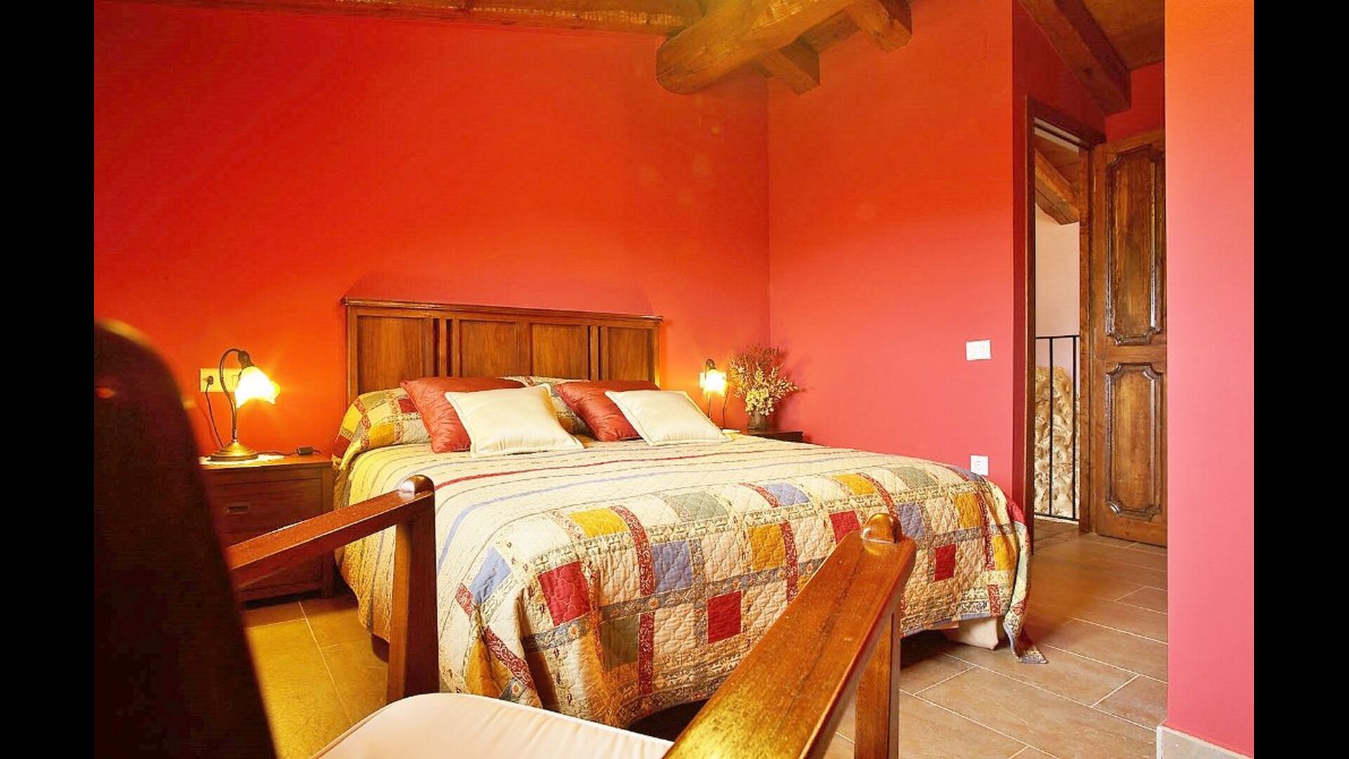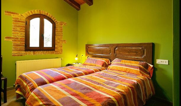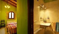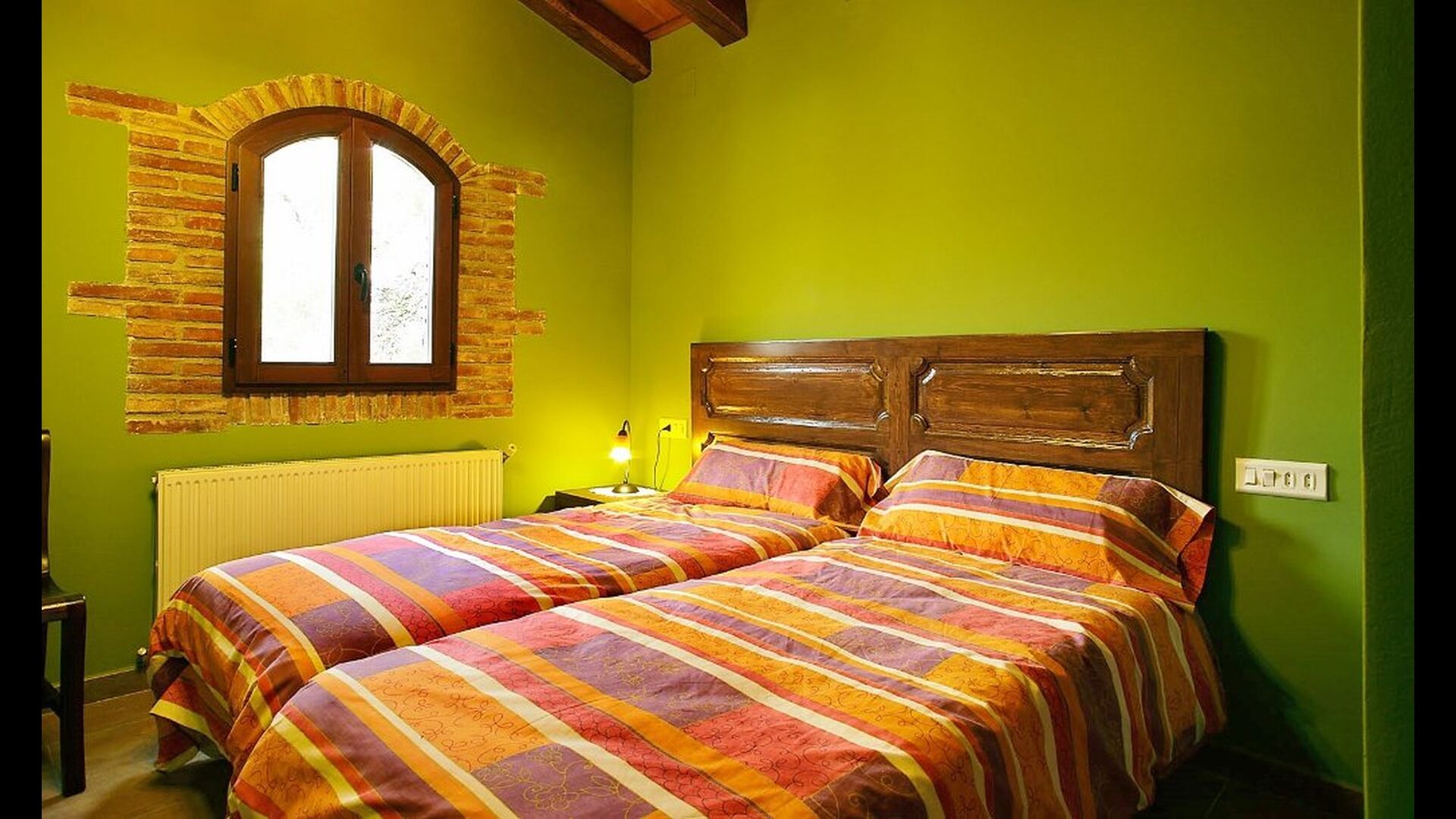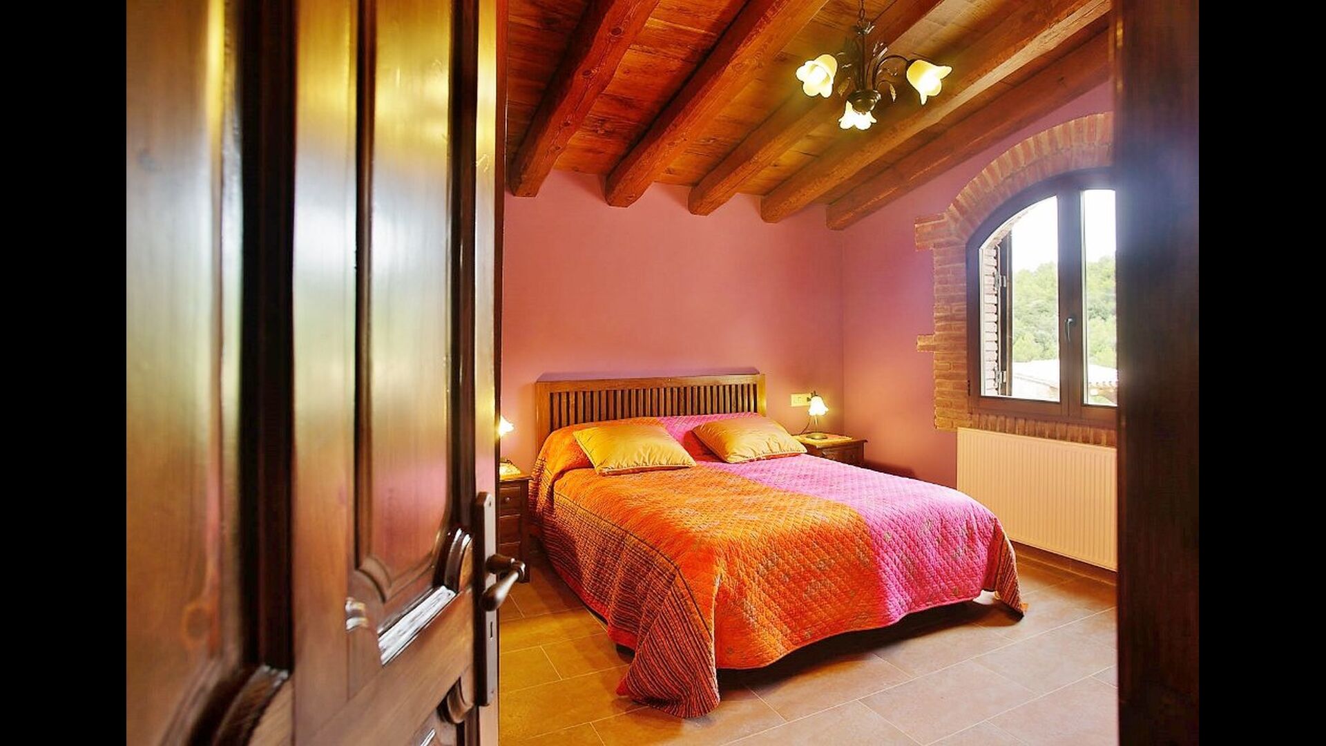 Chambre 1 : Chambre spacieuse avec vue sur la montagne de Morral et le jardin, avec salle de bain privative et un lit d'appoint, plafonds décorés d'anciennes cuves de vin en chêne.