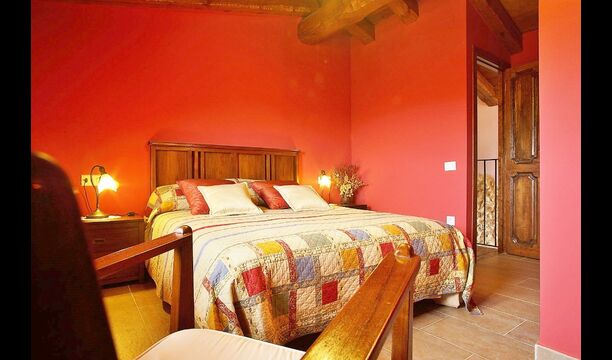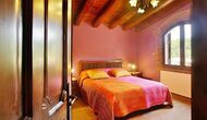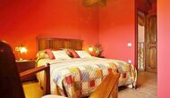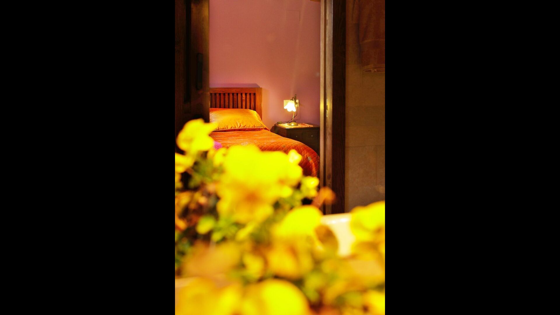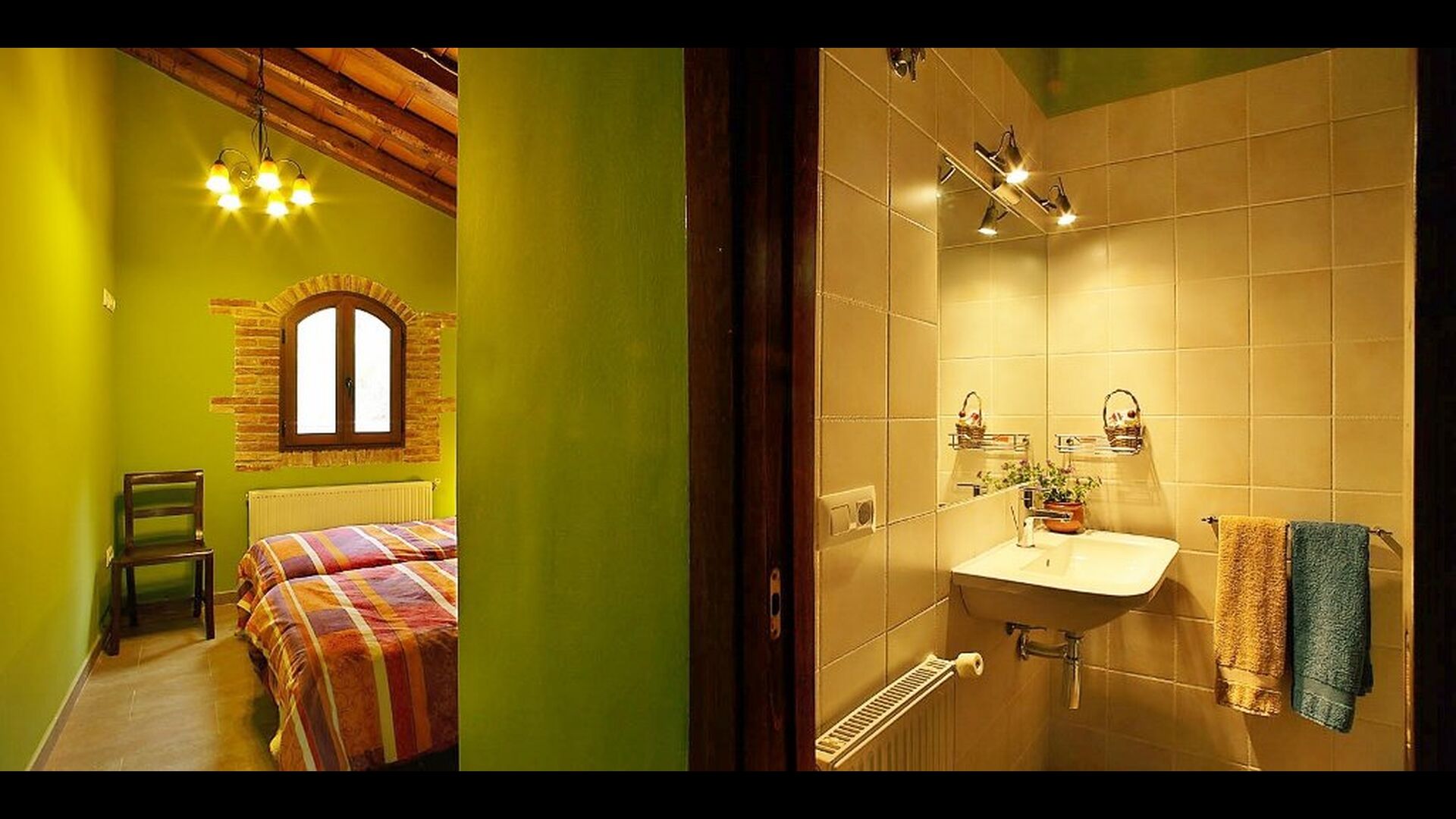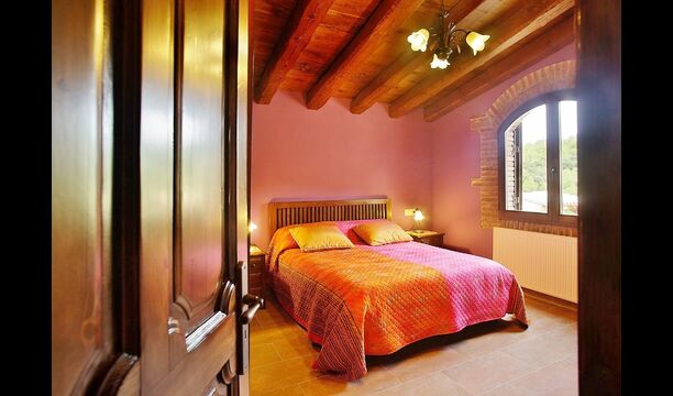 Chambre 1 : Chambre spacieuse avec vue sur la montagne de Morral et le jardin, avec salle de bain privative et un lit d'appoint, plafonds décorés d'anciennes cuves de vin en chêne.