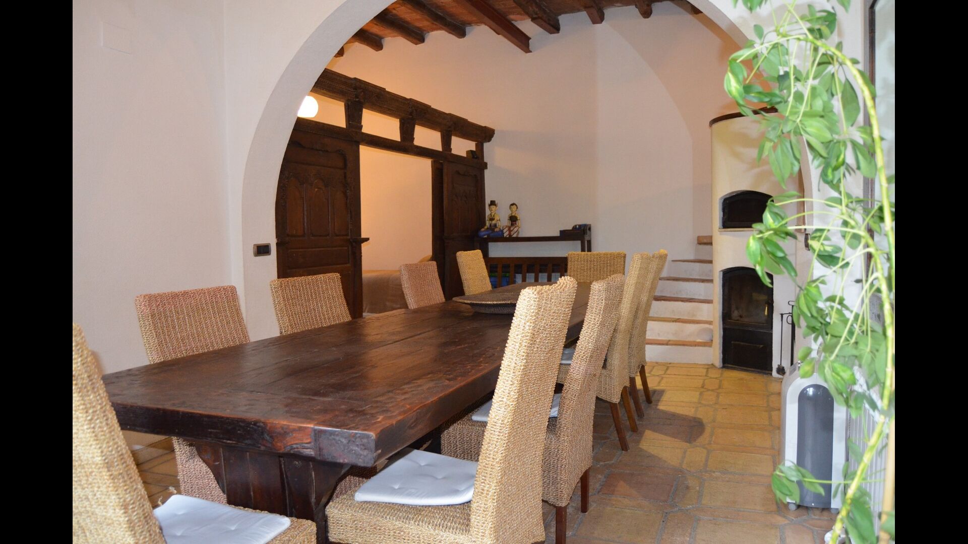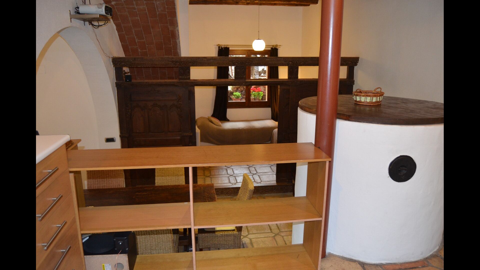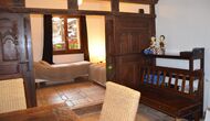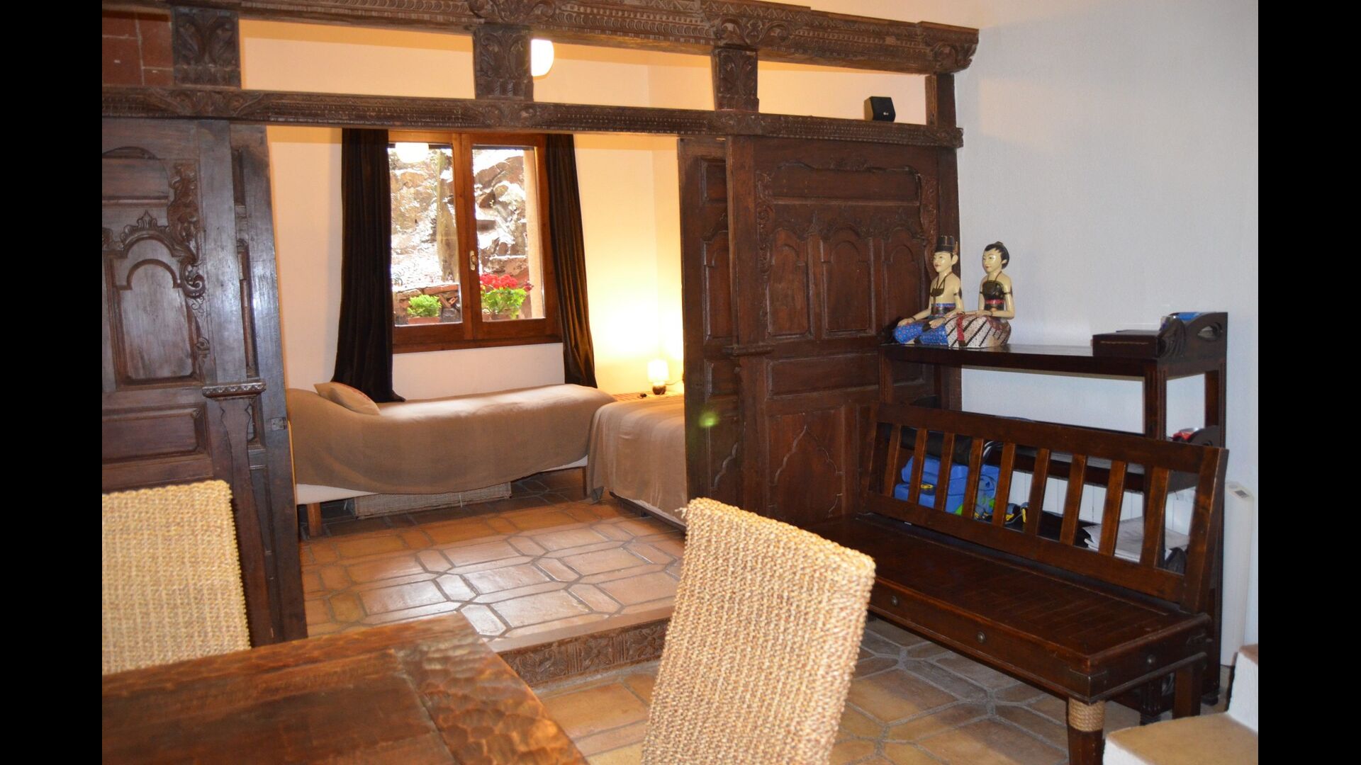 The ground floor has 2 double bedrooms, a bathroom and a large dining or meeting room with space for 15 people, a masonry stove and an open kitchen with access to the garden. This room has a projector and homecinema equipment. One of the bedrooms is oriental inspired and closes with an original wooden sliding door, beautifully carved in Indonesia.