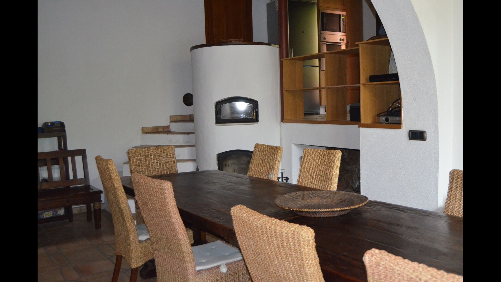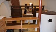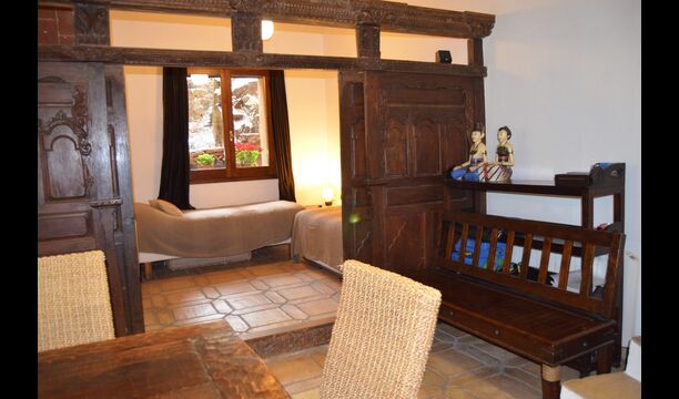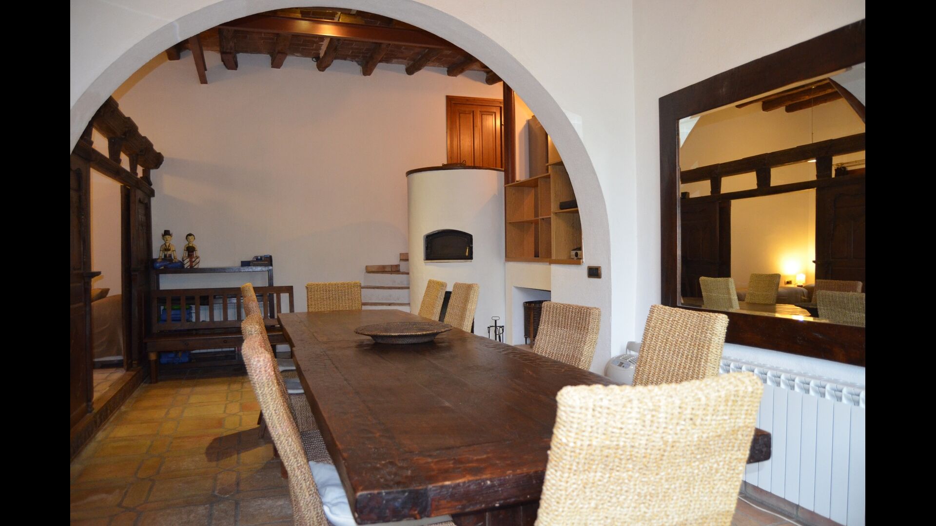 The ground floor has 2 double bedrooms, a bathroom and a large dining or meeting room with space for 15 people, a masonry stove and an open kitchen with access to the garden. This room has a projector and homecinema equipment. One of the bedrooms is oriental inspired and closes with an original wooden sliding door, beautifully carved in Indonesia.