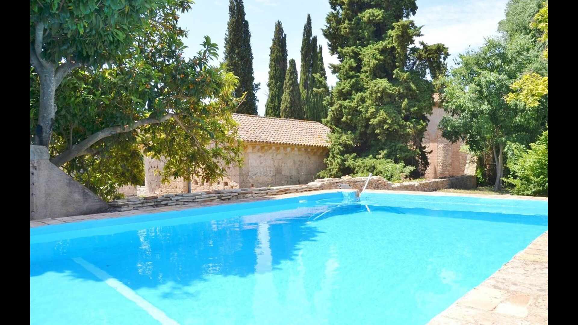 Le jardin n'est pas un jardin de fleurs classique, mais un jardin plusauthentique avec de grands arbres anciens. A l'autre extrémité du long jardin, vous trouverez la piscine de la maison. Ici, les propriétaires ont fait preuve d'imagination : la maison étant classée monument historique, ils n'ont pas été autorisés à construire une piscine complète. Au lieu de cela, ils ont choisi de transformer l'ancien bassin d'eau en piscine, ce qui signifie que l'eau de la piscine est de l'eau naturelle des montagnes et que l'eau excédentaire s'écoule plus loin vers une fontaine dans le jardin. Une grande porte menant à la piscine peut être fermée afin que les petits enfants ne puissent pas y entrer sans la surveillance des parents. Si vous souhaitez une piscine plus grande - peut-être pour nager dans des couloirs - il y a une piscine publique dans le village, à seulement 800 m.