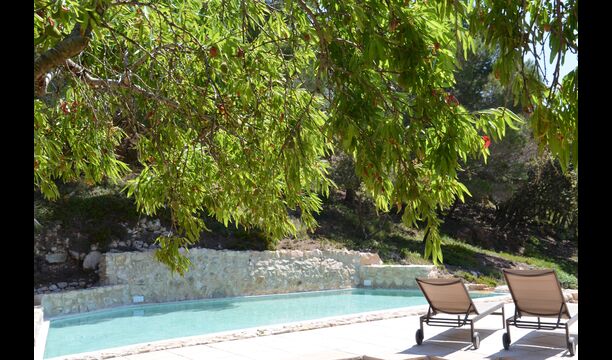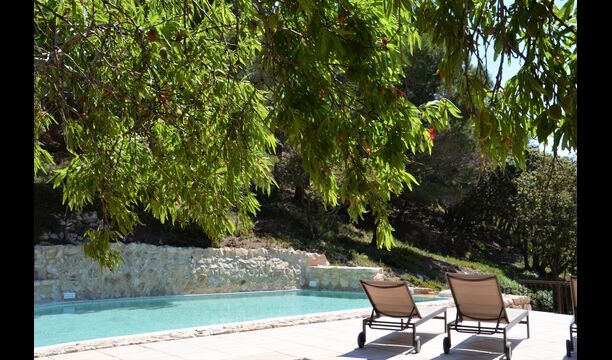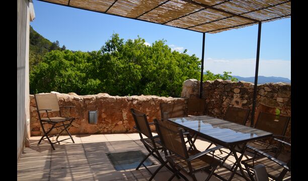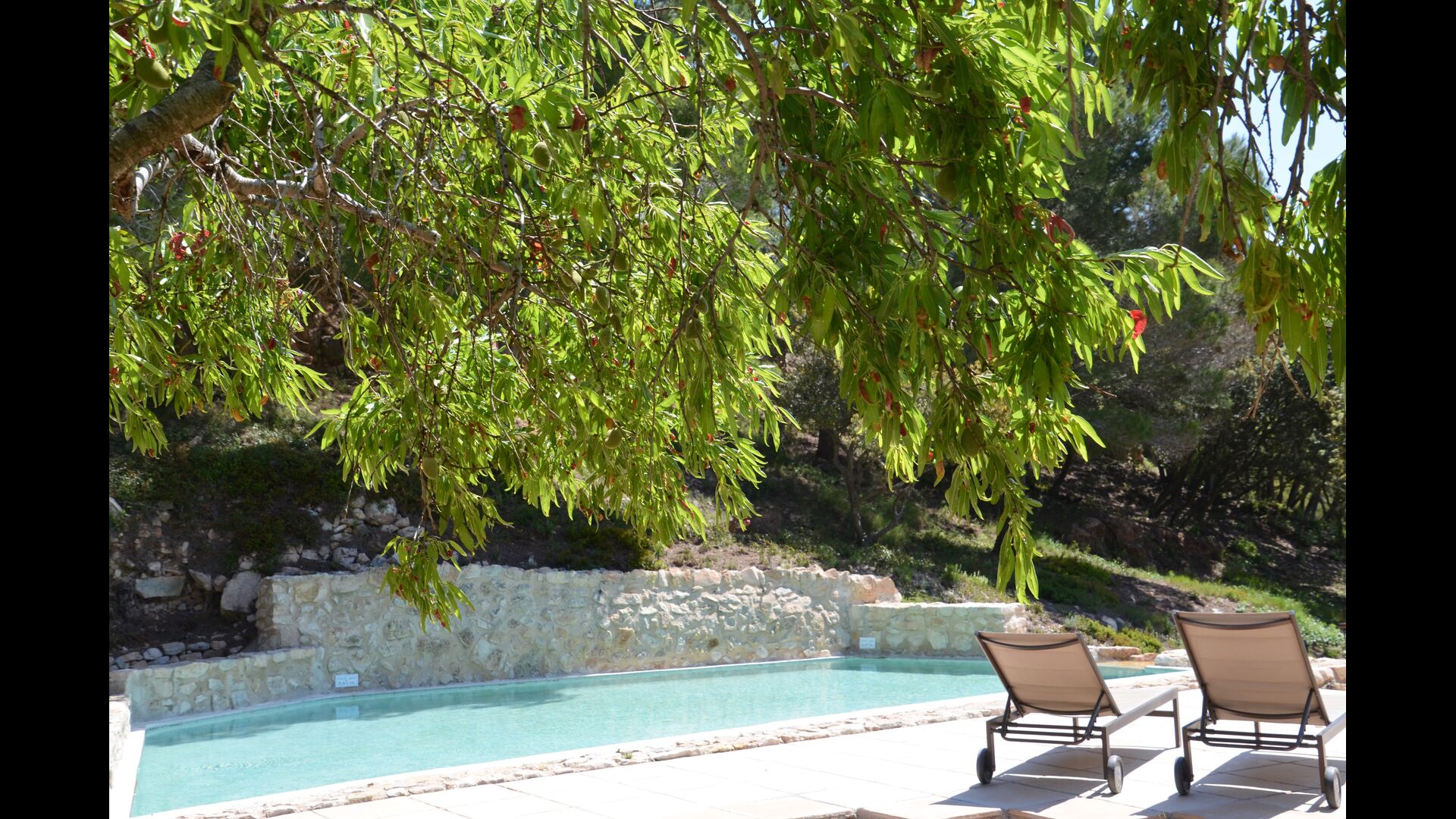 Au bord de la piscine, il y a une terrasse où vous pourrez vous détendre. S'il fait trop chaud, il suffit de déplacer la table sous les amandes pour trouver de l'ombre. La situation de la piscine, rend la vue impressionnante, avec des champs, des amandes et du vin et avec la mer Méditerranée visible par temps clair.
