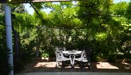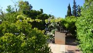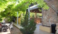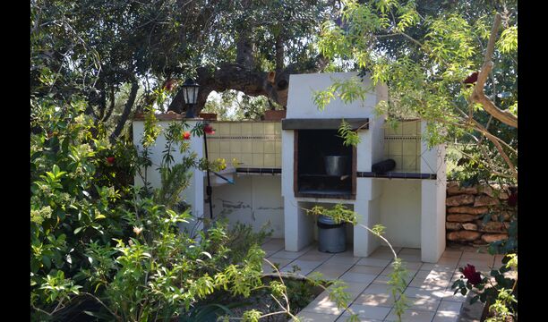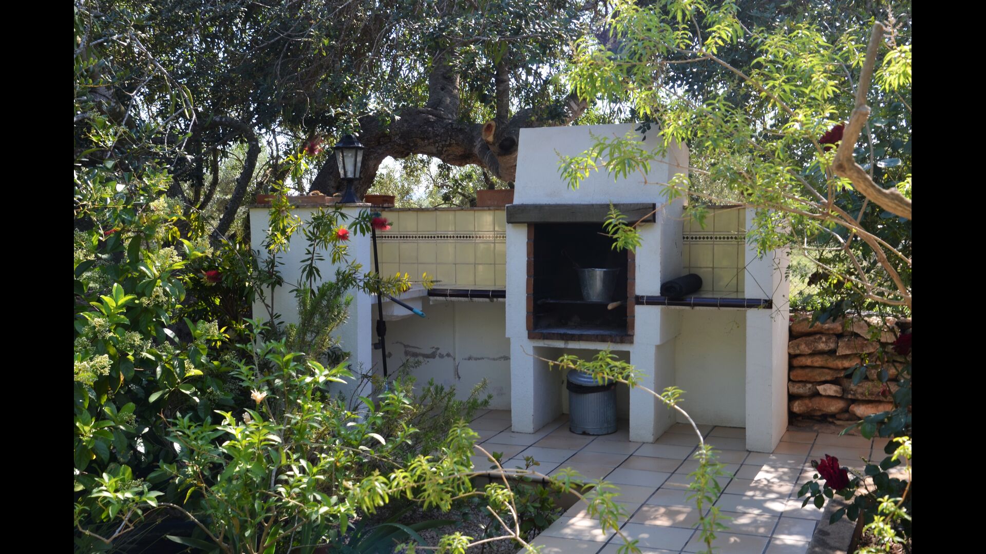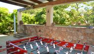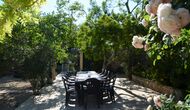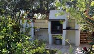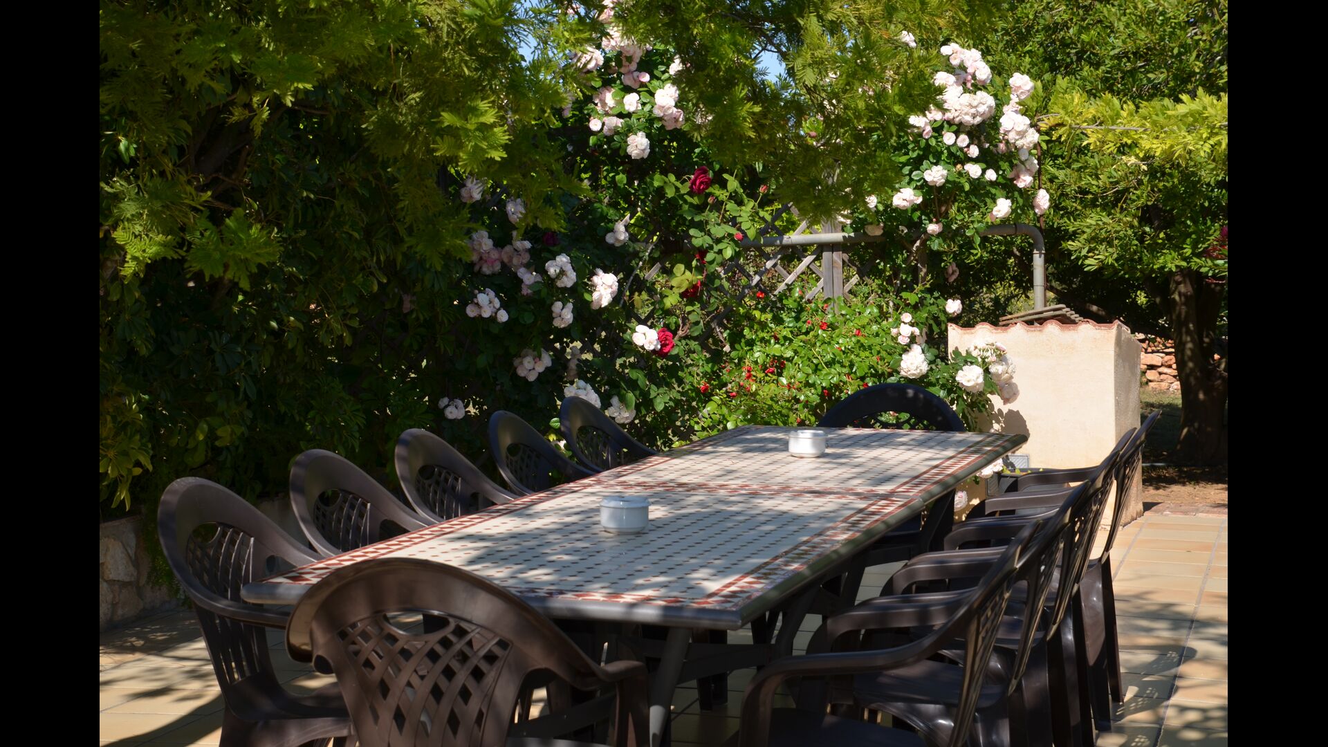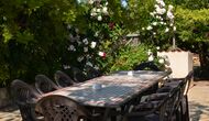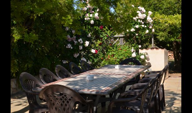 - Zone barbecue avec grande table en pierre placée sous l'ombre d'un gran noyer.