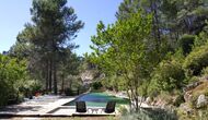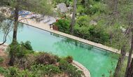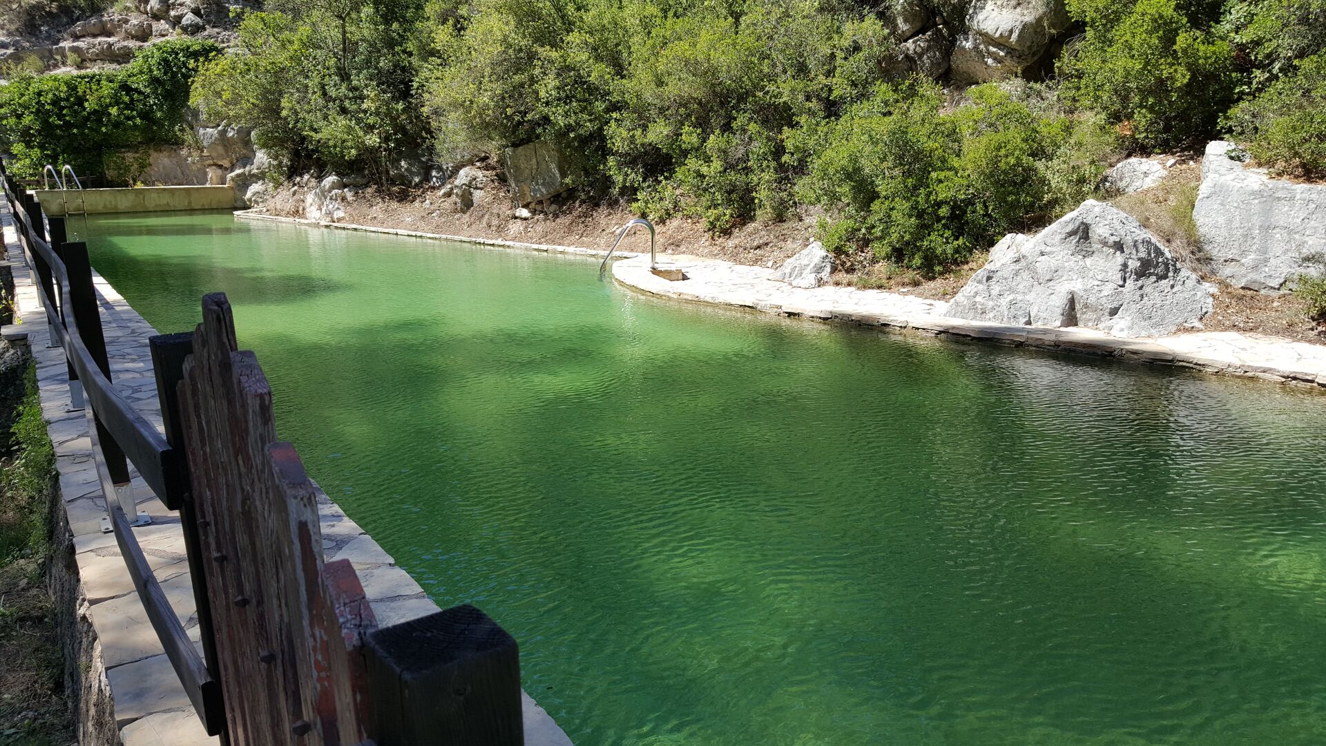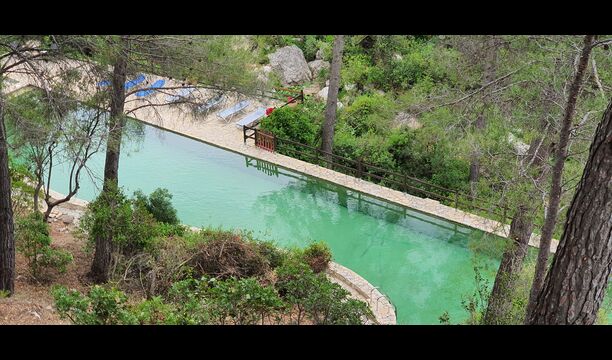 L'atmosphère extérieure est difficile à décrire avec des mots, car l'endroit est très spécial. La cascade donne de la fraîcheur et les rochers environnants donnent de nombreux coins ombragés et une impression de ne faire qu'un avec la nature. Les systèmes de canaux utilisés pour diriger l'eau afin de créer l'énergie nécessaire au moulin à eau ont été intelligemment conduits à un piscine, où cette eau propre, provenant directement de la source à quelques kilomètres de la maison, traverse la piscine de 45 mètres de longueur, puis à nouveau sur la rivière à l'autre bout. Vous pouvez également nager sous la cascade et à différents endroits de la rivière.