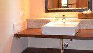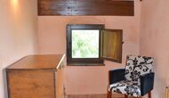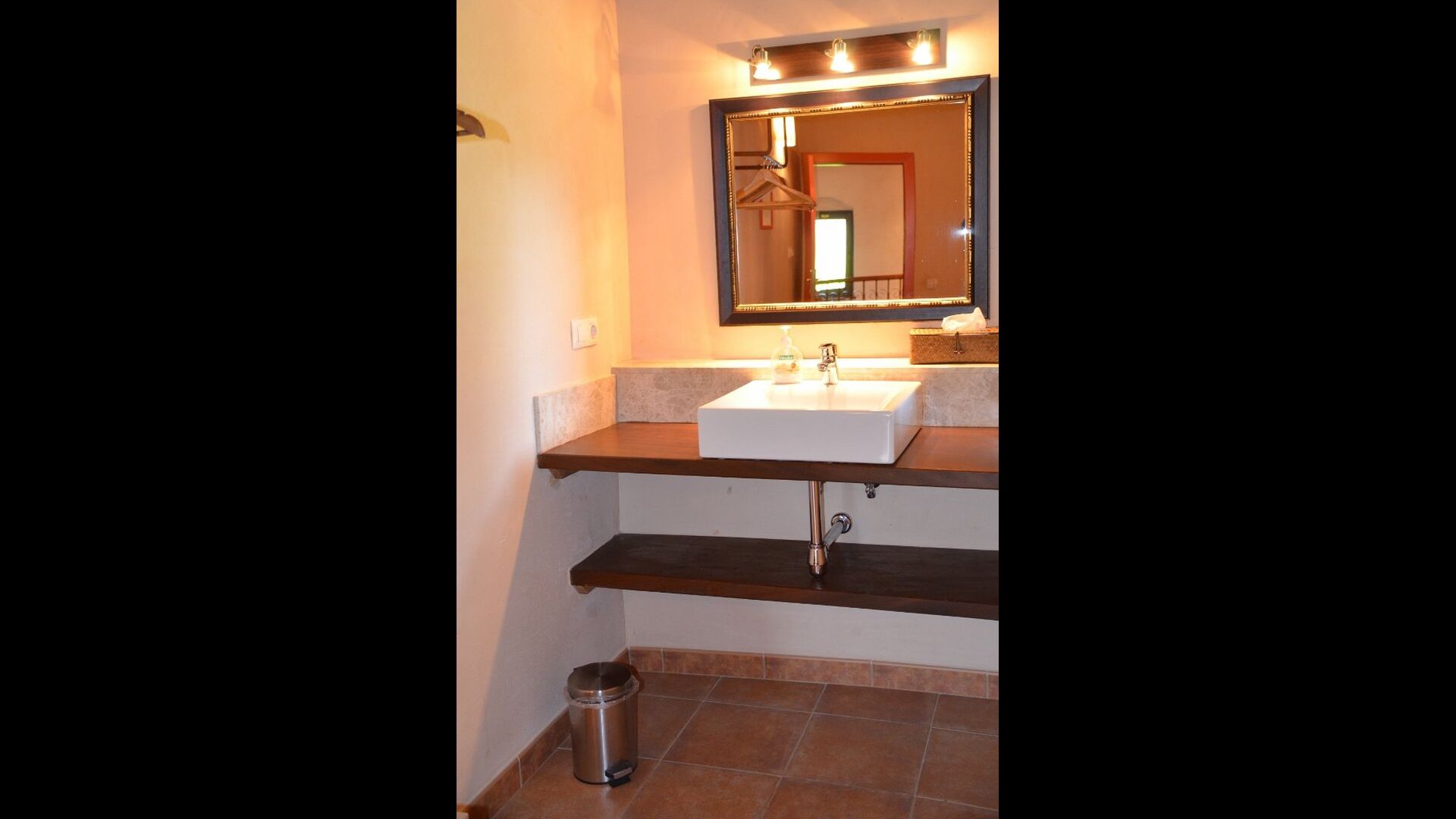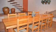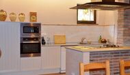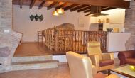 Depuis le patio, une porte mène à la belle salle commune de la maison de vacances, où tout le groupe de vacances peut être réuni au même moment. Voici un bel espace canapé et derrière la cuisine, deux marches, une table à manger oblongue. La cuisine a beaucoup d'outils et d'équipements tels que four, lave-vaisselle, réfrigérateur, congélateur et micro-ondes. Dans la cuisine, une partie du rocher fait saillie comme un détail de la maison. En outre, toutes les pièces de la maison, comme toutes les autres pièces de la maison, ont un beau plafond en bois avec des traverses.