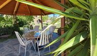De plus, il y a une petite annexe avec un futon, sous un plafond à demi-pointe. Cet espace est également directement accessible depuis le jardin, un espace qui offre un espace extérieur intimiste pour les repas et la détente.