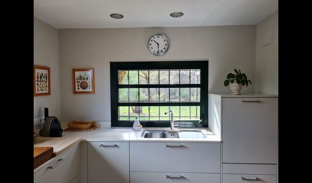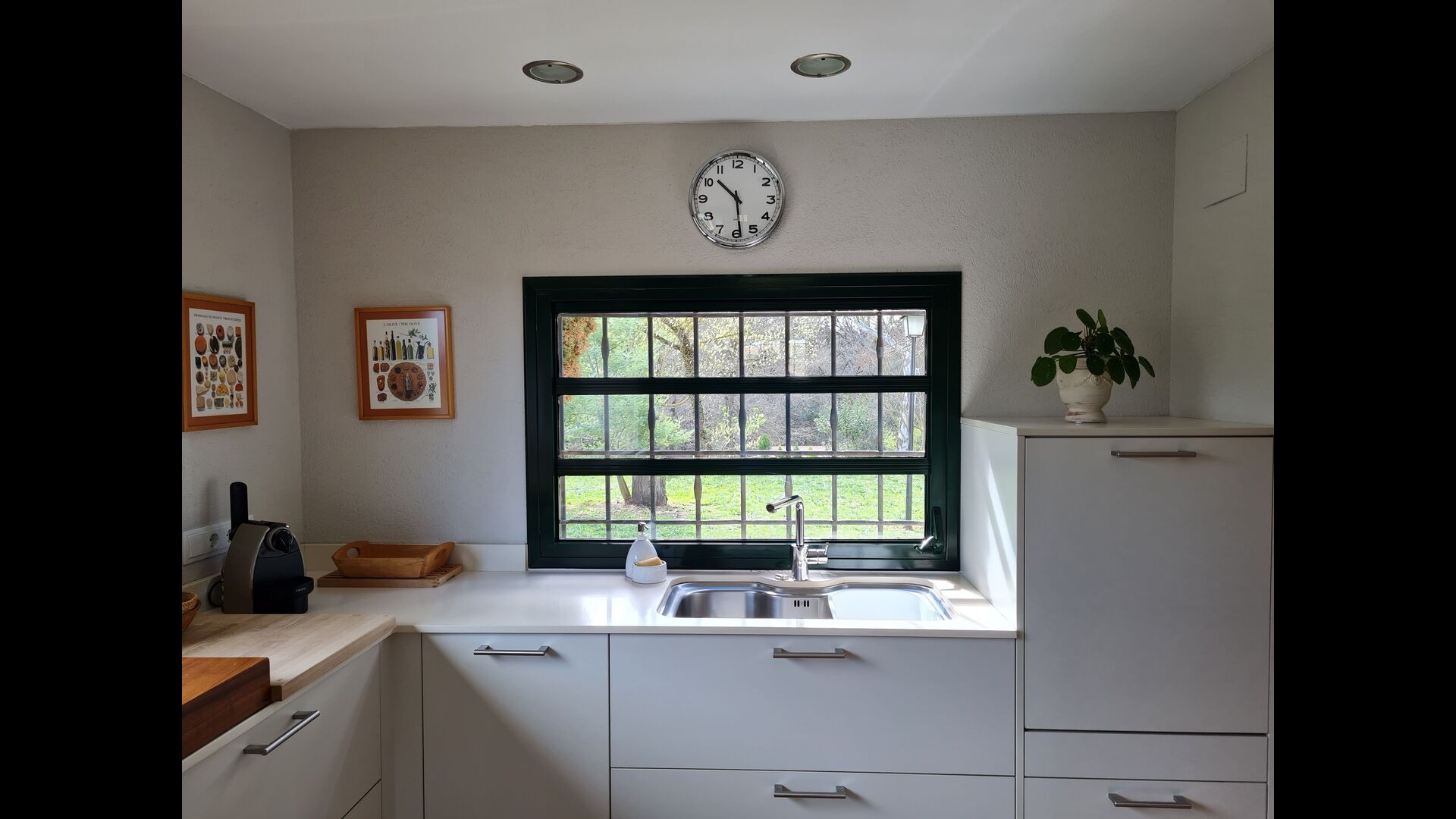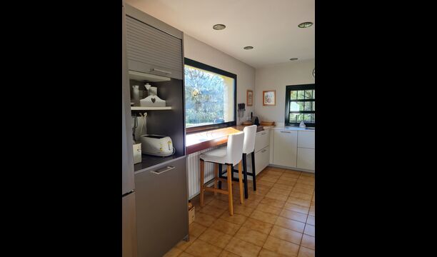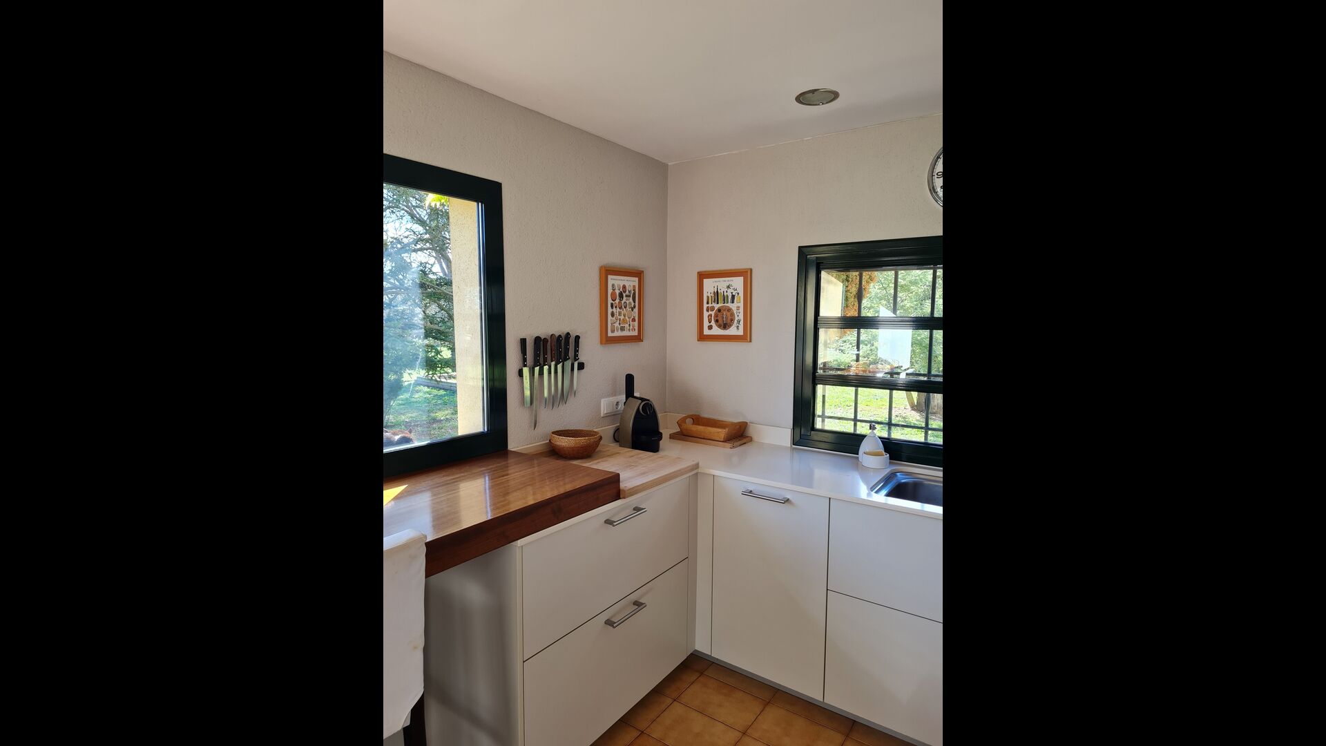 La maison dispose d’une spacieuse salle à manger, idéale pour les repas en famille, et d’une cuisine entièrement équipée avec de grandes fenêtres qui inondent l’espace de lumière naturelle et de chaleur.
