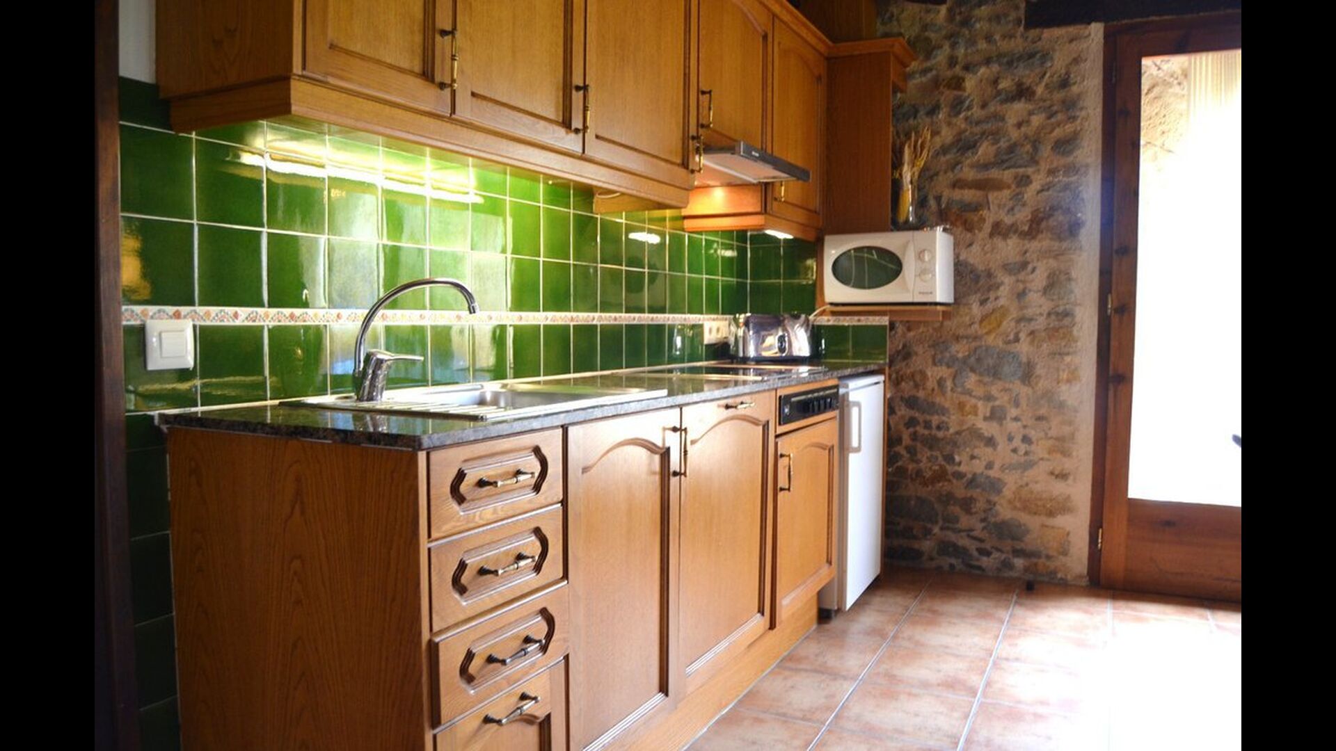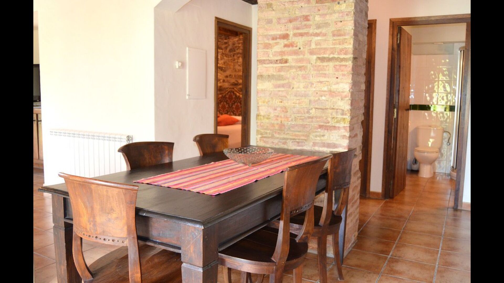 Casa Vermellas-Verde is a ground floor apartment. It has a private cosy covered terrace in front of the entrance. One enter the common room, where there is a sofa corner with leather furniture facing the flat-screen TV and a dining table of massive woods and matching chairs. Next, the kitchen with ceramic hotplates, oven, dishwasher, fridge, microwave and toaster. There are 2 double bedrooms, one of them with double bed and one with two single beds. For families with small children, there is a cot and a high chair available. This authentic and high quality rural apartment is as well equipped with WIFI internet.