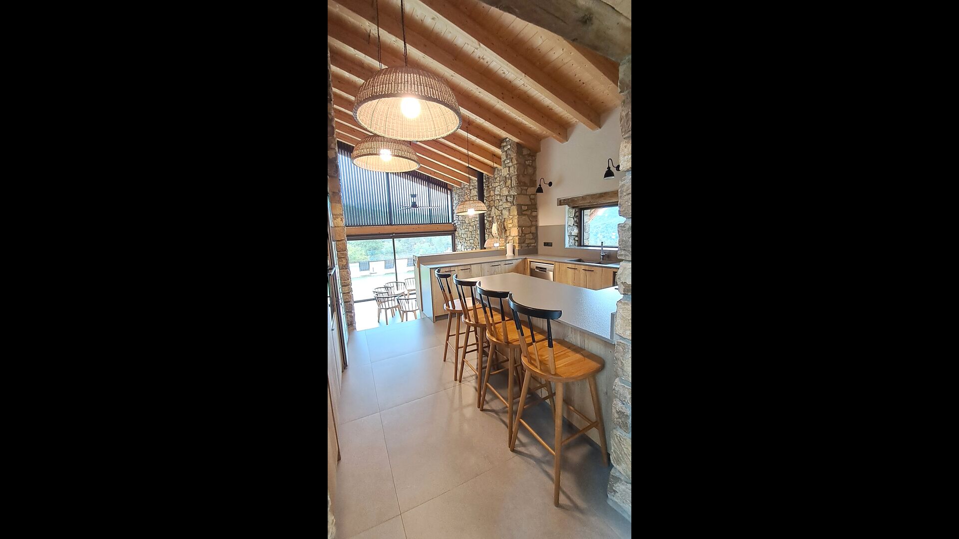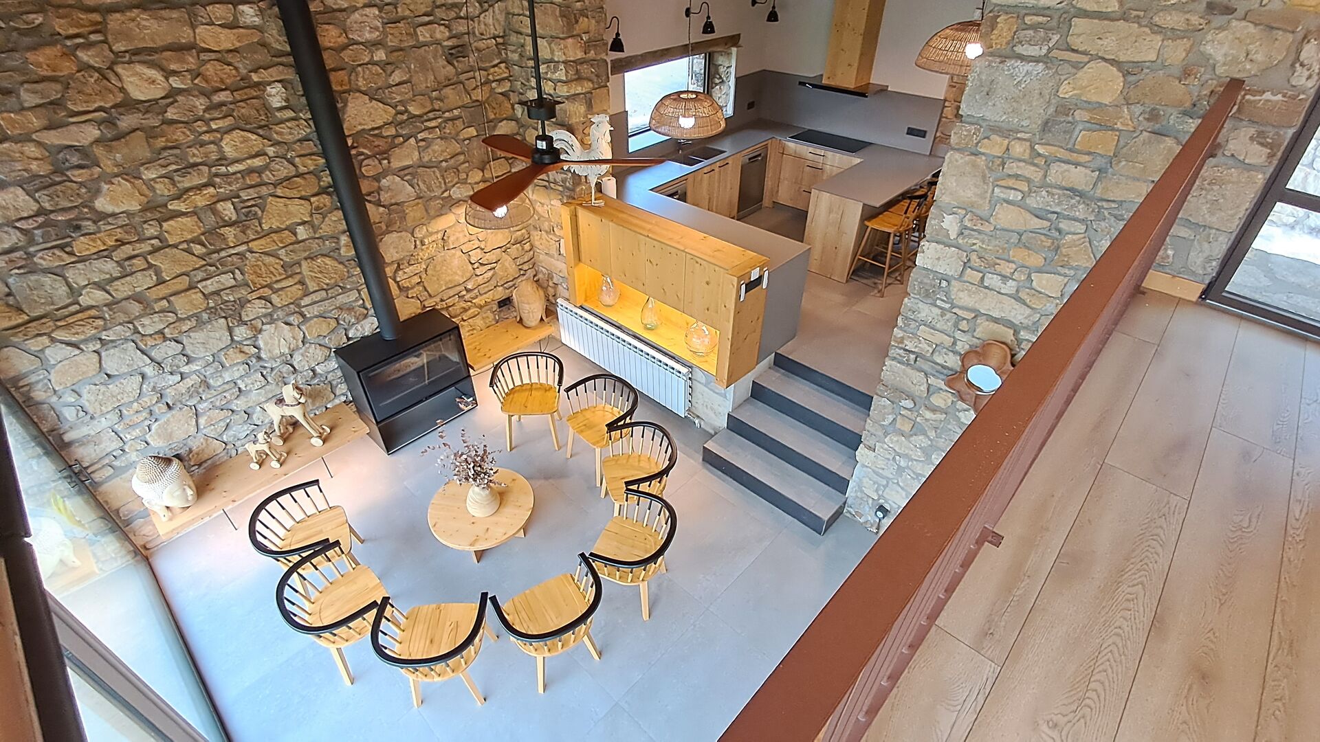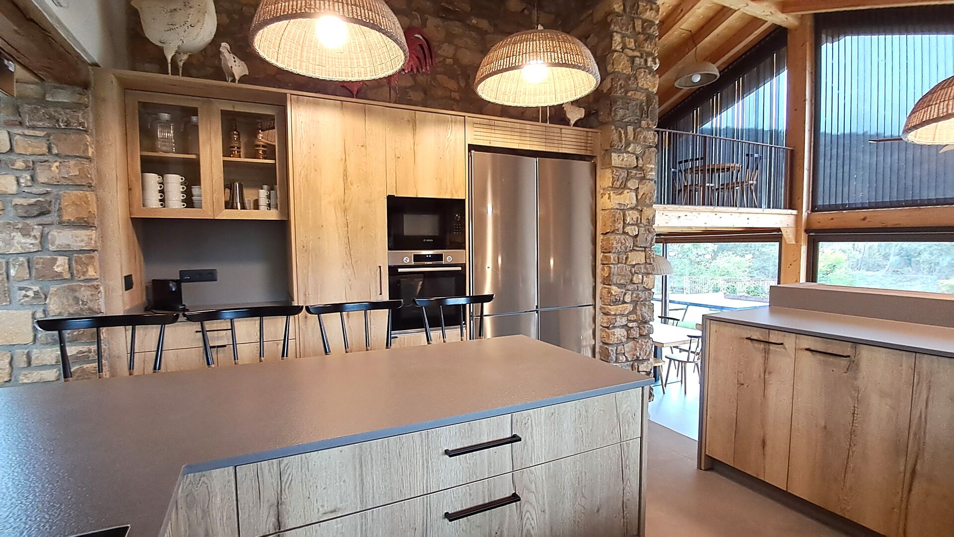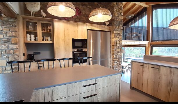 À l'intérieur, un élégant salon avec cheminée, un espace de vie chaleureux alliant charme rustique et confort moderne. À l'autre extrémité de la maison, une magnifique salle à manger design, attenante à une grande cuisine entièrement équipée, vous invite à la détente. Directement accessible, la terrasse et la piscine vous permettent de manger aussi bien à l'intérieur qu'à l'extérieur, selon vos envies et la météo.