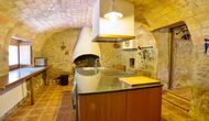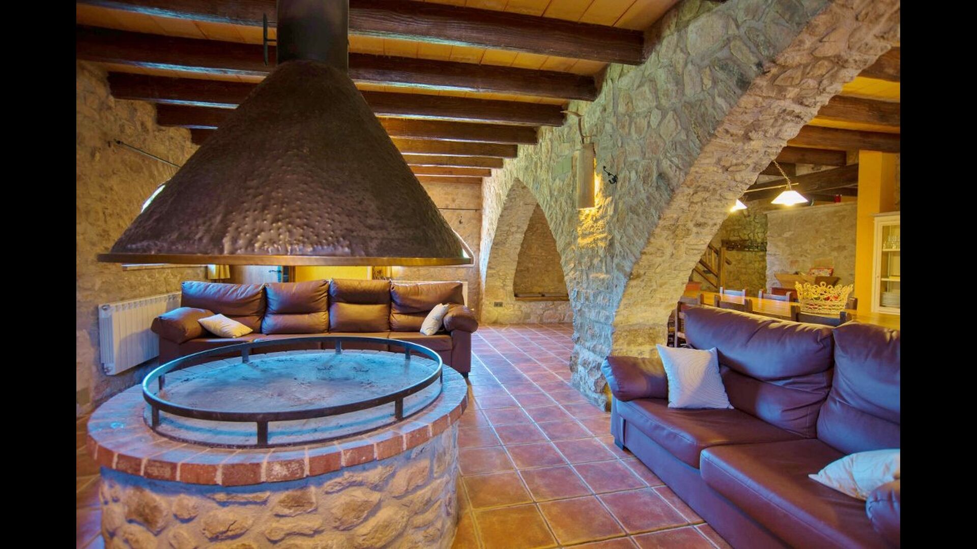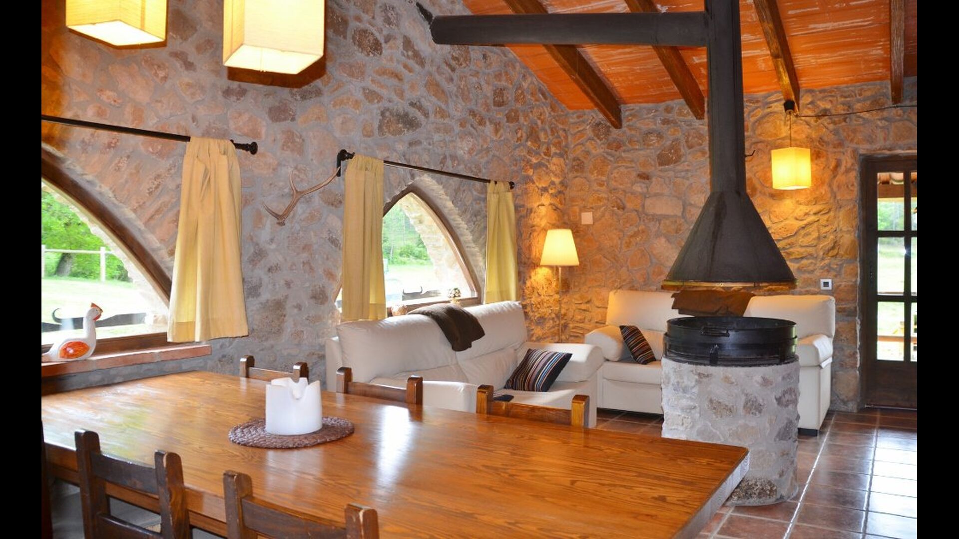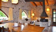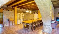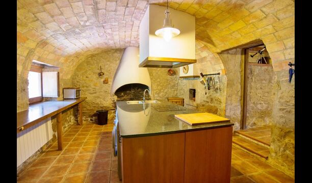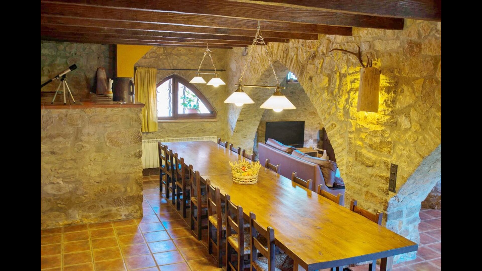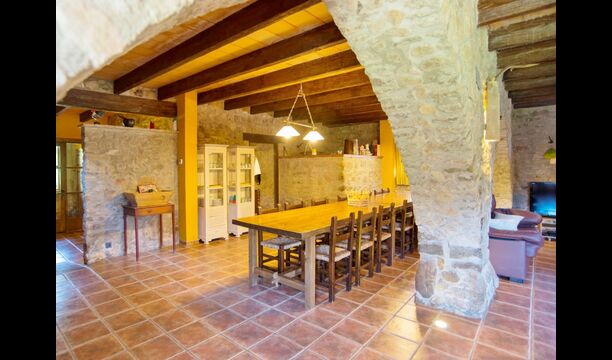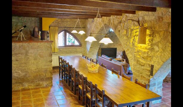 Le rez-de-chaussée est un immense espace commun, où il y aura de la place pour tout le groupe de vacances, même pour ceux qui vivent dans des appartements plus petits. Voici une longue table à manger, canapés, TV et DVD et cheminée. La cuisine est unique avec un plafond incurvé et de beaux murs en pierre.