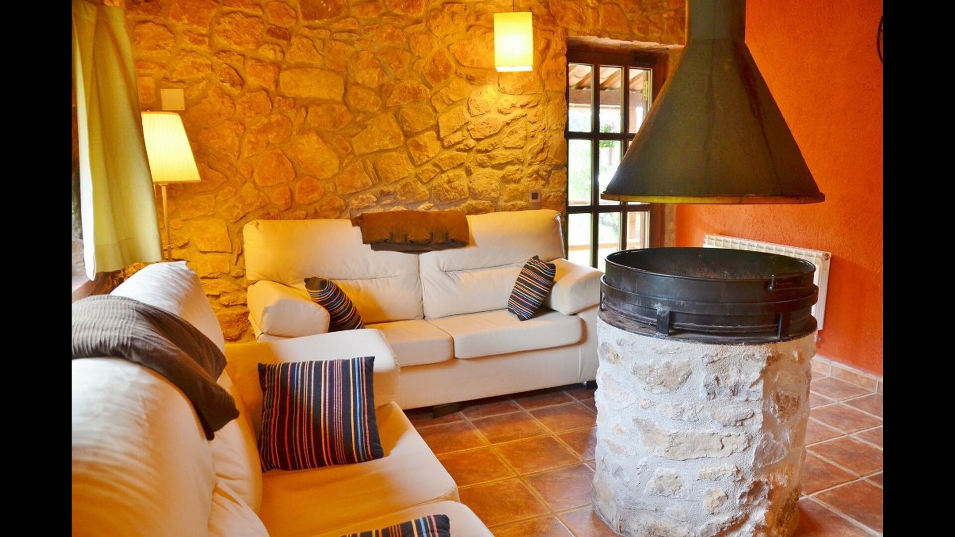 Spacieuse salle commune avec coin salon, cheminée, télévision, DVD et table à manger. De là, il y a un accès à une cuisine moderne et bien équipée. Mini terrasse extérieure et table à manger.