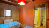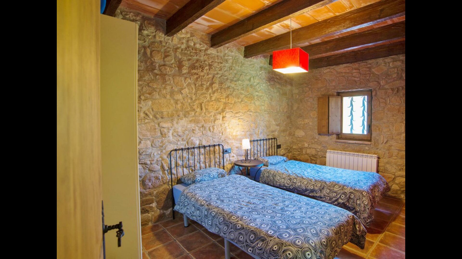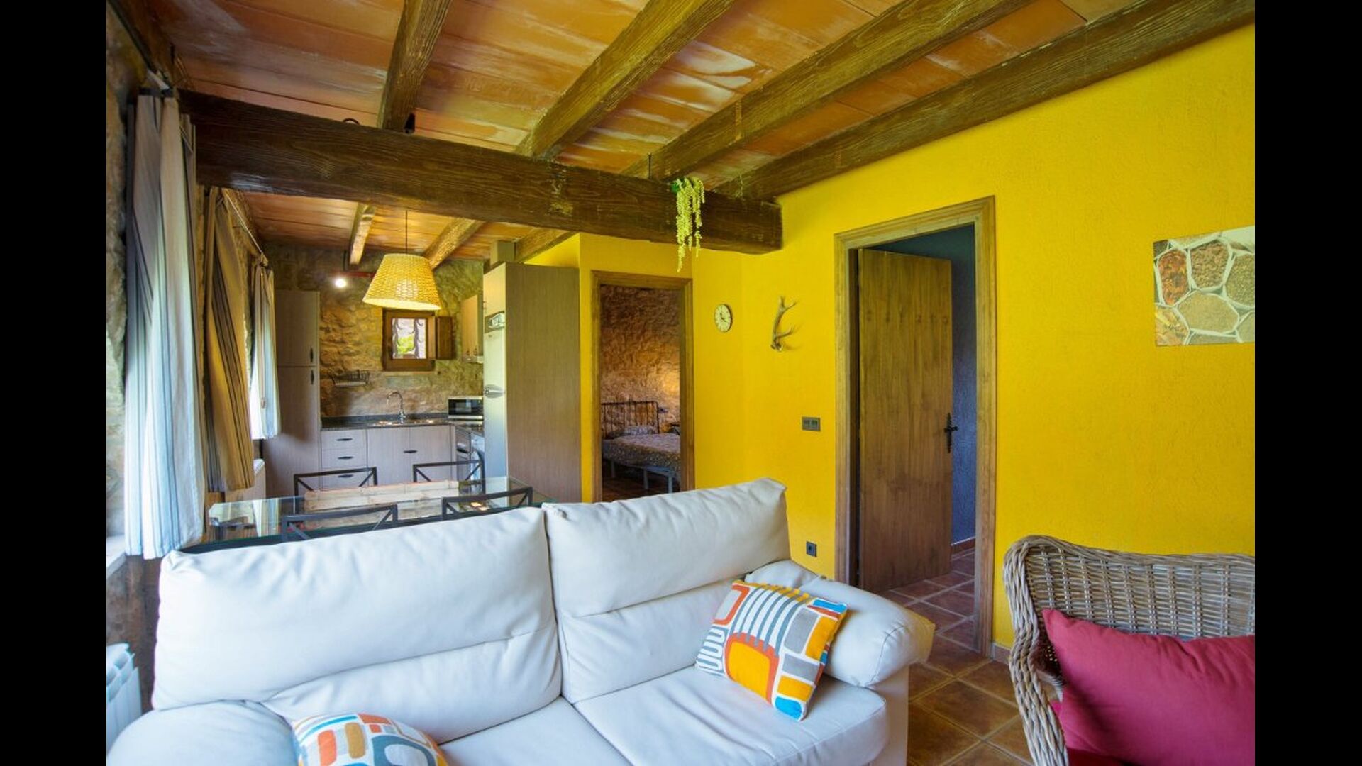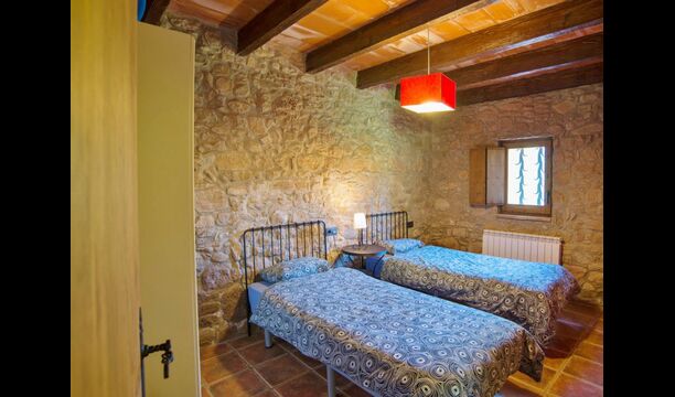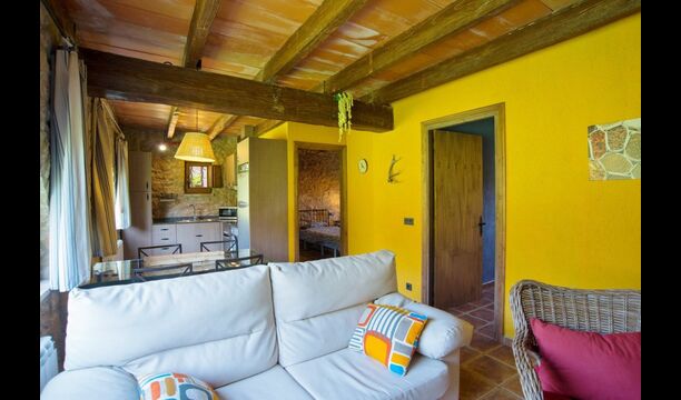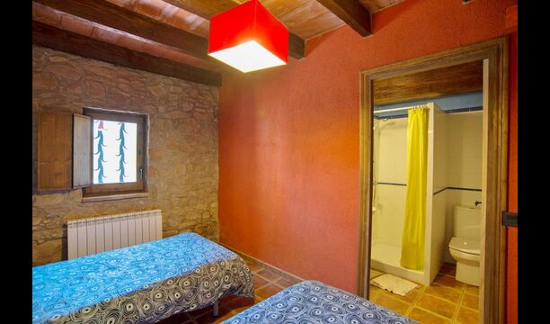 This apartment of 70 m2, Can de Pirineus - Era 4 + 2P, are closest to the pool and is located in the lower floor with another apartment upstairs. With two double bedrooms with one double bed and two single beds, it is perfect for the family. There is a combined living room and kitchen, which means that the whole family can be together at the same time. The ceiling is beautifully constructed with beams and the walls are made of stone, which together provides an authentic feel of a Catalan farmhouse.