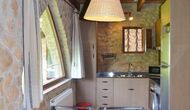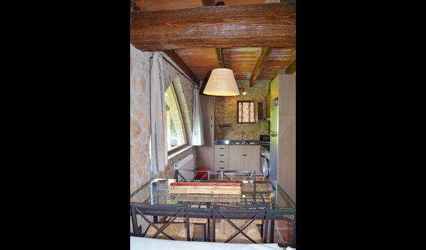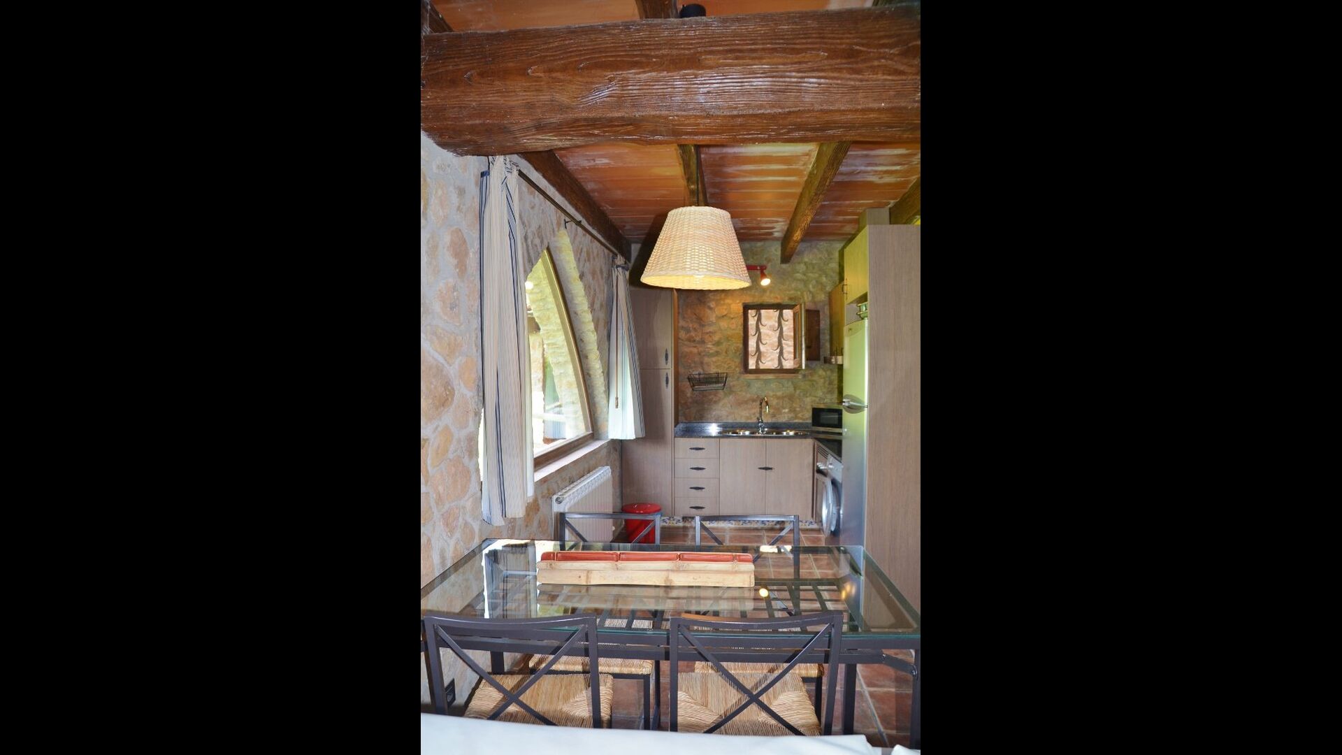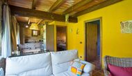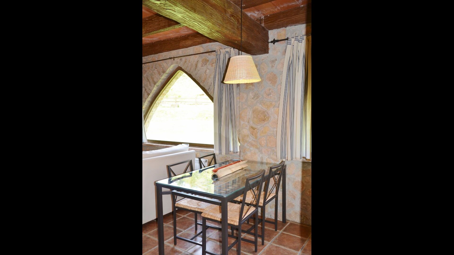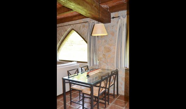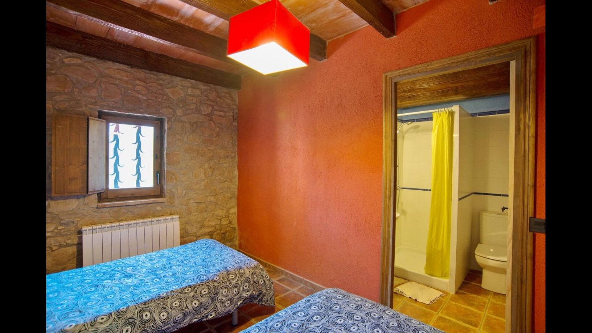 This apartment of 70 m2, Can de Pirineus - Era 4 + 2P, are closest to the pool and is located in the lower floor with another apartment upstairs. With two double bedrooms with one double bed and two single beds, it is perfect for the family. There is a combined living room and kitchen, which means that the whole family can be together at the same time. The ceiling is beautifully constructed with beams and the walls are made of stone, which together provides an authentic feel of a Catalan farmhouse.