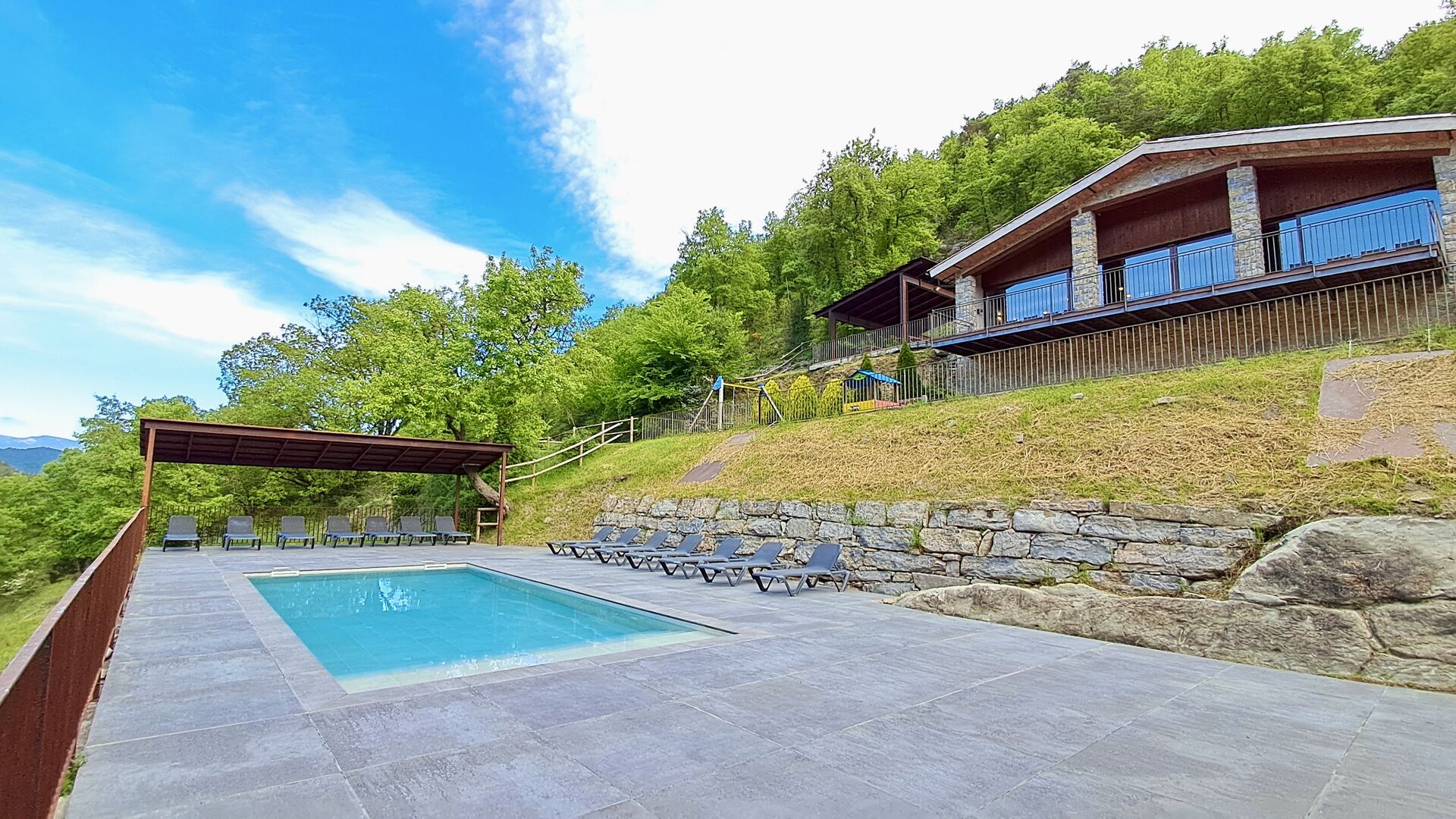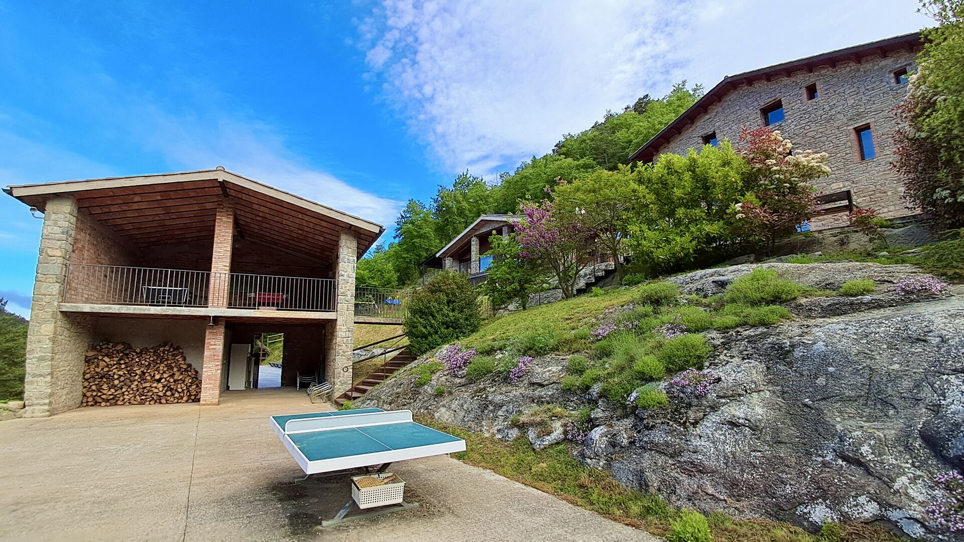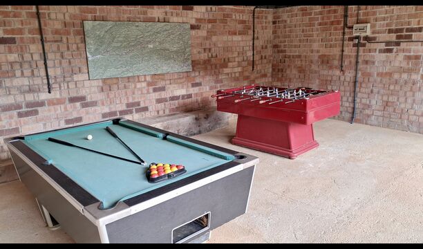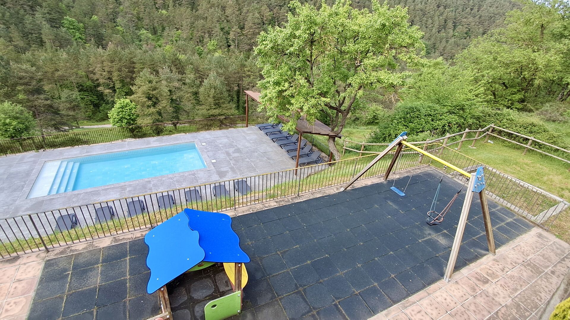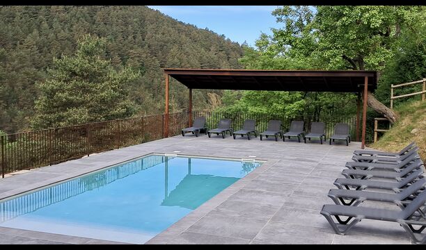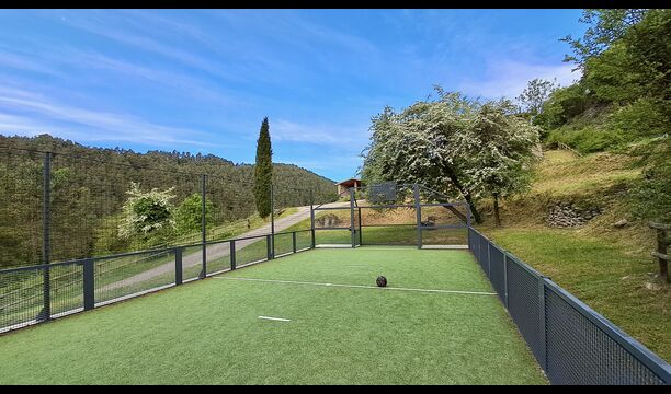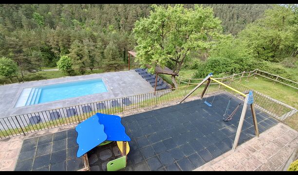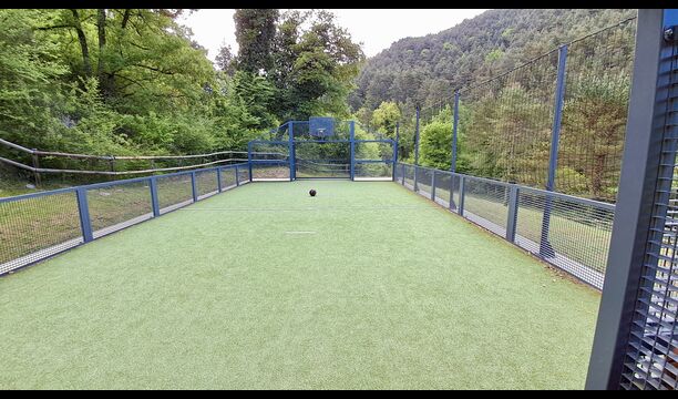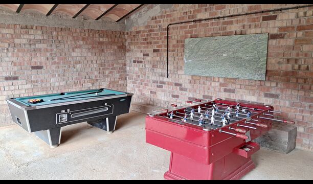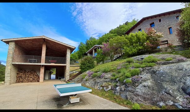 Les espaces extérieurs de La Beumela sont conçus pour être appréciés en toutes saisons. Les hôtes peuvent se détendre sur la terrasse panoramique ensoleillée, prendre leurs repas dans le coin barbecue avec tables extérieures ou se rafraîchir dans la piscine extérieure privée. Pour se divertir, une zone de jeux couverte avec baby-foot et billard est disponible, ainsi qu’une aire de jeux pour enfants avec balançoires, bac à sable et maisonnette. Un petit terrain multisports et un espace de pétanque sont également à disposition.