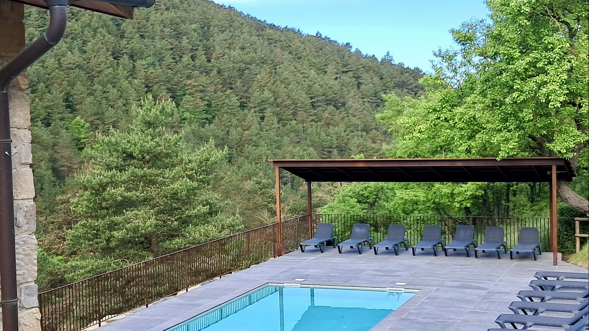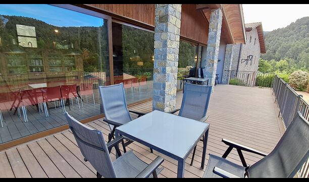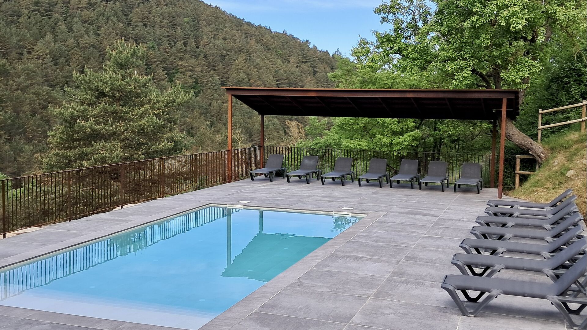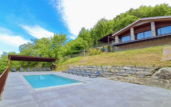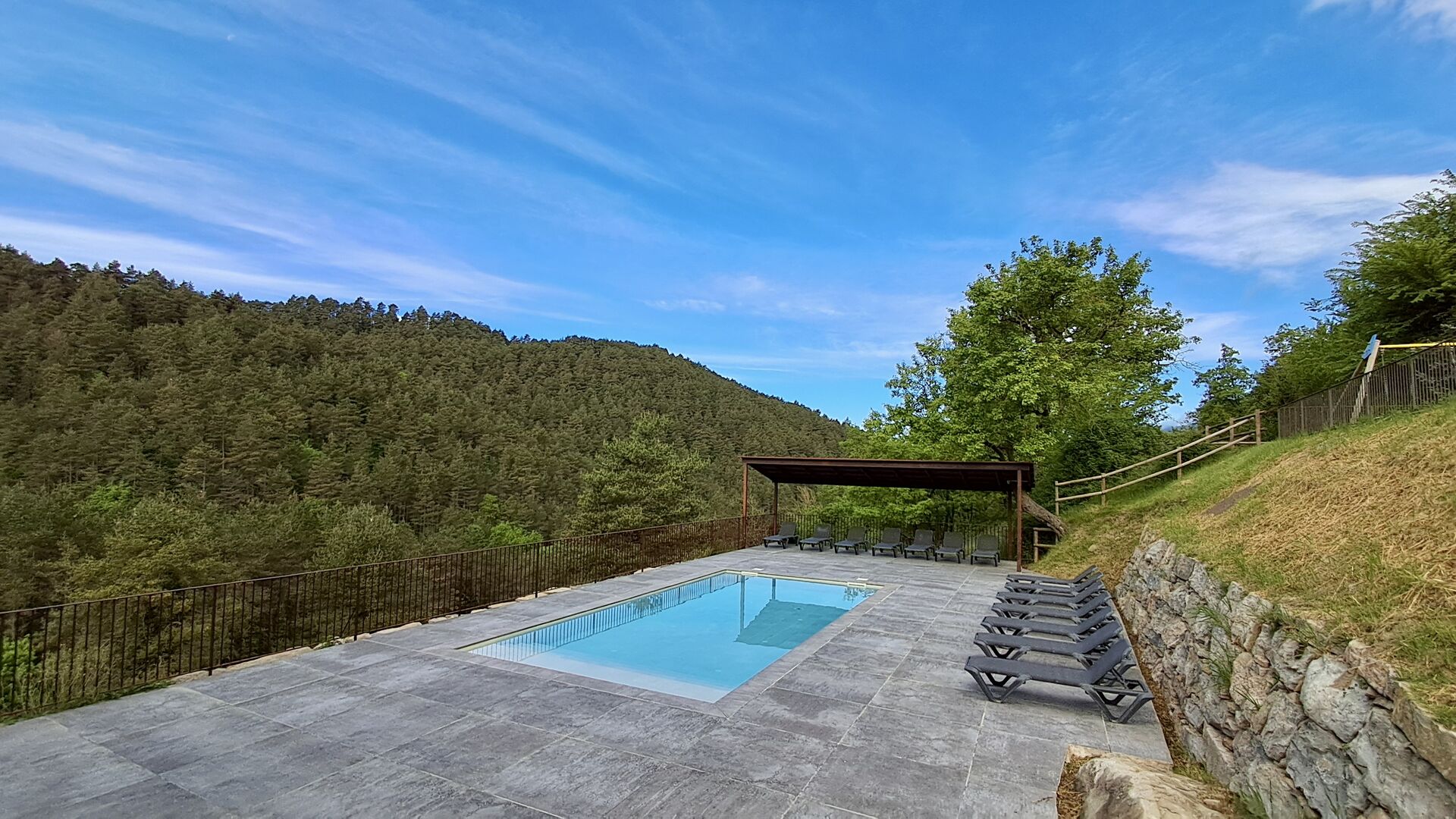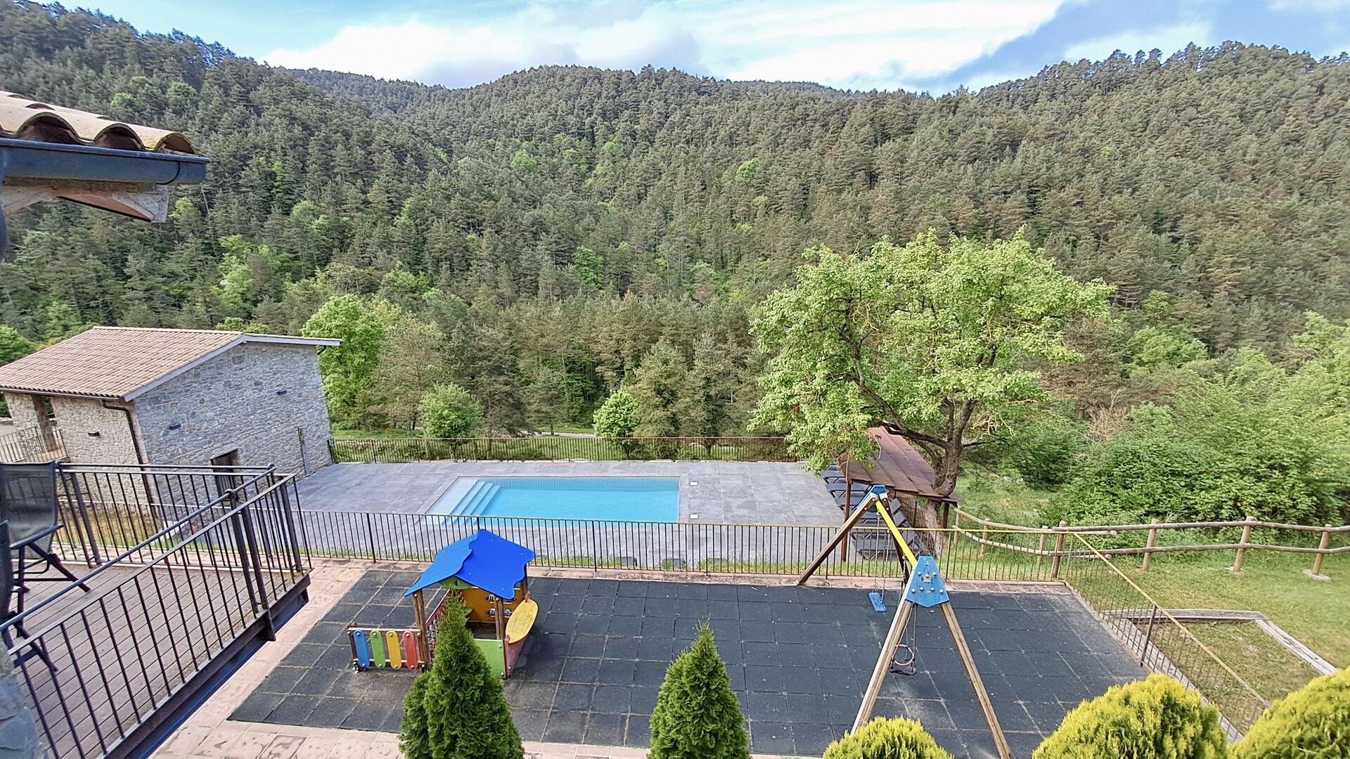 Les espaces extérieurs de La Beumela sont conçus pour être appréciés en toutes saisons. Les hôtes peuvent se détendre sur la terrasse panoramique ensoleillée, prendre leurs repas dans le coin barbecue avec tables extérieures ou se rafraîchir dans la piscine extérieure privée. Pour se divertir, une zone de jeux couverte avec baby-foot et billard est disponible, ainsi qu’une aire de jeux pour enfants avec balançoires, bac à sable et maisonnette. Un petit terrain multisports et un espace de pétanque sont également à disposition.