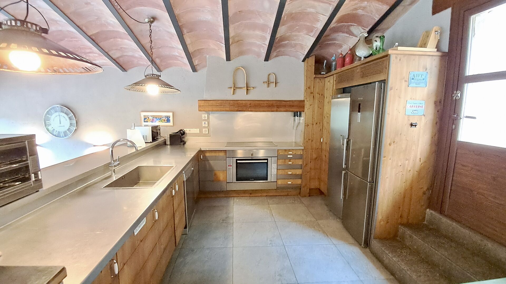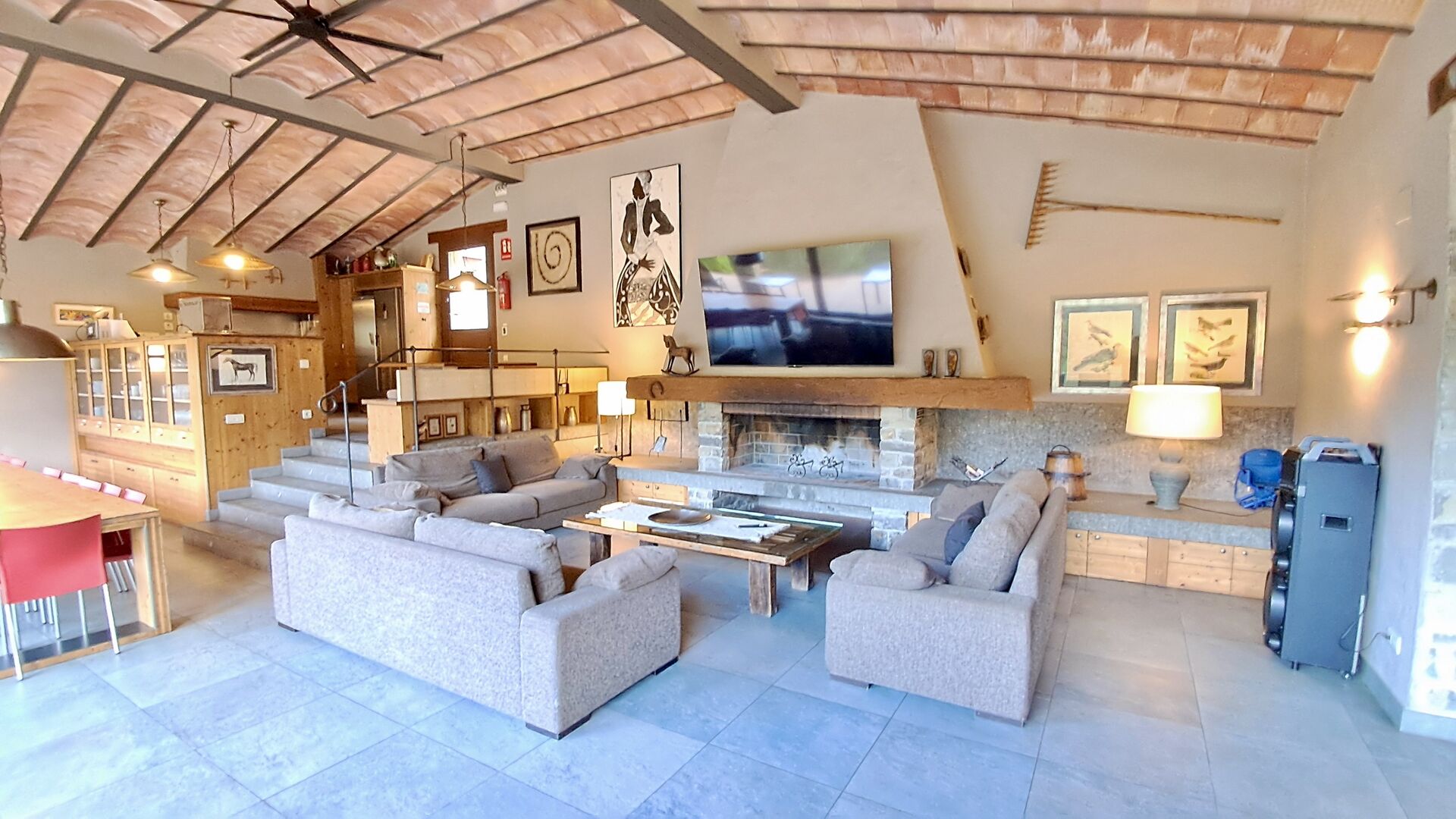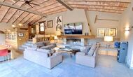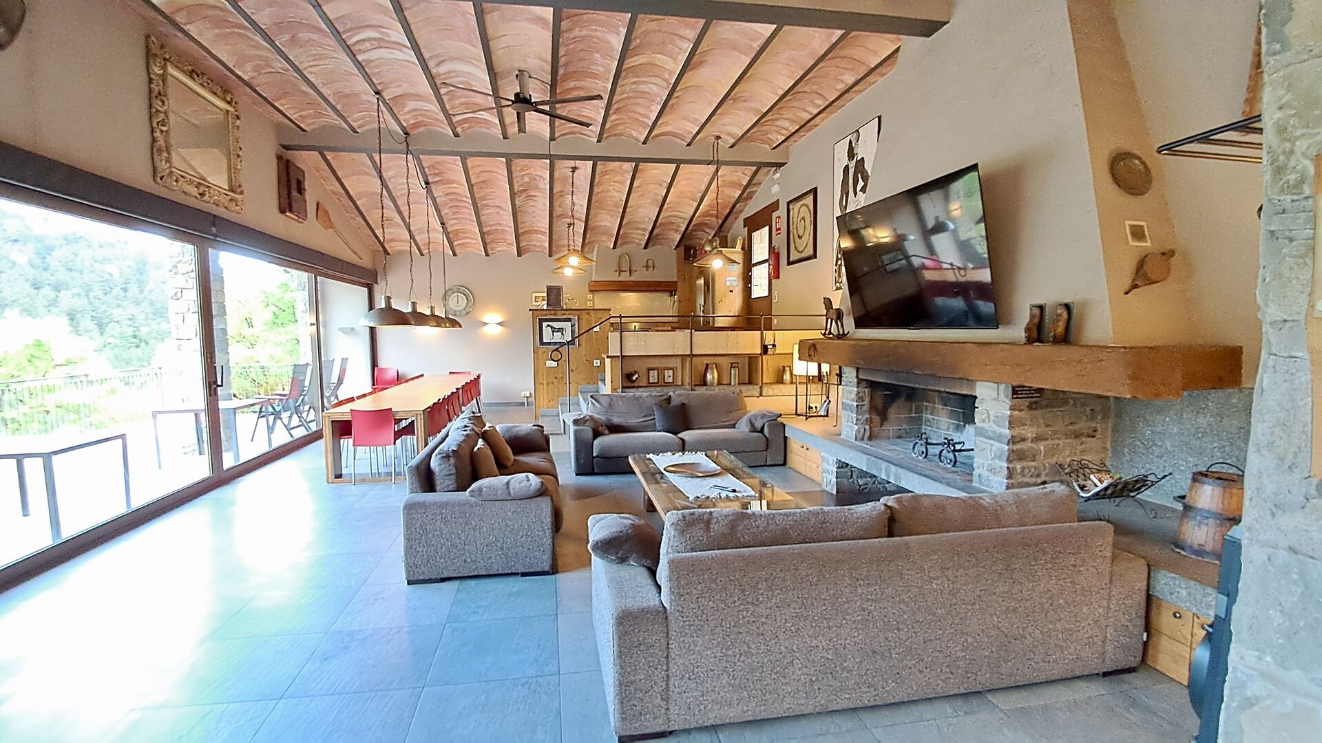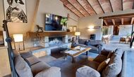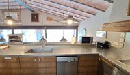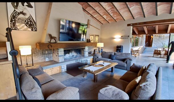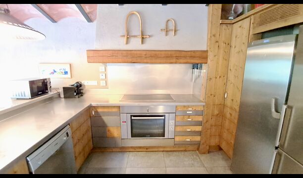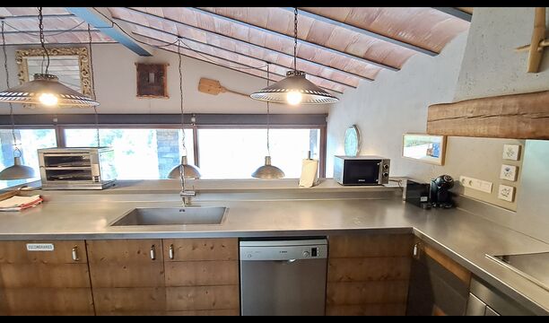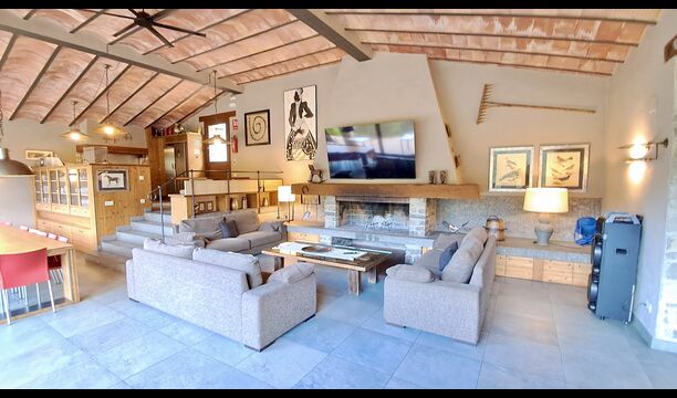 Dans la zone de vie, vous trouverez un vaste salon et une salle à manger avec cheminée et accès direct à une grande terrasse ensoleillée. Le salon comprend une télévision à écran plat de 63 pouces et bénéficie d’une belle luminosité. La cuisine entièrement équipée comprend : réfrigérateur, micro-ondes, four, plaque à induction, machine à café Nespresso, lave-vaisselle et tout le nécessaire de cuisine.