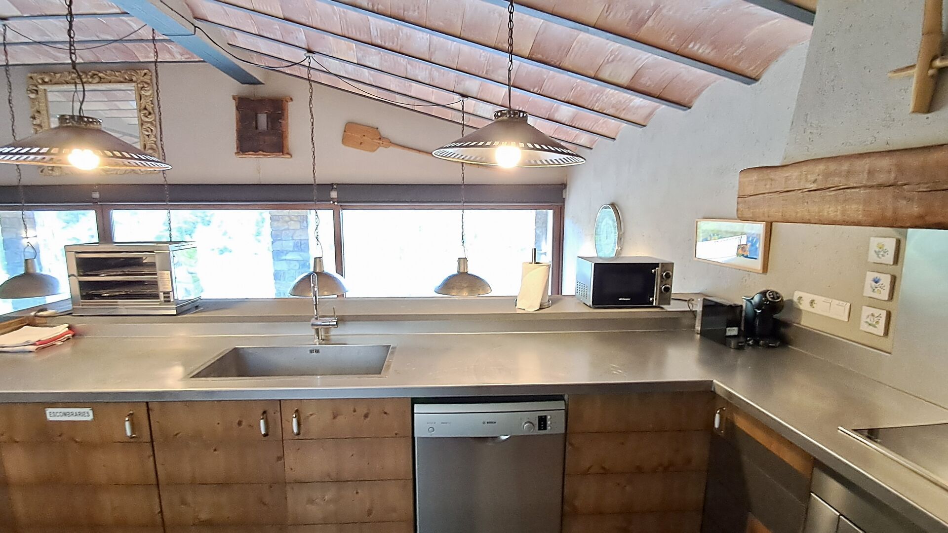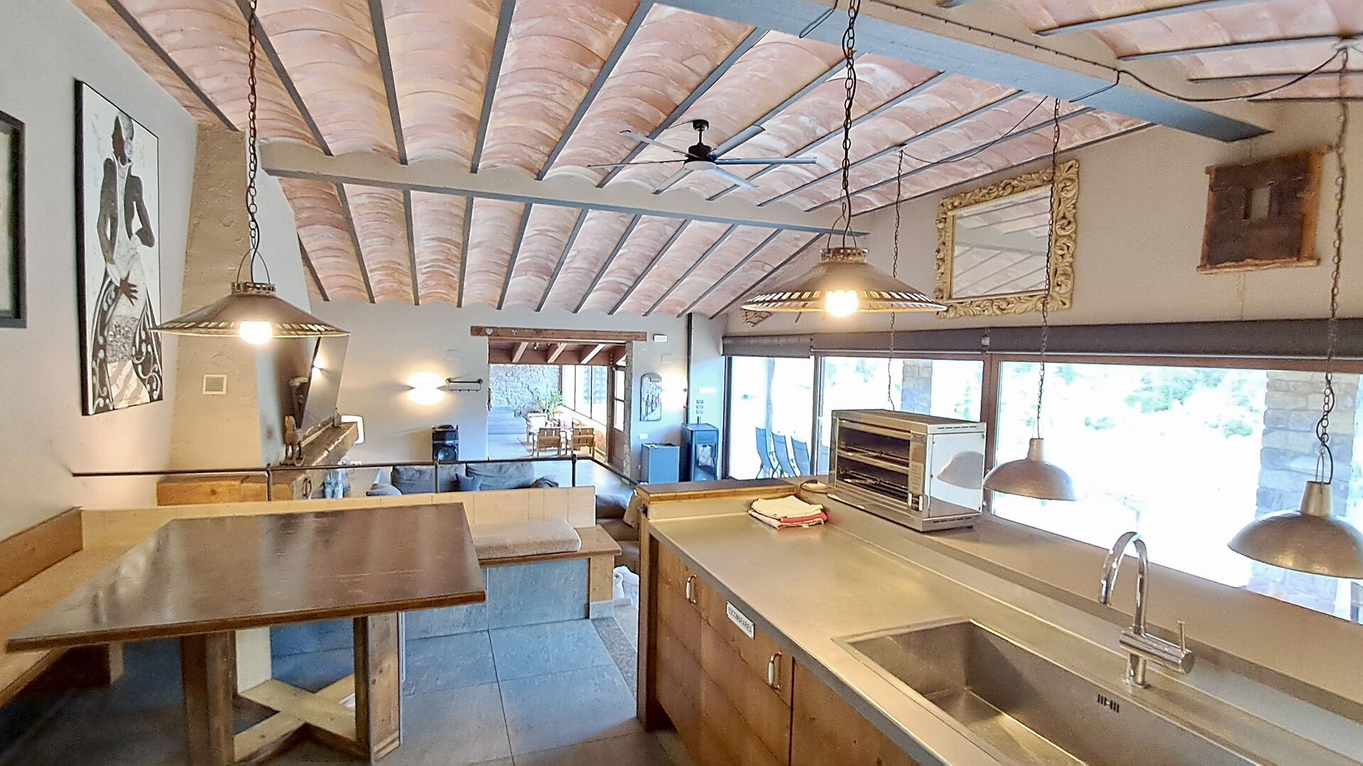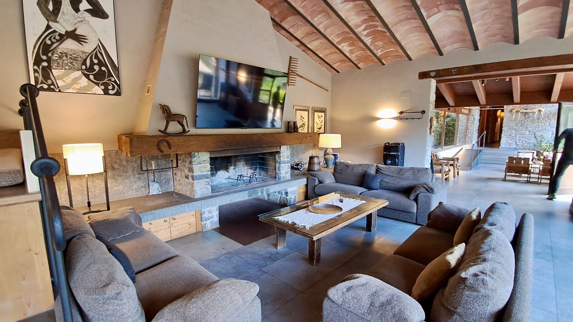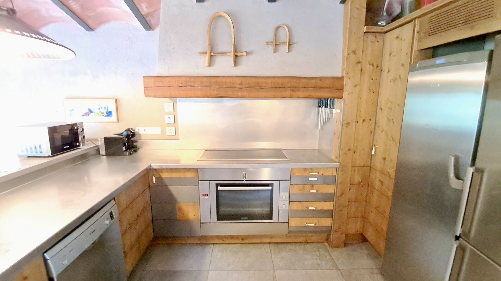 Dans la zone de vie, vous trouverez un vaste salon et une salle à manger avec cheminée et accès direct à une grande terrasse ensoleillée. Le salon comprend une télévision à écran plat de 63 pouces et bénéficie d’une belle luminosité. La cuisine entièrement équipée comprend : réfrigérateur, micro-ondes, four, plaque à induction, machine à café Nespresso, lave-vaisselle et tout le nécessaire de cuisine.