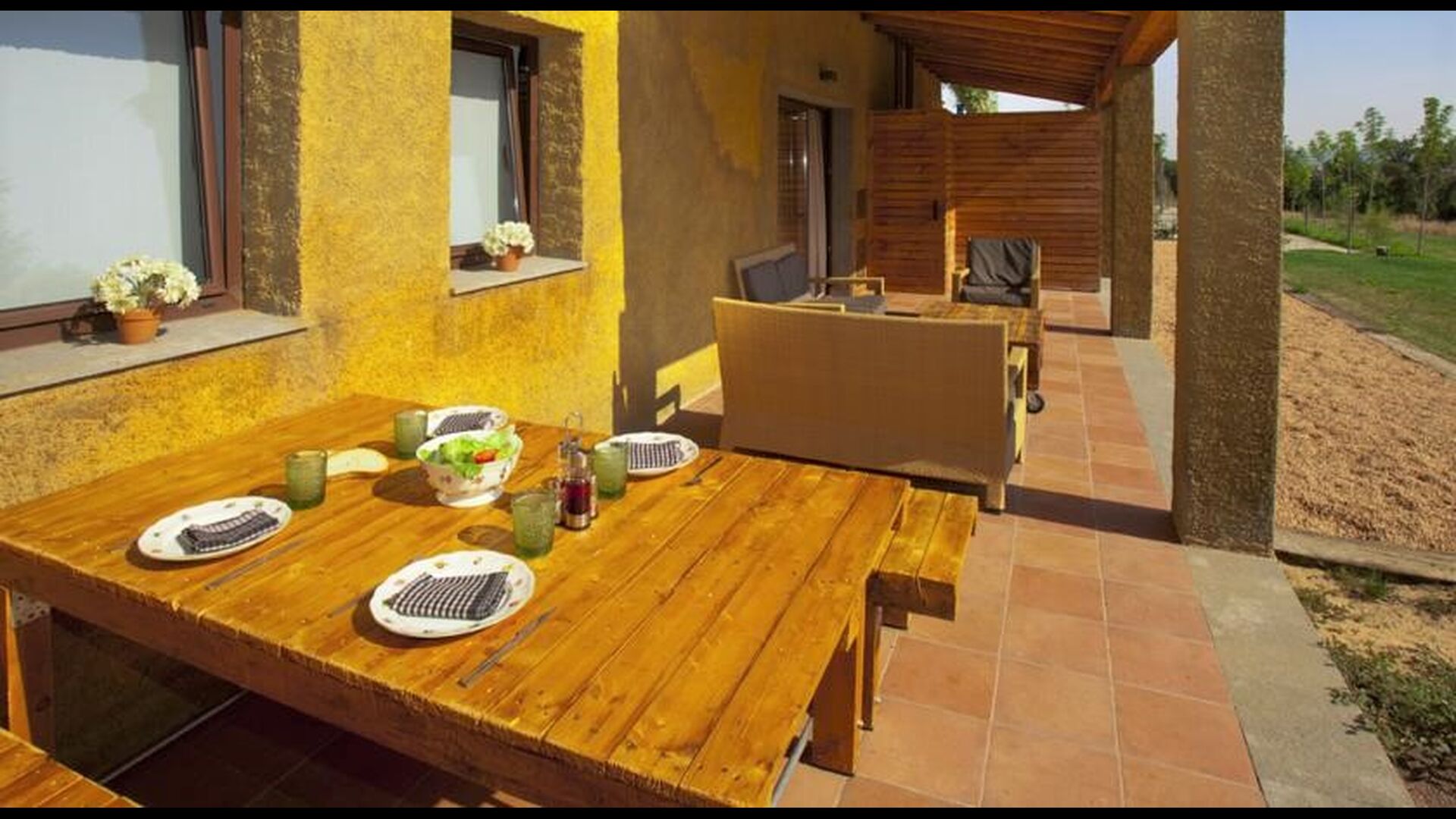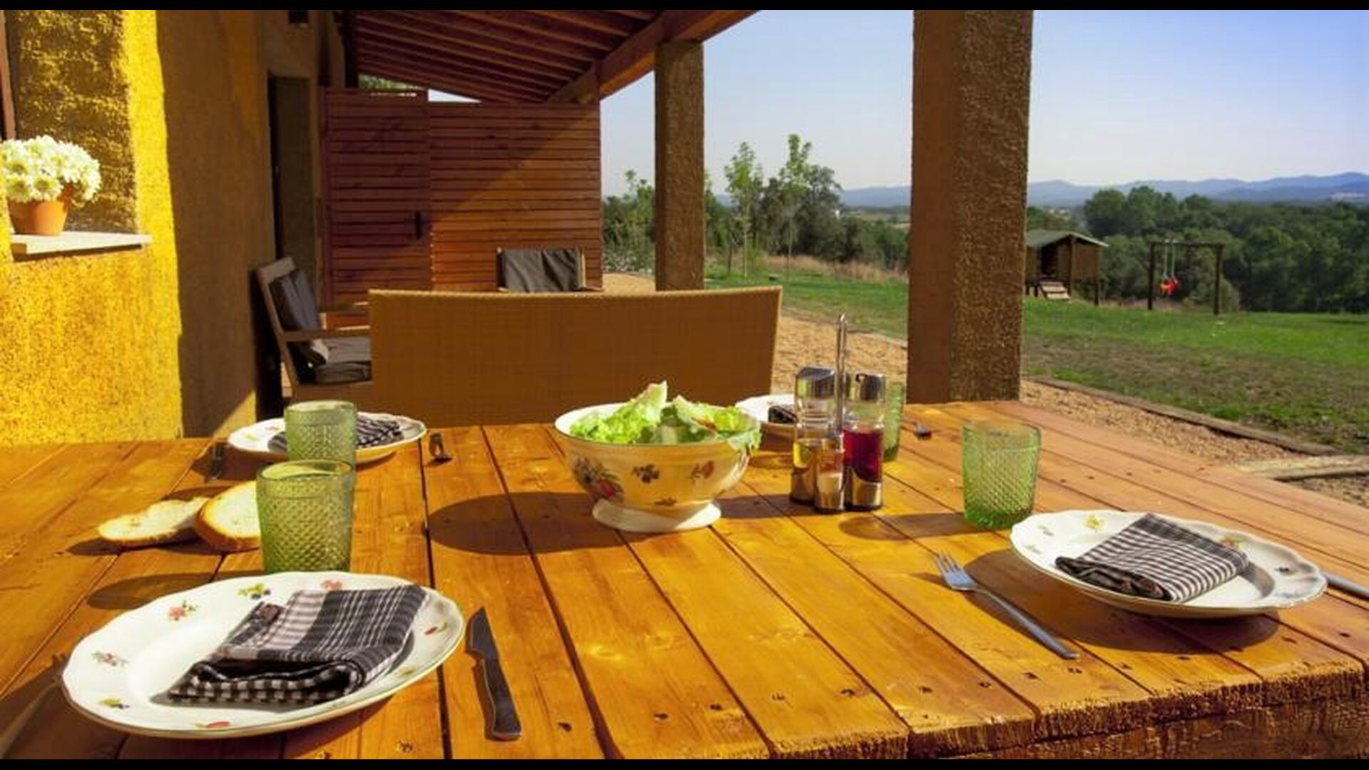 As you walk through the huge garden, you will find the fenced, luxurious pool area. Besides the large 12x6 pool with varying depths that is shared with the other two apartments, there are various lounge chairs, tables, shade areas etc., so the stage is set for optimal relaxation in the lovely Catalan sun with the option of taking a dip in the refreshing pool at any given time. The garden also offers several shaded areas with seating areas, where you are always able to find a place in the beautiful, natural surroundings to read a book or whatever. There is furthermore a playground in the garden for the smaller ones in the holiday group, so they also can have fun and entertain themselves.