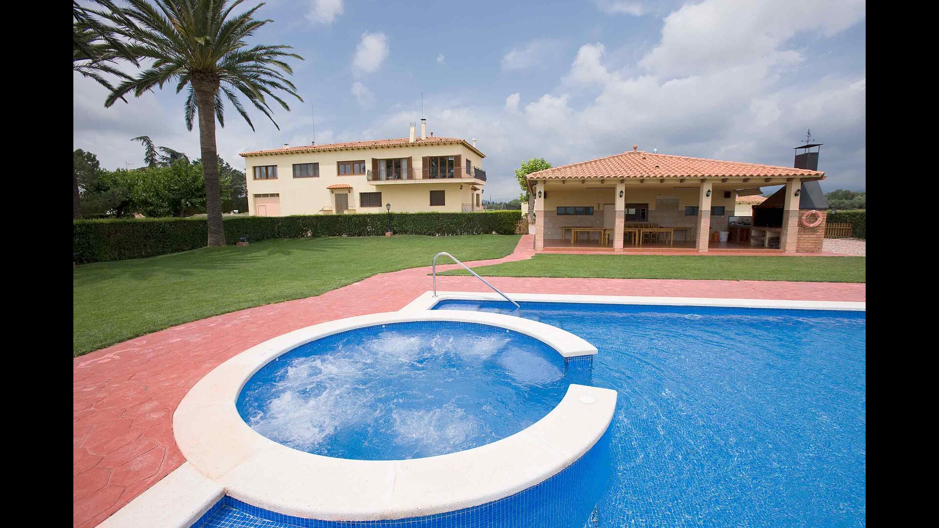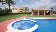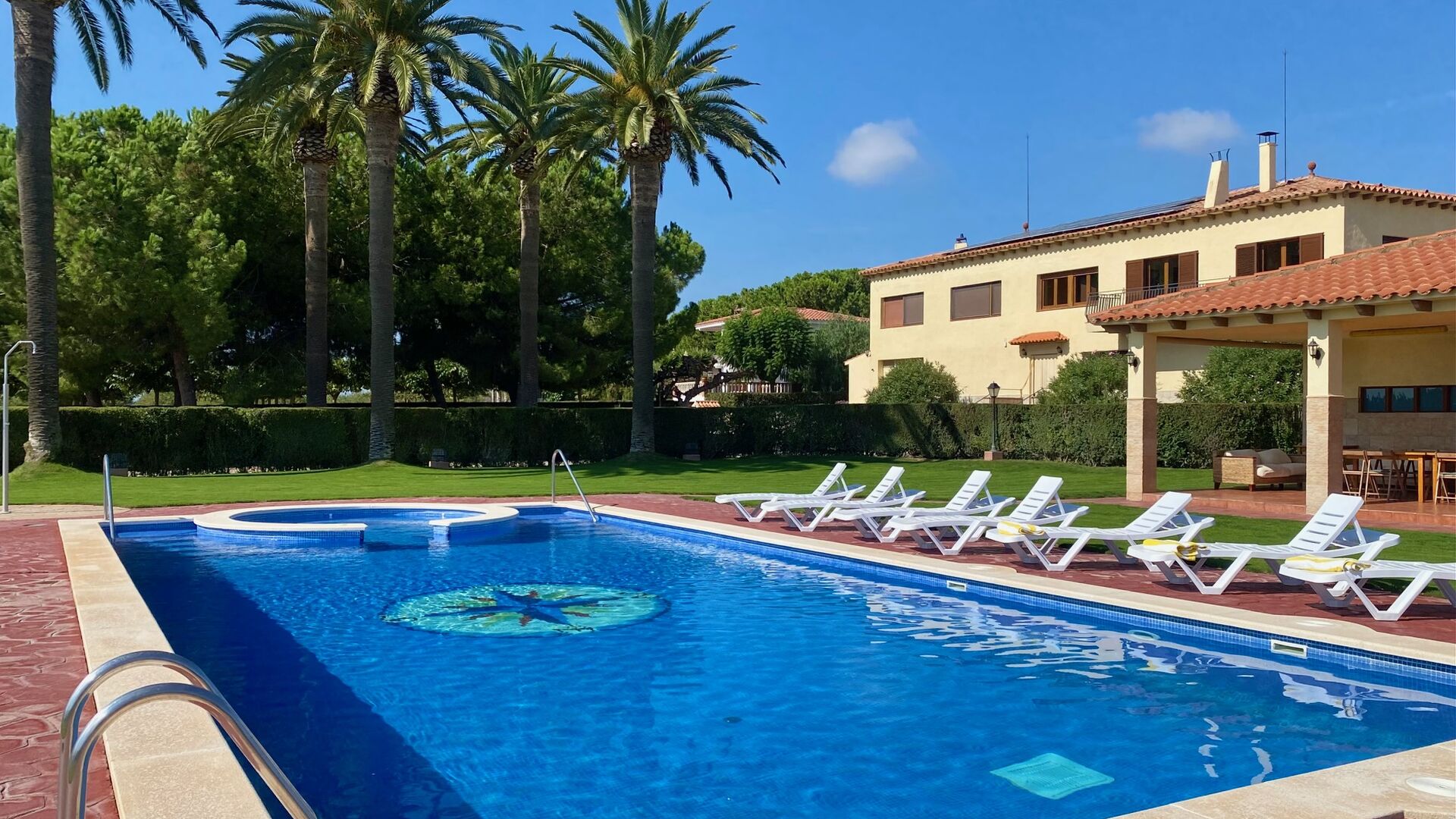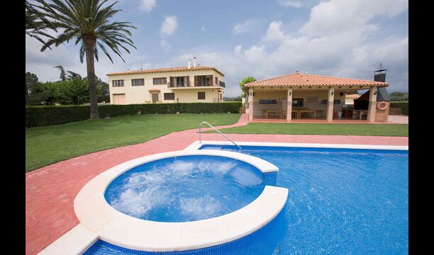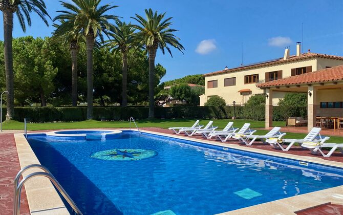 Le lieu de rencontre naturel de la propriété est le très grand espace piscine clôturé autour de la grande piscine. La piscine mesure 12 x 6 mètres et dispose même d'un spa intégré. Un escalier romain dans la partie peu profonde est également disponible, idéal pour les jeunes enfants. L'espace piscine dispose d'une grande pelouse luxuriante, où vous pourrez vous détendre sur le tapis d'herbe bien entretenu, partiellement ombragé par les palmiers. Dix chaises longues confortables sont également à votre disposition pour vous détendre et profiter du soleil catalan.